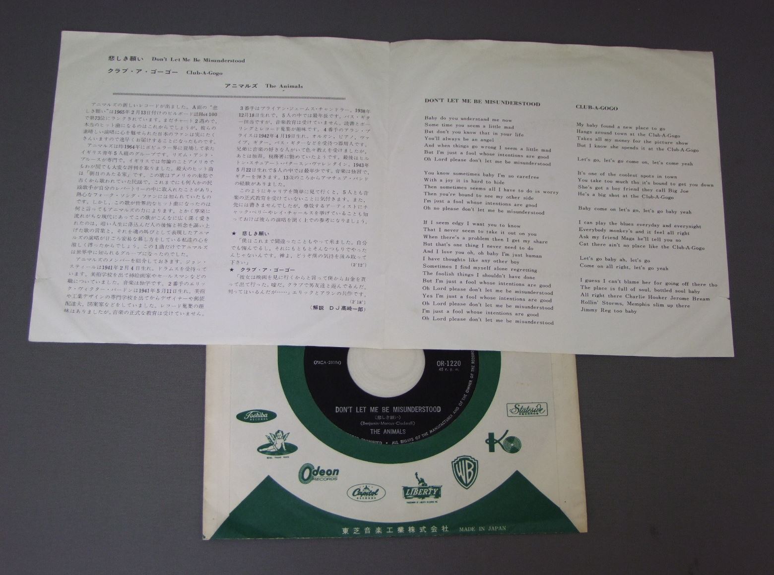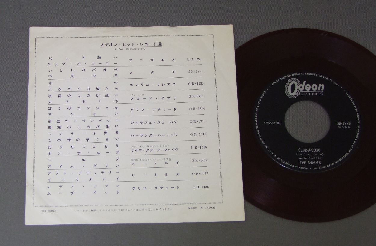 ANIMALSアニマルズ/DON`T LET ME BE MISUNDERSTOOD悲しき願い 赤盤 OR1220 製造国:日本盤 / Media:7inch外観:EX-盤の状態:EX- 価格(税込):¥880 送料 7inch:定形外郵便 360円~LP:定形外郵便 660円~送料は、注文の最終画面で確認頂けます。 > > ANIMALS/DON`T LET ME BE MISUNDERSTOOD 外観 (EX-)特記事項:ヨレ多少有り。表ジャケ右ヘリに短い切れ有り。外観EX-の共通説明:ダメージ軽度~多少。 中古品としては普通の状態。シミ、ヨゴレ、スレなど軽く~多少。 盤の状態 (EX-)特記事項:薄いスリキズ・細かい表面スレ多少ある感じ。殆どが軽微なものの様子です。盤EX-の共通説明:盤面のスリキズが多少有り。音に出そうなものは殆ど無いように見える~さほど気にならないぐらいの軽いプチ数カ所程度。 Tweet それぞれの画像をクリックすると、大きい写真が見られます こちらの商品もお勧めです 2,640円 SPOTNICKSスプートニクス / KARELIA-THE BEST OF THE SPOTNICKS霧のカレリア-ベスト・オブ・ザ・スプートニクス 4,950円 ANIMALSアニマルズ / BEST ALBUM アニマルズのすべて 赤盤