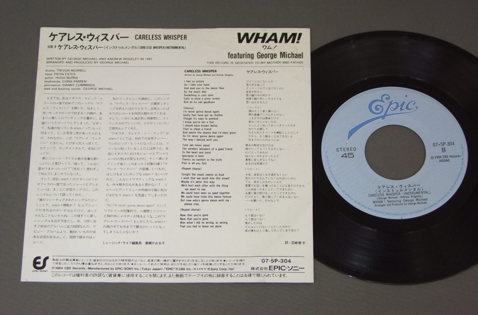 WHAM!ワム!/CARELESS WHISPERケアレス・ウィスパー 07 5P 304 製造国:日本盤 / Media:7inch外観:EX盤の状態:EX+ 価格(税込):¥1,332(売約済) 送料 7inch:定形外郵便 360円~LP:定形外郵便 660円~送料は、注文の最終画面で確認頂けます。 > > WHAM!/CARELESS WHISPER 外観 (EX)特記事項:特記なし。コンディションリストを参照ください。外観EXの共通説明:ダメージが限定的。中古品としては保存状態がよい方。シミ、ヨゴレ、スレ 少し~軽度。 盤の状態 (EX+)特記事項:極薄いスリキズ・スレ少し。一見してきれいな状態です。盤EX+の共通説明:盤面の極薄いスリキズ、スレ少し程度 音に出そうなものは無いように見える(極軽微なソフトティック音は除く)。 Tweet それぞれの画像をクリックすると、大きい写真が見られます こちらの商品もお勧めです 1,210円 GO WESTゴー・ウェスト / MORE BANGS & CRASHESモア・バン ! アンド・クラッシュ ! 1,210円 OXOオクソ / 1st ALBUMオクソ 1,320円 QUARTERFLASHクウォーターフラッシュ / QUARTERFLASHミッドナイト・フラッシュ 550円 HUNG CHUNGワン・チャン / HUNG CHUNGダンス・ホール・デイズ 440円 WILD BLUEワイルド・ブルー / NO MORE JINXノー・モア・ジンクス 440円 BELLE STARSベル・スターズ / BELLE STARSベル・スターズ 440円 TEN TENテン・テン / WALK ONウォーク・オン 770円 CHEAP TRICKチープ・トリック / HEAVEN TONIGHT天国の罠(トリック)