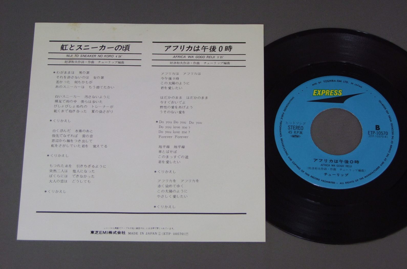 KAZUO ZAITSUチューリップ/NIJI TO SNEAKER NO KORO虹とスニーカーの頃 ETP10570 製造国:日本盤 / Media:7inch外観:EX盤の状態:EX+ 価格(税込):¥440(売約済) 送料 7inch:定形外郵便 360円~LP:定形外郵便 660円~送料は、注文の最終画面で確認頂けます。 > > KAZUO ZAITSU/NIJI TO SNEAKER NO KORO 外観 (EX)特記事項:裏側に薄いシミ外観EXの共通説明:ダメージが限定的。中古品としては保存状態がよい方。シミ、ヨゴレ、スレ 少し~軽度。 盤の状態 (EX+)特記事項:極薄いスリキズ・スレ少し。一見してきれいな状態です。盤EX+の共通説明:盤面の極薄いスリキズ、スレ少し程度 音に出そうなものは無いように見える(極軽微なソフトティック音は除く)。 Tweet それぞれの画像をクリックすると、大きい写真が見られます こちらの商品もお勧めです 660円 MAYUMI ITSUWA五輪真弓 / L`ETRANGERえとらんぜ 770円 CANDIESキャンディーズ / CANDIESキャンディーズ 990円 YOMI MATSUTOYA - TSUYOSHI NAGABUCHI etc長渕剛 ユ−ミン他 / TOSHIBA EMI PROMO ONLY東芝EMI総合試聴版 660円 TAKAKO SHIRAI白井貴子 / PASCAL 1,320円 KEIKO SAITO斉藤慶子 / KEIKO MONO OMOI慶子、もの想い 990円 EIKICHI YAZAWA矢沢永吉 / LIVE KORAKUEN STADIUMLIVE後楽園スタジアム 770円 YUMI MATSUTOYA松任谷由実 / ALARM A LAMODEアラーム・ア・ラ・モード 1,320円 FUKINOTOふきのとう / SAIJIKI歳時記