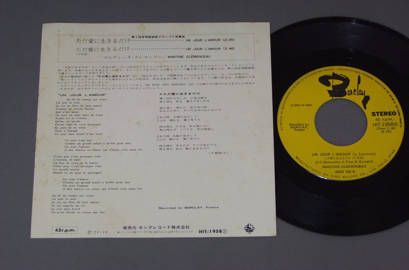 MARTINE CLEMENCEAUマルティーヌ・クレマンソー/UN JOUR L`AMOURただ愛に生きるだけ HIT1958 製造国:日本盤 / Media:7inch外観:VG+盤の状態:EX 価格(税込):¥440(売約済) 送料 7inch:定形外郵便 360円~LP:定形外郵便 660円~送料は、注文の最終画面で確認頂けます。 > > MARTINE CLEMENCEAU/UN JOUR L`AMOUR 外観 (VG+)特記事項:裏側にシミ。外観VG+の共通説明:ダメージやや有り。シミ、ヨゴレ、スレなど多少~やや多め。 盤の状態 (EX)特記事項:薄いスリキズ・スレ軽くある感じ。一見してきれいな印象です。盤EXの共通説明:盤面のスリキズが薄いものが少し~軽度 音に出そうなものは無いように見える(軽微なソフトティック音は除く)。 その他:第2回世界歌謡祭グランプリ Tweet それぞれの画像をクリックすると、大きい写真が見られます こちらの商品もお勧めです 1,980円 ELEN FOLEYエレン・フォーリー / SPIRIT OF ST LOUIS悲しみのシアター 770円 MELISSA MANCHESTERメリサ・マンチェスター / MELISSA想い出にさようなら 770円 CORA VAUCAIREコラ・ヴォーケール / COMPLAINTE DE LA BUTTEモンマルトルの丘 660円 EVAエバ / SOUS LES SUNLIGHTSリリー・マルレーンに捧げて 1,210円 AMALIA RODRIGUESアマリア・ロドリゲス / GOSTAVA DE SER QUEM ERA私の中のファド 440円 MARILYN MARTINマリリン・マーティン / MARILYN MARTINマリリン・マーティン 770円 MERINA MERCOURIメリナ・メルクーリ / MERINA MERCOURIギリシャへの郷愁 770円 YVETTE GIRAUDイベット・ジロー / ADIEU JAPONアデュー・ジャポン