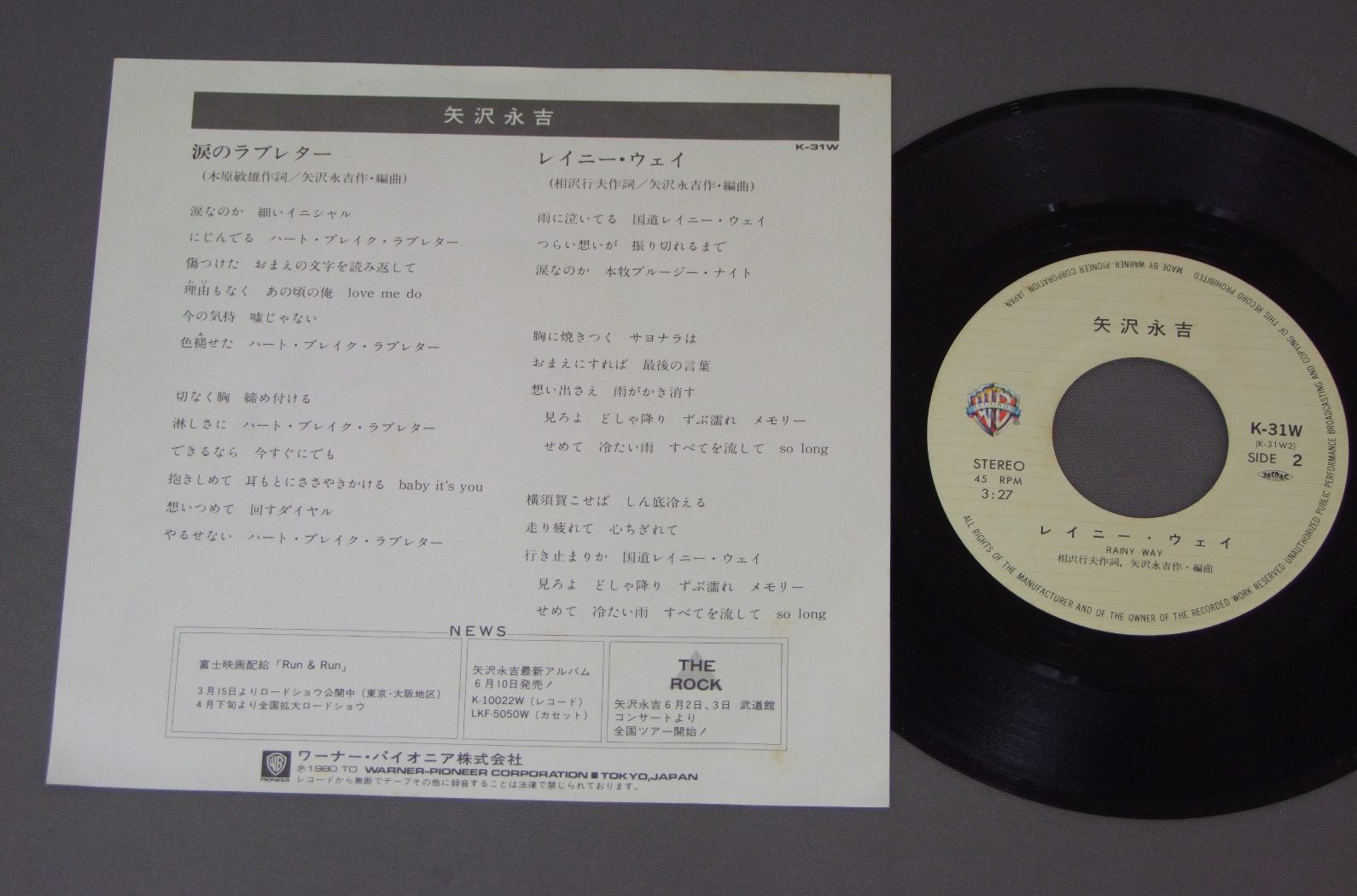 E.YAZAWA矢沢永吉/NAMIDA NO LOVE LETTER涙のラブレター K31W 製造国:日本盤 / Media:7inch外観:EX盤の状態:EX 価格(税込):¥330(売約済) 送料 7inch:定形外郵便 360円~LP:定形外郵便 660円~送料は、注文の最終画面で確認頂けます。 > > E.YAZAWA/NAMIDA NO LOVE LETTER 外観 (EX)特記事項:裏側にシミが少々。外観EXの共通説明:ダメージが限定的。中古品としては保存状態がよい方。シミ、ヨゴレ、スレ 少し~軽度。 盤の状態 (EX)特記事項:薄いスリキズ・スレ軽くある感じ。一見してきれいな印象です。盤EXの共通説明:盤面のスリキズが薄いものが少し~軽度 音に出そうなものは無いように見える(軽微なソフトティック音は除く)。 Tweet それぞれの画像をクリックすると、大きい写真が見られます こちらの商品もお勧めです 770円 KEIKO OCHIAI落合恵子 / OSHABERINA ATTICおしゃべりな屋根裏部屋 550円 CHERISHチェリッシュ / SPRING ROMANCE春のロマンス 770円 CHAGE & ASUKAチャゲ&飛鳥 / CHAGE & ASUKA 421世紀 770円 I SEONG-AE季成愛 / SAYONARAさよなら - 演歌の源流を探る 1,210円 EIKICHI YAZAWA矢沢永吉 / RISING SUNライジング・サン 1,210円 MACHIKO WATANABE渡辺真知子 / MEMORIESメモリ−ズ 990円 YUKO TOMITAとみたゆう子 / COLOURSカラーズ (1st ALBUM) 1,870円 TAKURO YOSHIDAよしだたくろう / ON STAGEオン・ステージ ともだち