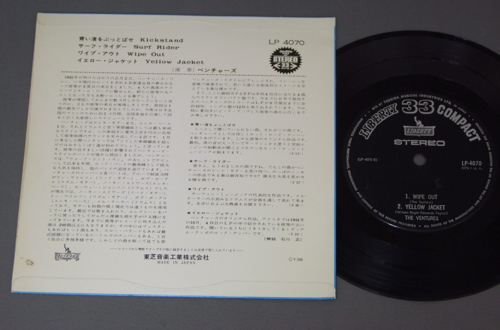 VENTURESベンチャーズ/KICKSTAND EP青い渚をぶっとばせ 4曲入 LP4070 製造国:日本盤 / Media:7inch外観:EX-盤の状態:EX- 価格(税込):¥440 送料 7inch:定形外郵便 360円~LP:定形外郵便 660円~送料は、注文の最終画面で確認頂けます。 > > VENTURES/KICKSTAND EP 外観 (EX-)特記事項:表裏共にレコード取り出し口付近にシミが少々・外観EX-の共通説明:ダメージ軽度~多少。 中古品としては普通の状態。シミ、ヨゴレ、スレなど軽く~多少。 盤の状態 (EX-)特記事項:薄いスリキズ・細かい表面スレ多少ある感じ。殆どが軽微なものの様子です。盤EX-の共通説明:盤面のスリキズが多少有り。音に出そうなものは殆ど無いように見える~さほど気にならないぐらいの軽いプチ数カ所程度。 Tweet それぞれの画像をクリックすると、大きい写真が見られます こちらの商品もお勧めです 1,320円 VENTURESベンチャーズ / VENTURES A GO GOベンチャーズ・ア・ゴー・ゴー 1,210円 VENTURES / BEST OF THE VENTURES vol.2 RED VINYL赤盤 990円 RICK NELSONリック・ネルソン / ALBUM SEVEN BY RICKアルバム・セブン・バイ・リック 1,210円 EVERLY BROTHERSエヴァリー・ブラザース / DATE WITH EVERY BROTHERSデイト・ウィズ・エヴァリー・ブラザーズ 880円 ELVISエルヴィス・プレスリー / THAT`S THE WAY IT ISこの胸のときめきを/映画「エルヴィス・オン・ステージ」主題歌集 990円 ELVISエルヴィス / THIS IS ELVIS-SELECTIONS FROM THE ORIGINAL MOTION PICUTRE SOUNDTRACK映画 THIS IS ELVIS オリジナル・サウンドトラック 990円 VENTURESベンチャーズ / ROOK`N`ROLL GRAFFITIロックン・ロール・グラフィティ 990円 VENTURESベンチャーズ / ON STAGE ENCOREオン・ステージ・アンコール