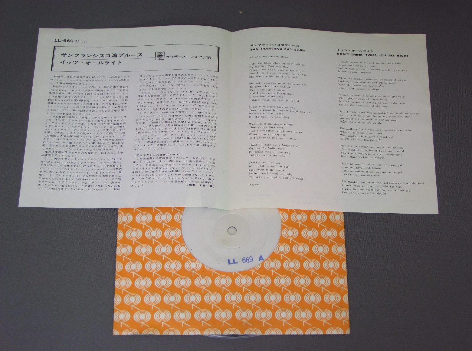 BROTHERS FOURブラザース・フォア/SAN FRANCISCO BAY BLUES EPサンフランシスコ湾ブルース4曲入EP LL669C 製造国:日本盤 / Media:7inch外観:EX盤の状態:EX+ 価格(税込):¥440(売約済) 送料 7inch:定形外郵便 360円~LP:定形外郵便 660円~送料は、注文の最終画面で確認頂けます。 > > BROTHERS FOUR/SAN FRANCISCO BAY BLUES EP 外観 (EX)特記事項:特記なし。コンディションリストを参照ください。外観EXの共通説明:ダメージが限定的。中古品としては保存状態がよい方。シミ、ヨゴレ、スレ 少し~軽度。 盤の状態 (EX+)特記事項:極薄いスリキズ・スレ少し。一見してきれいな状態です。盤EX+の共通説明:盤面の極薄いスリキズ、スレ少し程度 音に出そうなものは無いように見える(極軽微なソフトティック音は除く)。 その他:白見本盤 Tweet それぞれの画像をクリックすると、大きい写真が見られます こちらの商品もお勧めです 770円 BROTHERS FOURブラザース・フォア / HONEY WIND BLOWSビッグ・フォーク・ヒッツ 第3集 770円 NITTY GRITTY DIRT BANDニッティー・グリッティー・ダート・バンド / UNCLE CHARLIE & HIS DOG TEDDYアンクル・チャーリーと愛犬テディー 660円 JOAN BAEZジョーン・バエズ / JOAN自由の女神 990円 KITTY WELLSキティ・ウェルズ / DUST ON THE BIBLEダスト・オン・ザ・バイブル 770円 NITTY GRITTY DIRT BANDニッティー・グリッティー・ダート・バンド / STARS&STRIPES FOREVER星条旗よ永遠なれ! 1,320円 JOAN BAEZジョーン・バエズ / GULF WINDSガルフ・ウィンズ 990円 PETER PAUL & MARYピーター・ポール&マリー / IN CONCERT 770円 PETER PAUL&MARYピーター・ポール&マリー / LATE AGAINレイト・アゲイン