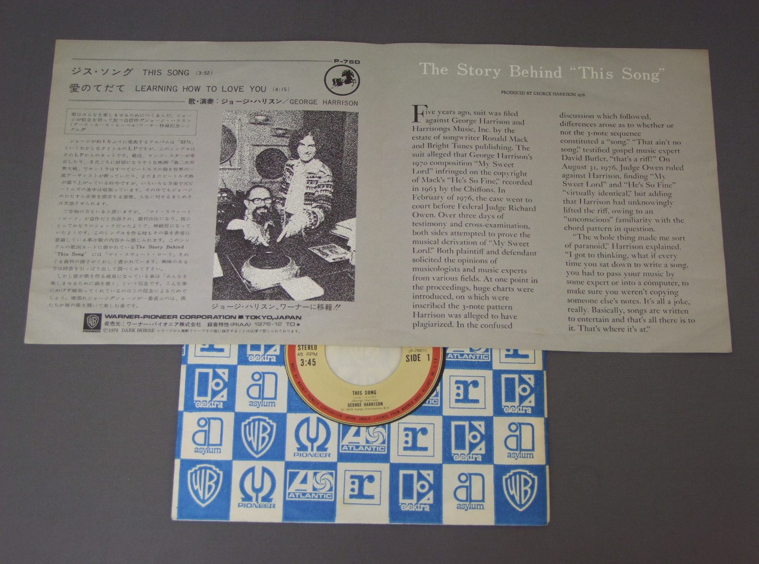 GEORGE HARRISONジョージ・ハリスン/THIS SONGジス・ソング P75D 製造国:日本盤 / Media:7inch外観:EX-盤の状態:EX 価格(税込):¥1,100(売約済) 送料 7inch:定形外郵便 360円~LP:定形外郵便 660円~送料は、注文の最終画面で確認頂けます。 > > GEORGE HARRISON/THIS SONG 外観 (EX-)特記事項:裏ジャケ側にシミが少し。ヨレ多少有り。外観EX-の共通説明:ダメージ軽度~多少。 中古品としては普通の状態。シミ、ヨゴレ、スレなど軽く~多少。 盤の状態 (EX)特記事項:薄いスリキズ・スレ軽くある感じ。殆どが軽微なものの様子です。盤EXの共通説明:盤面のスリキズが薄いものが少し~軽度 音に出そうなものは無いように見える(軽微なソフトティック音は除く)。 Tweet それぞれの画像をクリックすると、大きい写真が見られます こちらの商品もお勧めです 770円 PAUL MCCARTNEY & WINGSポール・マッカートニー & ウイングス / WINGS AT THE SPEED OF SOUNDスピード・オヴ・サウンド 1,320円 WINGSウイングス / WINGS OVER AMERICAウイングス U.S.A.ライヴ!! 770円 JOHN LENNONジョン・レノン / PLASTIC ONO BANDプラスティック・オノ・バンド 770円 PAUL MCCARTNEY&WINGSポール・マッカートニー&ウイングス / BAND ON THE RUNバンド・オン・ザ・ラン 1,650円 WINGSウィングス / OVER AMERICAUSAライブ 1,540円 WINGSポール・マッカートニーとウイングス / LONDON TOWN 770円 WINGSポール・マッカートニー&ウイングス / VENUS AND MARSヴィーナス・アンド・マース 1,210円 WINGSウィングス / VENUS & MARSヴィーナス・アンド・マース