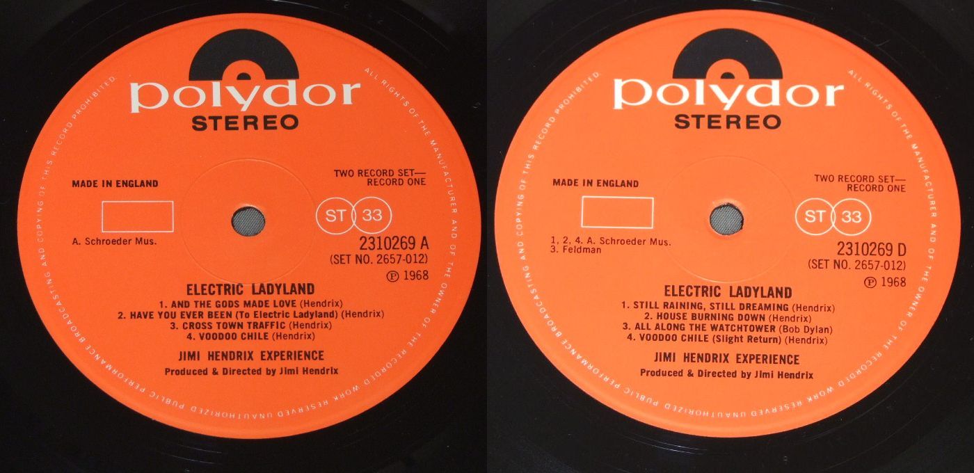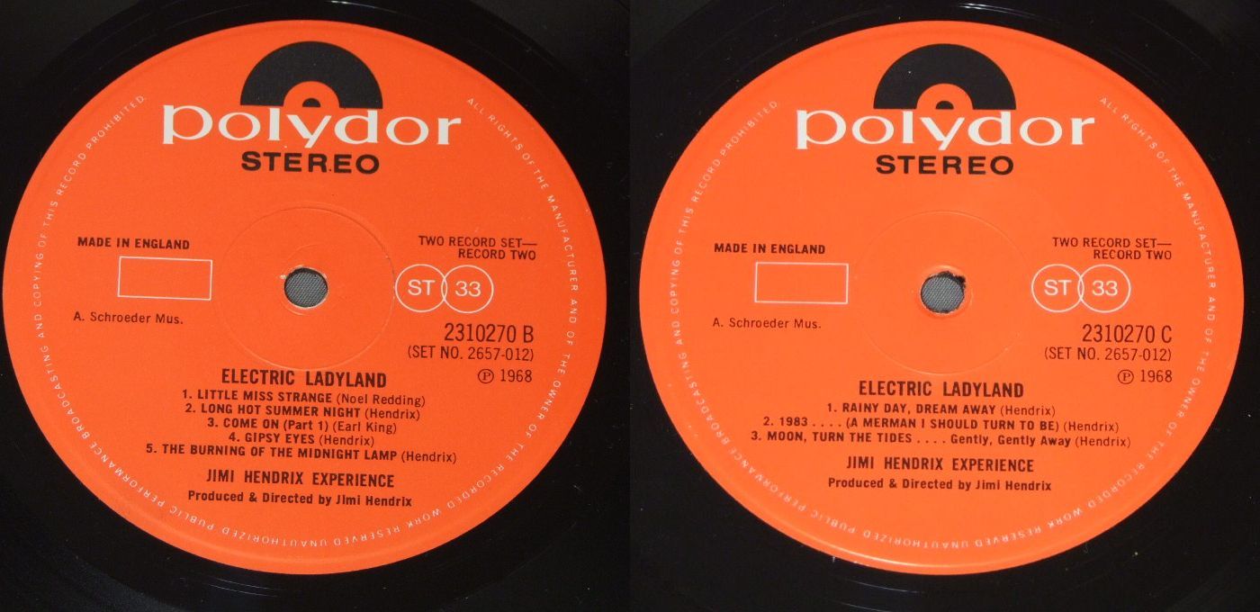 JIMI HENDRIX/ELECTRIC LADYLANDPOLYDOR盤 2310269/70 製造国:英国盤 / Media:LPMatrix:A面 A//2 |D面 B//1 |B面 A▽2 |C面 B//2外観:EX+盤の状態:EX+ 価格(税込):¥11,000(売約済) 送料 7inch:定形外郵便 360円~LP:定形外郵便 660円~送料は、注文の最終画面で確認頂けます。 > > JIMI HENDRIX/ELECTRIC LADYLAND 外観 (EX+)特記事項:表ジャケのレコード取り出し口下角でヨレが少々。ジャケ表面は見開きも含めて厚手のコーティング仕様。全体的にスレやスリキズ等は薄い感じ。コーティングのヨレシワはあまり有りません。外観EX+の共通説明:中古としては美品、一見してきれいでダメージが軽微。シミ、ヨゴレ、スレ有っても僅か~少し。 盤の状態 (EX+)特記事項:2枚とも極薄いスリキズ・スレ少しある程度。音に出そうなものもなく一見してきれいな状態です。曲間など、静かなところを中心に聴いて見ましたが、チリノイズ少ないきれいな再生具合でした。盤EX+の共通説明:盤面の極薄いスリキズ、スレ少し程度 音に出そうなものは無いように見える(極軽微なソフトティック音は除く)。 Tweet それぞれの画像をクリックすると、大きい写真が見られます こちらの商品もお勧めです 4,400円 JIMI HENDRIX / MIDNIGHT LIGHTNING