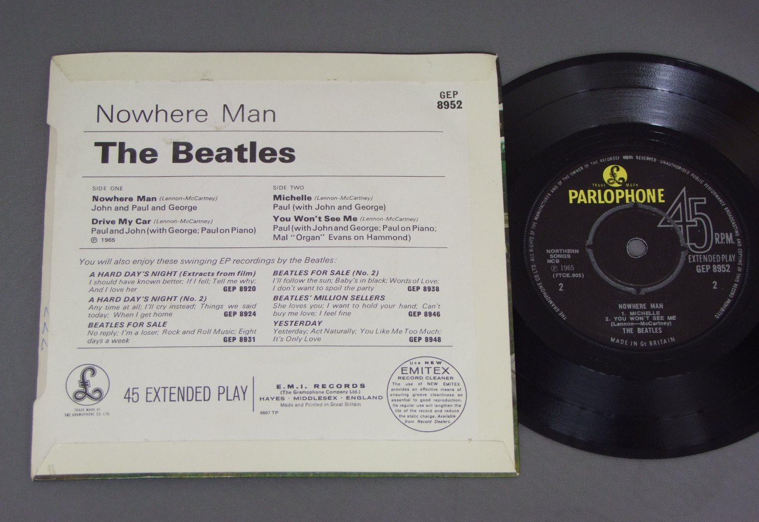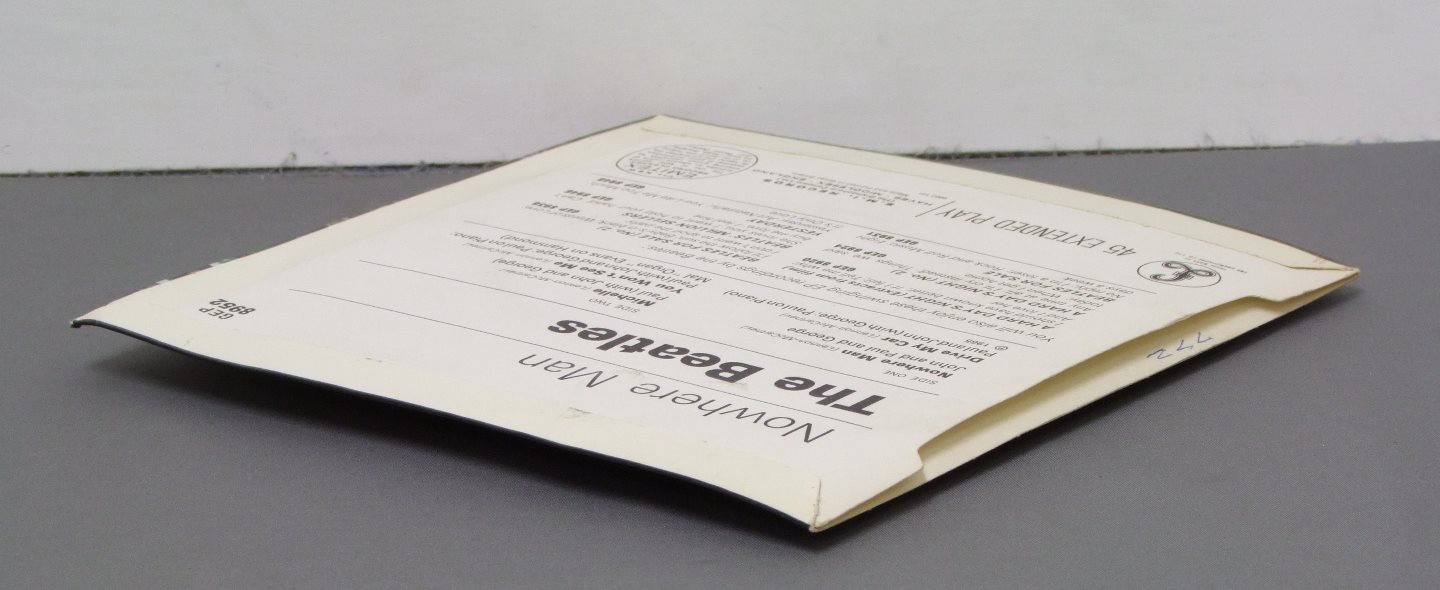 BEATLES/NOWHERE MAN EP 2nd LBL GEP8952 製造国:英国盤 / Media:7inchMatrix: -1/4/GT | -1/6/RO外観:EX+盤の状態:EX 価格(税込):¥11,000(売約済) 送料 7inch:定形外郵便 360円~LP:定形外郵便 660円~送料は、注文の最終画面で確認頂けます。 > > BEATLES/NOWHERE MAN EP 2nd LBL 外観 (EX+)特記事項:表ジャケはレーベル縁のリング跡が多少出ていますが、全体的にスレやスリキズ、コーティングのヨレシワは少ない感じ。レコード取り出し口側が少し上に反った感じ。裏ジャケもよごれ等は少ない感じ。外観EX+の共通説明:中古としては美品、一見してきれいでダメージが軽微。シミ、ヨゴレ、スレ有っても僅か~少し。 盤の状態 (EX)特記事項:薄いスリキズ・スレ少しある程度。音に出そうなものもなく一見してきれいな状態です。曲間など、静かなところを中心にMONO針で聴いて見ましたが、チリノイズ少ないきれいな再生具合でした。盤EXの共通説明:盤面のスリキズが薄いものが少し~軽度 音に出そうなものは無いように見える(軽微なソフトティック音は除く)。 その他:レーベルにSOLD IN UKの無いセカンド・レーベル。 Tweet それぞれの画像をクリックすると、大きい写真が見られます こちらの商品もお勧めです 4,950円 JOHN & YOKO - PLASTIC ONO BANDF / SOME TIME IN NEW YORK CITY 5,500円 JOHN LENNON / SHAVED FISH 5,500円 GEORGE HARRISON / THIRTY THREE & 1/3 5,500円 BEATLES / AT THE HOLLYWOOD BOWL 5,500円 GEORGE HARRISON / LIVING IN THE MATERIAL WORLD