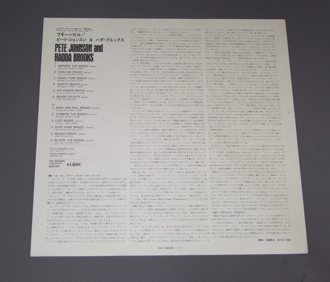 PETE JOHNSON & HADDA BROOKSピート・ジョンスン & ハダ・ブルックス/BOOGIE BATTLEブギー・バトル VIP5003M 製造国:日本盤 / Media:LP外観:EX盤の状態:EX+ 価格(税込):¥1,320(売約済) 送料 7inch:定形外郵便 360円~LP:定形外郵便 660円~送料は、注文の最終画面で確認頂けます。 > > PETE JOHNSON & HADDA BROOKS/BOOGIE BATTLE 外観 (EX)特記事項:特記なし。外観EXの共通説明:ダメージが限定的。中古品としては保存状態がよい方。シミ、ヨゴレ、スレ 少し~軽度。 盤の状態 (EX+)特記事項:極薄いスリキズ・スレ少し。一見してきれいな状態です。盤EX+の共通説明:盤面の極薄いスリキズ、スレ少し程度 音に出そうなものは無いように見える(極軽微なソフトティック音は除く)。 Tweet それぞれの画像をクリックすると、大きい写真が見られます こちらの商品もお勧めです 440円 Z.Z.HILLZ.Z.ヒル / Z.Z.HILLZ.Z.ヒル 1,980円 BUTTERFIELD BLUES BANDバターフィールド・ブルース・バンド / KEEP ON MOVINGキープ・オン・ムービング 1,210円 B.B.KINGB.B キング / LOVE ME TENDERラブ・ミ・テンダー