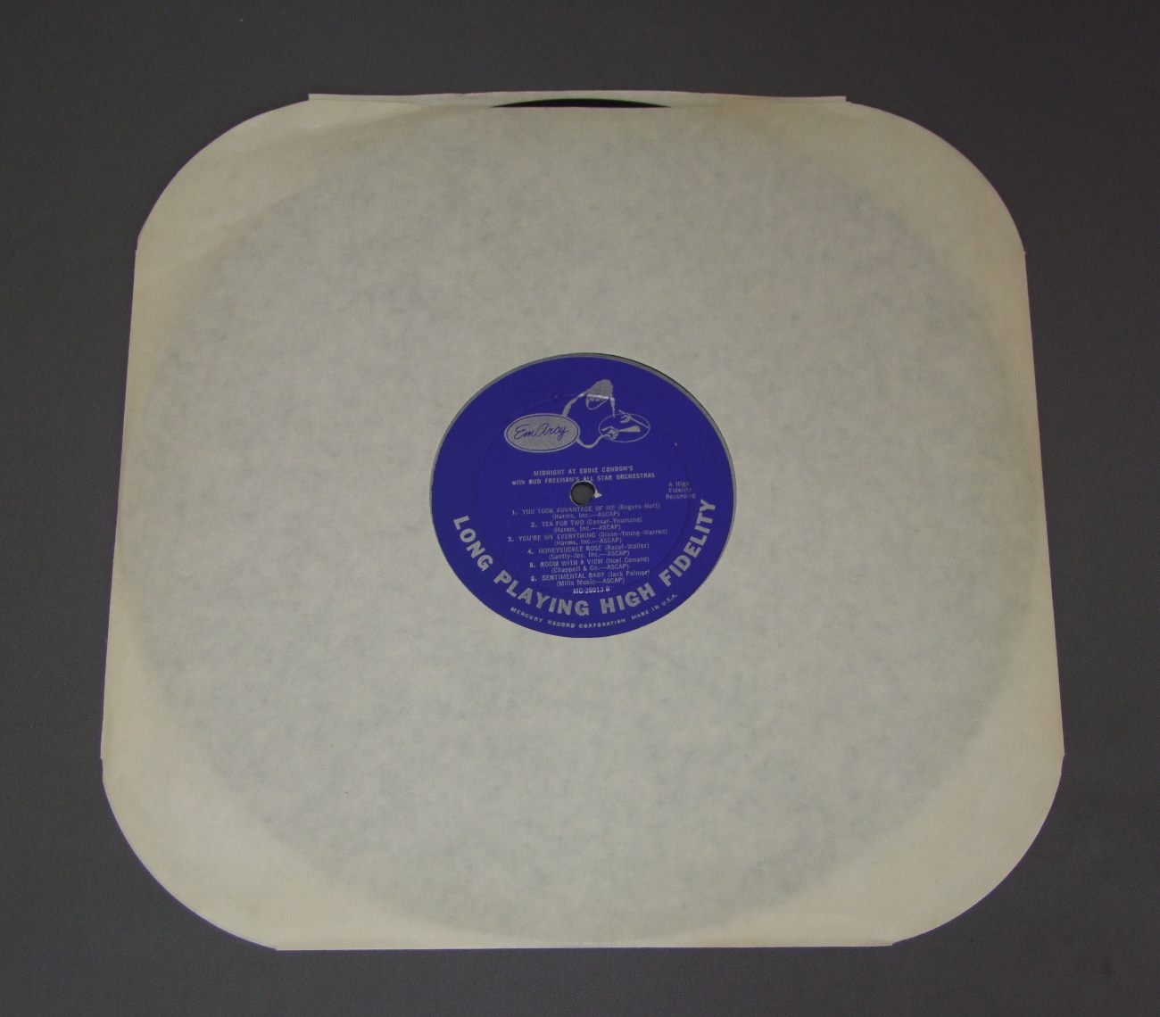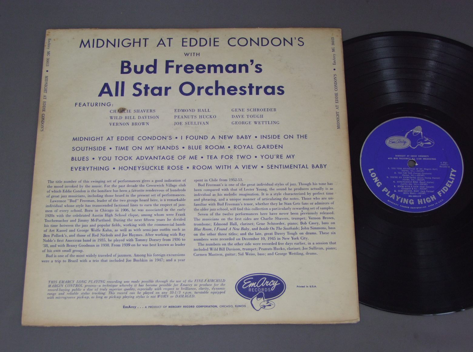 BUD FREEMAN`S ALL STAR ORCHESTRA/MIDNIGHT AT EDDIE CONDON`S MG36013 製造国:英国盤 / Media:LP外観:VG+盤の状態:EX 価格(税込):¥4,400 送料 7inch:定形外郵便 360円~LP:定形外郵便 660円~送料は、注文の最終画面で確認頂けます。 > > BUD FREEMAN`S ALL STAR ORCHESTRA/MIDNIGHT AT EDDIE CONDON`S 外観 (VG+)特記事項:上下ヘリは共にレコード取り出し口側から割れ。上ヘリ側は10CM、下ヘリは5CM程度。背や上下ヘリによごれ。裏ジャケにスレよごれなどやや有り。外観VG+の共通説明:ダメージやや有り。シミ、ヨゴレ、スレなど多少~やや多め。 盤の状態 (EX)特記事項:薄いスリキズ・スレ軽くある感じ。軽微なものの様子です。盤EXの共通説明:盤面のスリキズが薄いものが少し~軽度 音に出そうなものは無いように見える(軽微なソフトティック音は除く)。 Tweet それぞれの画像をクリックすると、大きい写真が見られます こちらの商品もお勧めです 4,400円 RED ALLEN / MEETS KID ORY 3,850円 BOB TOMPSON / ON THE ROCKS 3,850円 TONY PARENTI`S NEW ORLEANIANS / TONY PARENTI`S NEW ORLEANIANSサイン付 2,420円 WILD BILL DAVISON / WITH FREDDY RANDALL & HIS BANDサイン付 2,640円 WILD BILL DAVISON / RUNNING WILDサイン付 2,420円 JAZZ ALL STARS / MIDNIGHT AT EDDIE CONDON`Sサイン付 3,300円 KIRBY STONE FOUR / KIRBY STONE TOUCH 3,300円 CREOLE JAZZ BAND / KID ORY`S