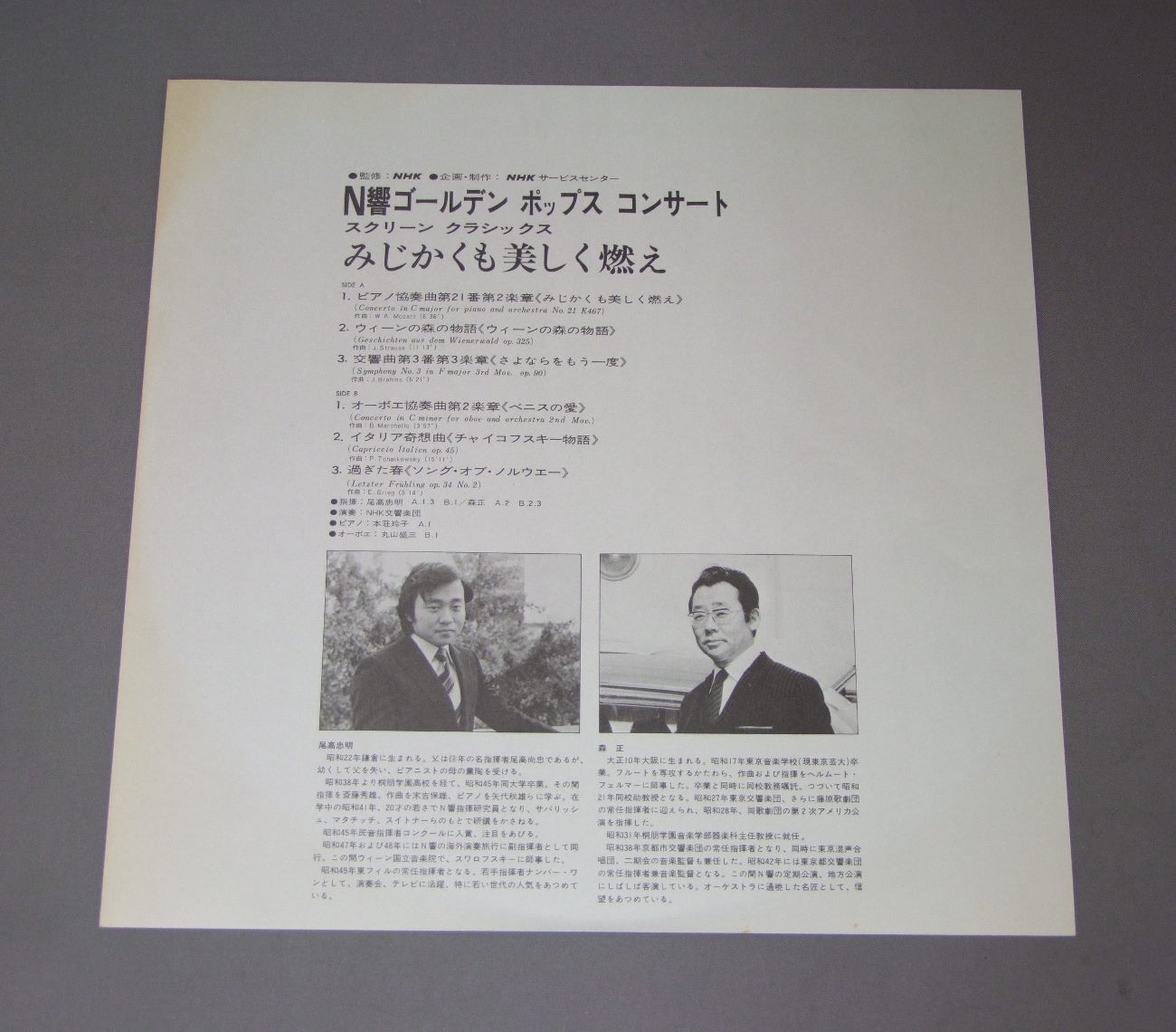NHK交響楽団/ ゴールデンポップスコンサート みじかくも美しく燃え MQY2002 製造国:日本盤 / Media:LP外観:EX-盤の状態:EX+帯:EX 価格(税込):¥990(売約済) 送料 7inch:定形外郵便 360円~LP:定形外郵便 660円~送料は、注文の最終画面で確認頂けます。 > > / 外観 (EX-)特記事項:背や背付近、底付近に日焼け。外観EX-の共通説明:ダメージ軽度~多少。 中古品としては普通の状態。シミ、ヨゴレ、スレなど軽く~多少。 盤の状態 (EX+)特記事項:極薄いスリキズ・スレ少し。一見してきれいな状態です。盤EX+の共通説明:盤面の極薄いスリキズ、スレ少し程度 音に出そうなものは無いように見える(極軽微なソフトティック音は除く)。 帯の状態 (EX):裏側にヨレやシミ軽。 Tweet それぞれの画像をクリックすると、大きい写真が見られます こちらの商品もお勧めです 990円 KEMPENケンペン / TCHAIKOVSKY SYM. NO5-CAPRICCIO ITALIENチャイコフスキー 交響曲第5番 -イタリア奇想曲 770円 JOCHUM - BERLIN PHILHARMONICヨッフム -ベルリン・フィル / BRUCKNER - SYMPHONY NO1ブルックナー - 交響曲第1番 990円 WALTERワルター / MAHLER-DAS LIED VON DER ERDEマーラー-交響曲 大地の歌 770円 KARAJAN - BERMAN - BERLINER PHIL.ラザール・ベルマン・カラヤン・ベルリン・フィル / TSCHAIKOWSKY - KLAVIERKONZERT NO1モーツアルト - ピアノ協奏曲第1番 990円 HUGHESヒューズ / PROKOFIEV-PETER&THE WOLF-SAINT-SAENS-THE CARNIVAL OF THE ANIMALSプロコフィエフ-ピーターと狼-サン=サーンス-動物の謝肉祭 990円 TOSCANINI - NBC SYMPHONY ORCHトスカニーニ - NBC交響楽団 / BEETHOVEN - SYM. NO4 & NO5ベートーヴェン - 交響曲 第4番第5番 990円 ANCERLアンチェル / MUSSORGSKY-PICTURES AT AN EXHIBITIONムソルグスキー-展覧会の絵-はげ山の一夜 990円 MARIマリ / CHABRIER-ESPANA etcシャブリエ-狂詩曲 スペイン 他