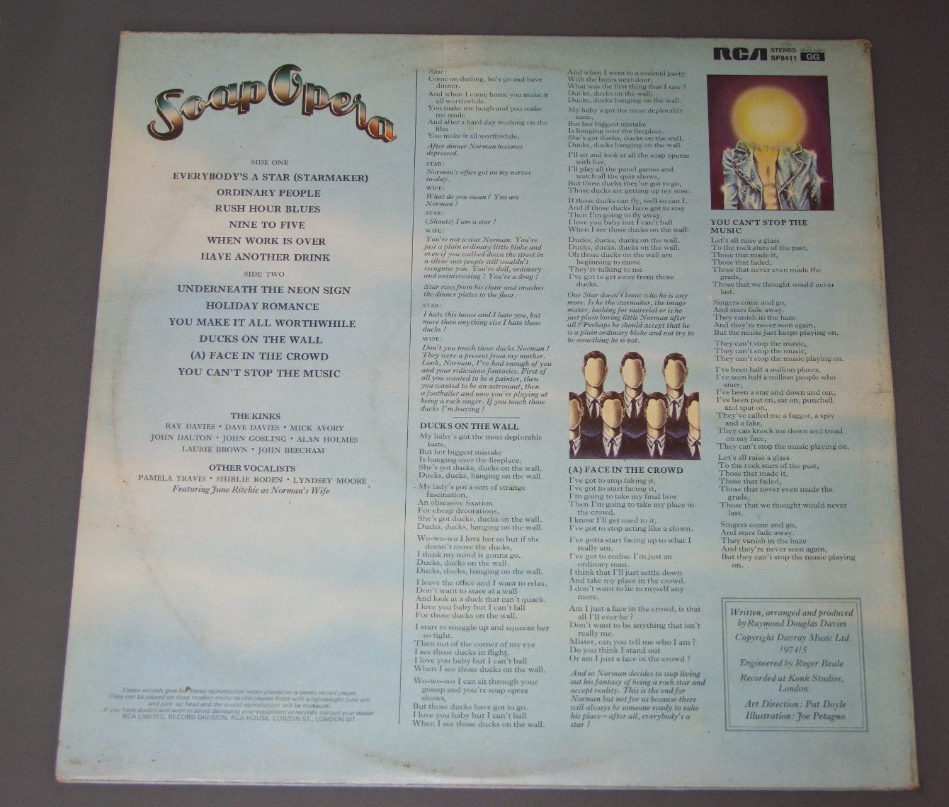 KINKS/SOAP OPERA SF8411 製造国:英国盤 / Media:LPMatrix:A-2E | B-1E外観:EX-盤の状態:EX 価格(税込):¥6,710(売約済) 送料 7inch:定形外郵便 360円~LP:定形外郵便 660円~送料は、注文の最終画面で確認頂けます。 > > KINKS/SOAP OPERA 外観 (EX-)特記事項:背のヘリにスレが少し。底スレ多少有り。上ヘリはそうでも無いです。ジャケ表面は薄いスレよごれやや有る感じ。外観EX-の共通説明:ダメージ軽度~多少。 中古品としては普通の状態。シミ、ヨゴレ、スレなど軽く~多少。 盤の状態 (EX)特記事項:薄いスリキズ・スレ軽くある感じ。ほとんどが軽微なものの様子です。曲間など、静かなところを中心に聴いて見ましたが、チリプチ軽度で音もしっかり鳴っていました。盤EXの共通説明:盤面のスリキズが薄いものが少し~軽度 音に出そうなものは無いように見える(軽微なソフトティック音は除く)。 Tweet それぞれの画像をクリックすると、大きい写真が見られます こちらの商品もお勧めです