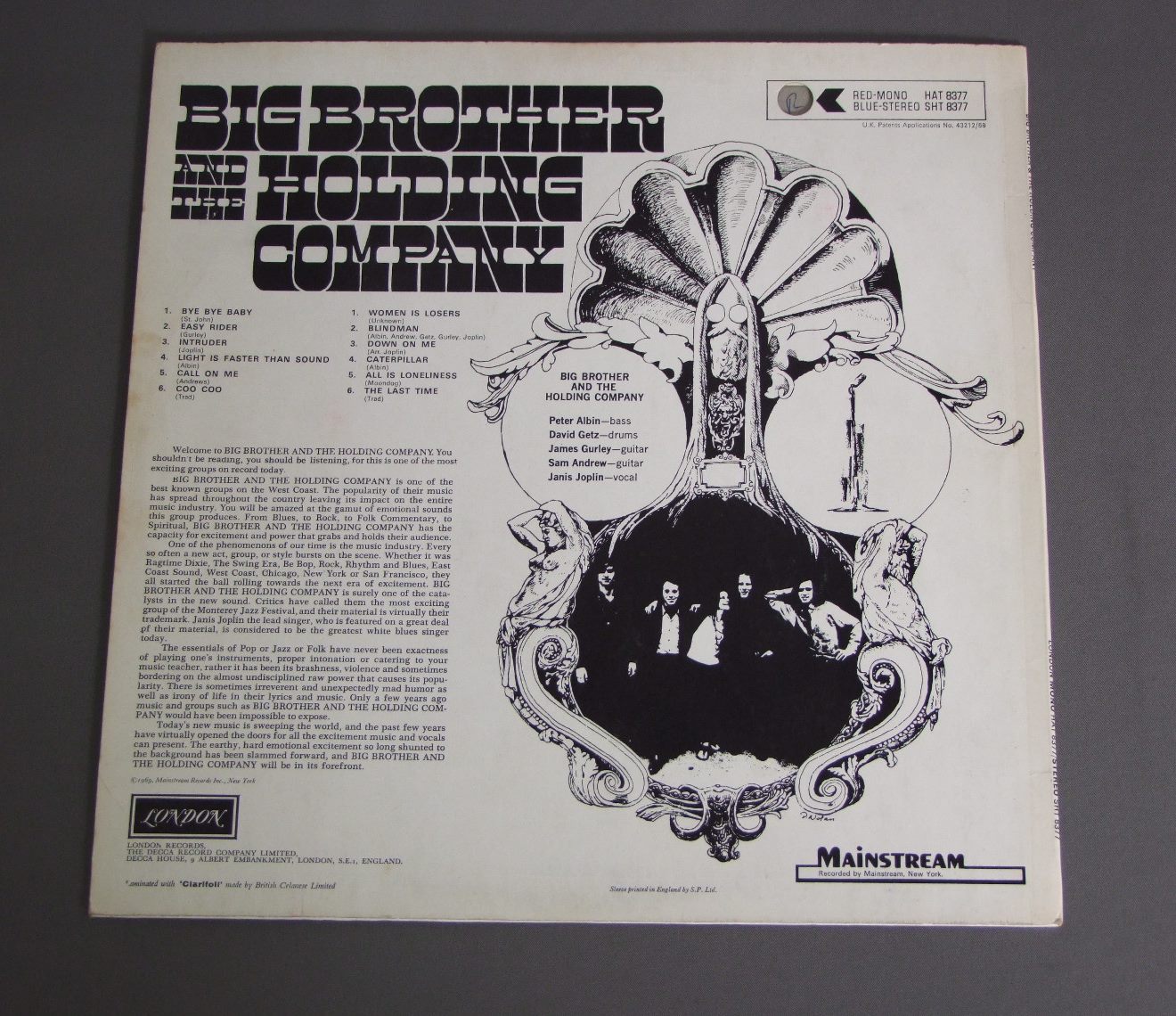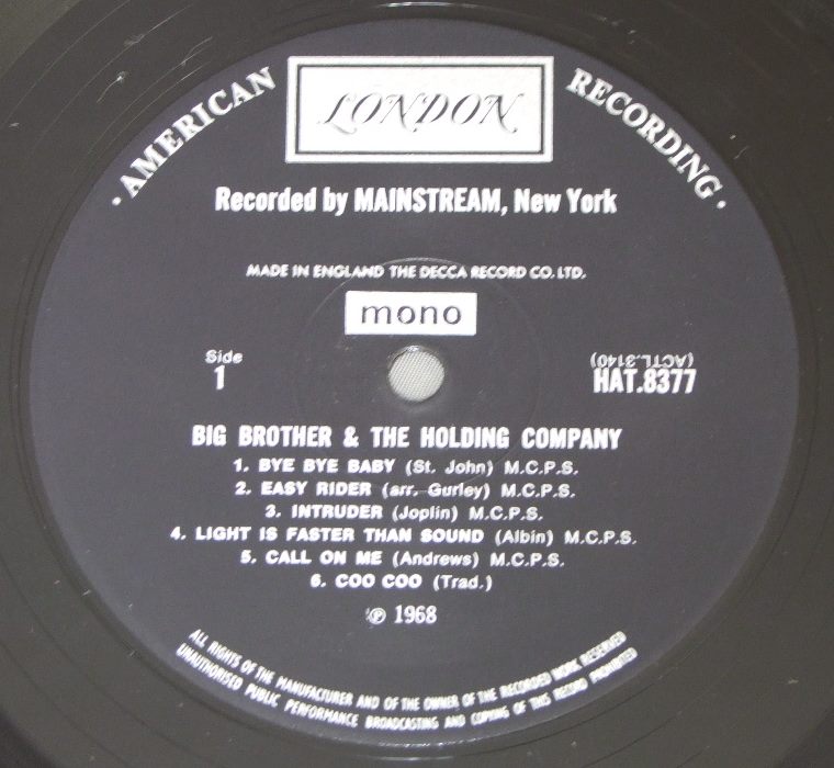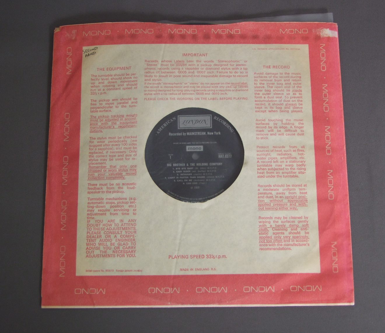 BIG BROTHER AND THE HOLDING COMPANY/SAME TITTLE MONO HAT8377 製造国:英国盤 / Media:LPMatrix:1B/1/B | 1B/1/D外観:EX盤の状態:EX+ 価格(税込):¥13,200(売約済) 送料 7inch:定形外郵便 360円~LP:定形外郵便 660円~送料は、注文の最終画面で確認頂けます。 > > BIG BROTHER AND THE HOLDING COMPANY/SAME TITTLE MONO 外観 (EX)特記事項:表ジャケは厚手のコーティング仕様。全体的にコーティングのヨレシワも少なく、スレやスリキズ等も薄い感じ。裏ジャケもよごれは少ないです。外観EXの共通説明:ダメージが限定的。中古品としては保存状態がよい方。シミ、ヨゴレ、スレ 少し~軽度。 盤の状態 (EX+)特記事項:極薄いスリキズ・スレ軽くある程度。音に出そうなものもなく一見してきれいな状態です。曲間など、静かなところを中心にMONO針で聴いて見ましたが、チリノイズ少ないきれいな再生具合でした。盤EX+の共通説明:盤面の極薄いスリキズ、スレ少し程度 音に出そうなものは無いように見える(極軽微なソフトティック音は除く)。 Tweet それぞれの画像をクリックすると、大きい写真が見られます こちらの商品もお勧めです 4,400円 AREA CODE 615 / TRIP IN THE COUNTRY 6,050円 ALLMAN BROTHERS BAND / WIPE THE WINDOWS 9,900円 BIG BROTHER AND HOLDING COMPAMY / SAME TITLE / MONO 5,500円 HUMIMGBIRD / HUMIMNGBIRD 2,750円 RASCALS / TIME PEACE RASCALS GREATEST HITS 4,950円 BIG BROTHER AND THE HOLDING CO / BE A BROTHER 7,700円 BLUE JAG / SAME TITLE