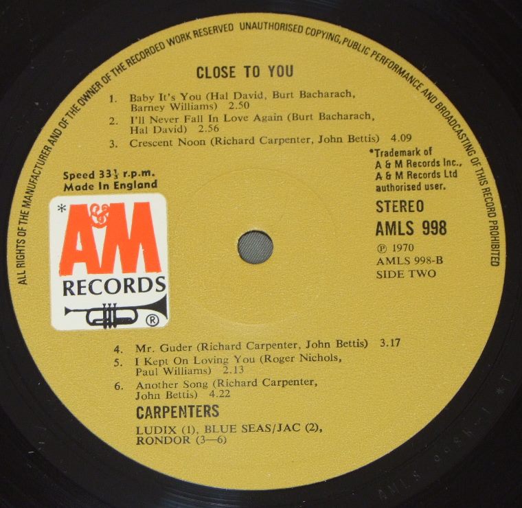 CARPENTERS/CLOSE TO YOU英国1st ALBUM AMLS998 製造国:英国盤 / Media:LPMatrix:A-1*T | B-1*T外観:EX盤の状態:EX 価格(税込):¥4,950(売約済) 送料 7inch:定形外郵便 360円~LP:定形外郵便 660円~送料は、注文の最終画面で確認頂けます。 > > CARPENTERS/CLOSE TO YOU 外観 (EX)特記事項:英国盤は表裏ジャケ共に厚手のコーティング仕様。表裏ジャケ共に背に沿ってコーティングの浮き有りますが、ジャケ表面は全体的にコーティングのヨレシワも少なく、スレやスリキズも薄い感じ。外観EXの共通説明:ダメージが限定的。中古品としては保存状態がよい方。シミ、ヨゴレ、スレ 少し~軽度。 盤の状態 (EX)特記事項:薄いスリキズ・スレ少しある程度。音に出そうなものもなく一見してきれいな状態です。曲間など、静かなところを中心に聴いて見ましたが、チリプチノイズ少ないきれいな再生具合でした。盤EXの共通説明:盤面のスリキズが薄いものが少し~軽度 音に出そうなものは無いように見える(軽微なソフトティック音は除く)。 その他:英国盤ではファーストアルバムになります。 Tweet それぞれの画像をクリックすると、大きい写真が見られます こちらの商品もお勧めです 7,700円 SUSAN MAUGHAN / I WANNA BE BOBBY`S GIRL 4,950円 SANDY DENNY / RENDEZVOUS 3,850円 NICO / THE END 4,950円 JONI MITCHELL / DOG EAT DOG 4,400円 JONI MITCHELL / DOG EAT DOG 5,060円 JONI MITCHELL / CHALK MARK IN A RAIN STORM