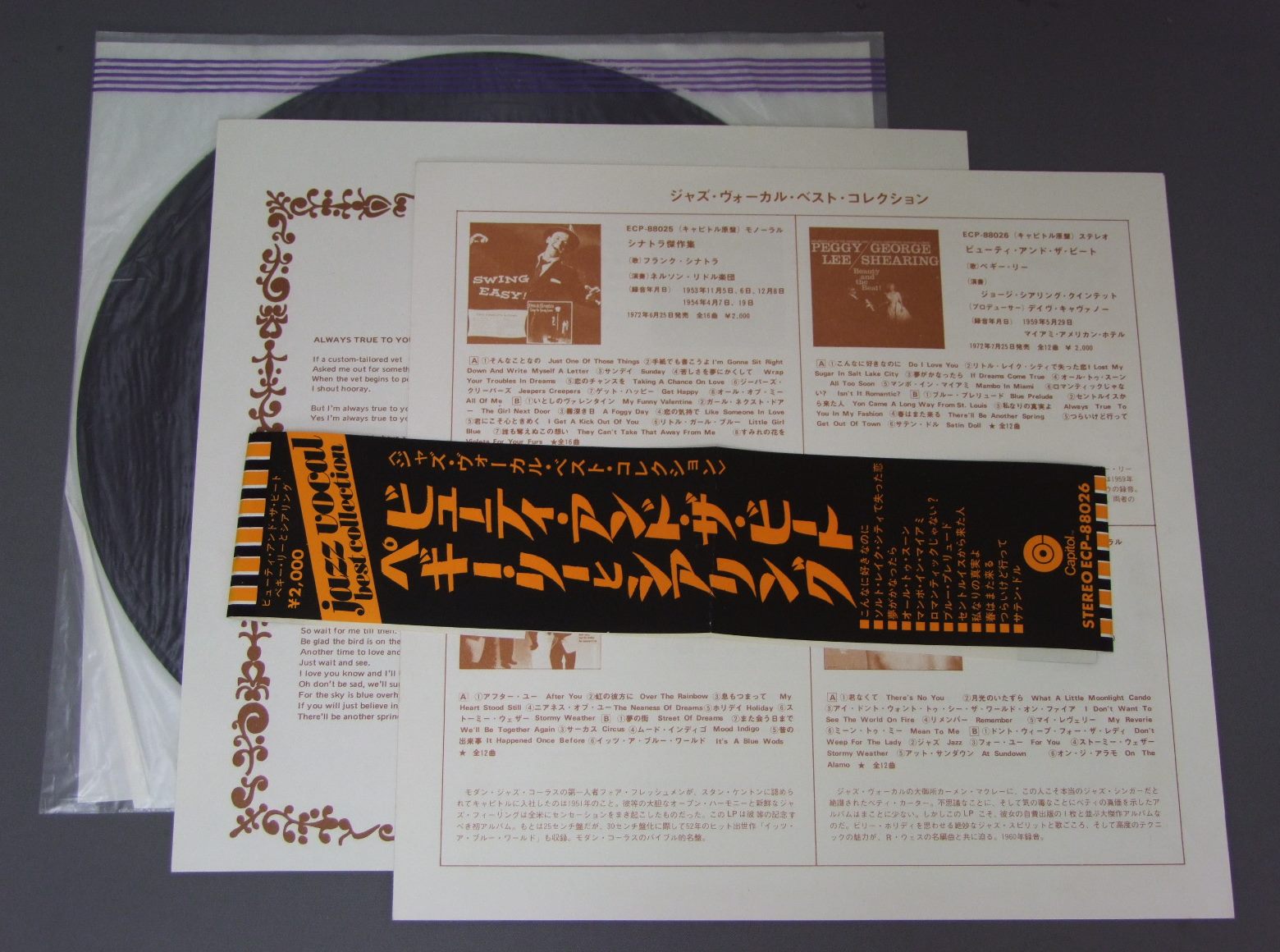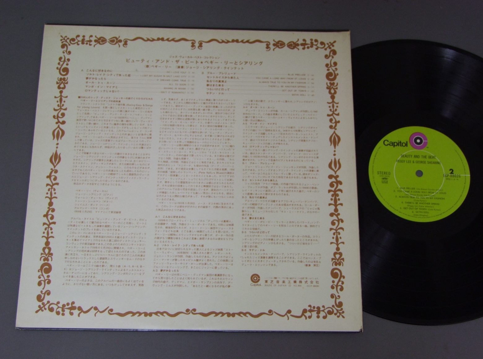 PEGGY LEE/GEORGE SHEARINGペギー・リーとシアリング/BEAUTY AND THE BEAT !ビューティ・アンド・ザ・ビート ECP88026 製造国:日本盤 / Media:LP外観:EX盤の状態:EX+帯:VG+ 価格(税込):¥1,650(売約済) 送料 7inch:定形外郵便 360円~LP:定形外郵便 660円~送料は、注文の最終画面で確認頂けます。 > > PEGGY LEE/GEORGE SHEARING/BEAUTY AND THE BEAT ! 外観 (EX)特記事項:裏ジャケに日焼やシミ軽多少有り。外観EXの共通説明:ダメージが限定的。中古品としては保存状態がよい方。シミ、ヨゴレ、スレ 少し~軽度。 盤の状態 (EX+)特記事項:極薄いスリキズ・スレ少し。一見してきれいな状態です。盤EX+の共通説明:盤面の極薄いスリキズ、スレ少し程度 音に出そうなものは無いように見える(極軽微なソフトティック音は除く)。 帯の状態 (VG+):下ヘリで完全切れ。真ん中に折れ跡。 Tweet それぞれの画像をクリックすると、大きい写真が見られます こちらの商品もお勧めです 1,210円 HERBIE MANNハービー・マン / MEMPHIS UNDERGROUNDメンフィス・アンダーグラウンド 1,320円 TERUMASA HINO SEXTET日野皓正セクステット / FUJI藤 880円 SADAO WATANABE渡辺貞夫 / MY DEAR LIFEマイ・ディア・ライフ 1,320円 GATO BARBIERIガトー・バルビエリ / EL PAMPEROエル・パンペーロ 440円 ROGER KELLAWAYロジャー・ケラウェイ / CENTER OF THE CIRCLE核 662円 FRANCOIS GLORIEUXグロリュー / PLAYS THE BEATLESビートルズを弾く 1,320円 DOLLAR BRANDダラー・ブランド / AFRICAN PIANOアフリカン・ピアノ 990円 HI-LO`Sハイ・ローズ / BACK AGAINバック・アゲイン
