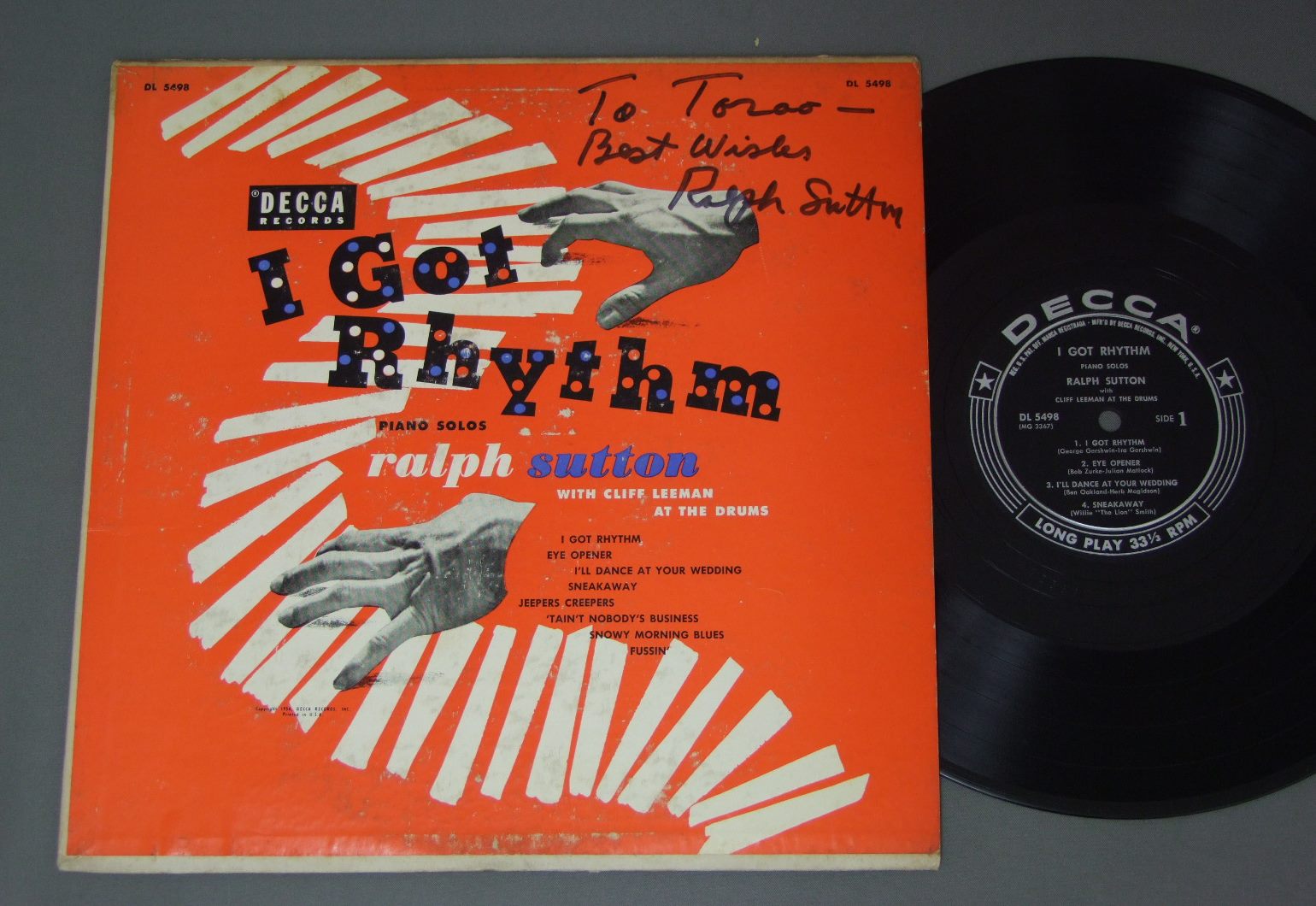RALPH SUTTON WITH CLIFF LEEMAN/I GOT RHYTHMRALPH SUTTON サイン付 DL5498 製造国:米国盤 / Media:10inch外観:VG+盤の状態:VG+ 価格(税込):¥3,850(売約済) 送料 7inch:定形外郵便 360円~LP:定形外郵便 660円~送料は、注文の最終画面で確認頂けます。 > > RALPH SUTTON WITH CLIFF LEEMAN/I GOT RHYTHM 外観 (VG+)特記事項:背によごれ。底抜け補修。上ヘリは割れの補修。表ジャケは濃い目のスレやや有り。裏ジャケは日焼け感有り。外観VG+の共通説明:ダメージやや有り。シミ、ヨゴレ、スレなど多少~やや多め。 盤の状態 (VG+)特記事項:薄いスリキズ・細かいスレ多少。プチ出そうな小キズ、線キズも有ります。少し聴いてみましたが、音自体はしっかりクリアーに鳴っているようでした。盤VG+の共通説明:盤面にスリキズが多少~やや有り、音に出そうなものも多少ある。 Tweet それぞれの画像をクリックすると、大きい写真が見られます こちらの商品もお勧めです 1,540円 PETER NERO / HAIL THE CONQUERING NERO 770円 HARRISON & BLANCHARD / BLACK PEARL 990円 SPIKE JONES / KING OF CORN 990円 RAY MC KINLEY - BERNIE PRIVIN - PEANUTS HUCKO etc / JAZZMEN IN UNIFORM PARIS 1945 1,100円 BENNY GOODMAN BAND / COMMAND PERFORMANCE 550円 DIZZY GILLESPIE / DIZZY GILLESPIE 880円 PAUL RENARD / MANY KEYBOARDS OF THE AMAZING PAUL RENARD 770円 HANNA-FONTANA BAND / LIVE AT CONCORD