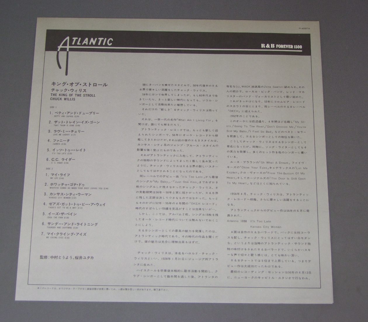 CHUCK WILLSチャック・ウィリス/KING OF THE STROLLキング・オブ・ストロール P4587A 製造国:日本盤 / Media:LP外観:EX-盤の状態:EX+帯:EX 価格(税込):¥1,320(売約済) 送料 7inch:定形外郵便 360円~LP:定形外郵便 660円~送料は、注文の最終画面で確認頂けます。 > > CHUCK WILLS/KING OF THE STROLL 外観 (EX-)特記事項:裏ジャケにシミ有り。外観EX-の共通説明:ダメージ軽度~多少。 中古品としては普通の状態。シミ、ヨゴレ、スレなど軽く~多少。 盤の状態 (EX+)特記事項:薄いスリキズ・スレ少し。一見してきれいな状態です。盤EX+の共通説明:盤面の極薄いスリキズ、スレ少し程度 音に出そうなものは無いように見える(極軽微なソフトティック音は除く)。 帯の状態 (EX):裏側にシミ少々。 Tweet それぞれの画像をクリックすると、大きい写真が見られます こちらの商品もお勧めです 880円 DIANA ROSSダイアナ・ロス / LIVE AT CAESARS PALACEライブ・アット・シーザース・パレス 880円 TEMPTATIONSテンプテーションズ / BEST COLLECTIONベスト・コレクション 1,650円 OHIO PLAYERS / BACK 440円 THREE DEGREESスリー・ディグリーズ / INTERNATIONAL世界の恋人スリー・ディグリーズ 770円 MARTHA REEVESマーサ・リーブス / 1st ALBUMソロ・ファースト 660円 DIONNE WARWICKディオンヌ・ワーウィック / HOW MANY TIMES CAN WE SAY GOODBYEさよならは一度だけ 1,210円 SMOKEY ROBINSONスモーキー・ロビンソン / YES IT`S YOU LADYイエス・イッツ・ユー・レディ 1,320円 TEMPTATIONSテンプテーションズ / LIVEライブ