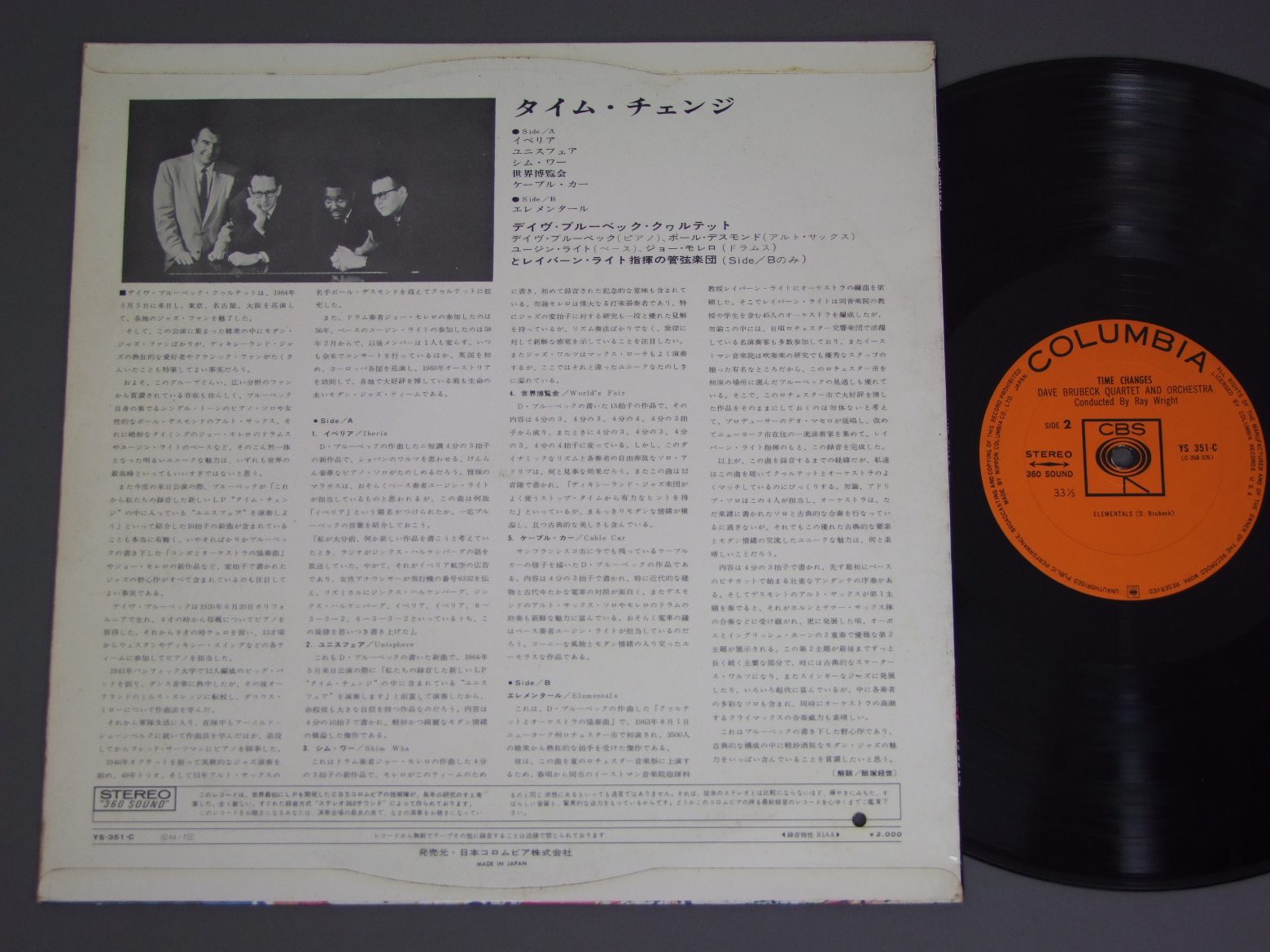 DAVE BRUBECK QUARTET/TIME CHANGESペラジャケ YS351C 製造国:日本盤 / Media:LP外観:EX盤の状態:EX- 価格(税込):¥943(売約済) 送料 7inch:定形外郵便 360円~LP:定形外郵便 660円~送料は、注文の最終画面で確認頂けます。 > > DAVE BRUBECK QUARTET/TIME CHANGES 外観 (EX)特記事項:特記無し。コンディションリストを参照下さい。外観EXの共通説明:ダメージが限定的。中古品としては保存状態がよい方。シミ、ヨゴレ、スレ 少し~軽度。 盤の状態 (EX-)特記事項:薄いスリキズ・細かい表面スレ軽くある感じ。全体的には殆どが軽微なものの様子です。盤EX-の共通説明:盤面のスリキズが多少有り。音に出そうなものは殆ど無いように見える~さほど気にならないぐらいの軽いプチ数カ所程度。 その他:※画像では確認できない、上下ヘリ、背表紙、取り出し口を中心に状態表記しております。画像で確認出来る表裏ジャケ、レーベルの状態表記は省いている場合がありますので、そちらの状態は画像でご確認をお願い致します。携帯の方は一度PC等で写真をご確認の上ご入札下さいますよう、お願い申し上げます。 Tweet それぞれの画像をクリックすると、大きい写真が見られます こちらの商品もお勧めです 1,320円 TOSHIKO AKIYOSHI - LEW TABACKIN BIG BAND秋吉敏子=ルー・タバキン・ビッグ・バンド / INSIGHTSインサイツ 770円 MODERN JAZZ QUARTETMJQ / LAST CONCERTラスト・コンサート 1,210円 SONNY ROLLINSソニー・ロリンズ / DON`T ASKドント・アスク 1,320円 RAMSEY LEWIS -BOB JAMES etcラムゼイ・ルイス - ボブ・ジェームス他 / ONE-NIGHT STAND A KEYBOARD EVENTワンナイト・スタンド-キーボード・イベント 990円 PETER SPRAGUEピーター・スプラッチ / MUSICA DEL MARムジカ・デル・マール 1,320円 SHIRO MICHI道志郎 / WONDERFUL WORLD OF ELECTONEエレクトーンの驚異 880円 MASAMI NAKAGAWA中川昌三 / PRELUDE FOR AUTUMNプレリュード・フォー・オータム 1,210円 BUD POWELL TRIOバド・パウエル・トリオ / ROOST SESSION BEST 6-VOL.1バド・パウエルの芸術