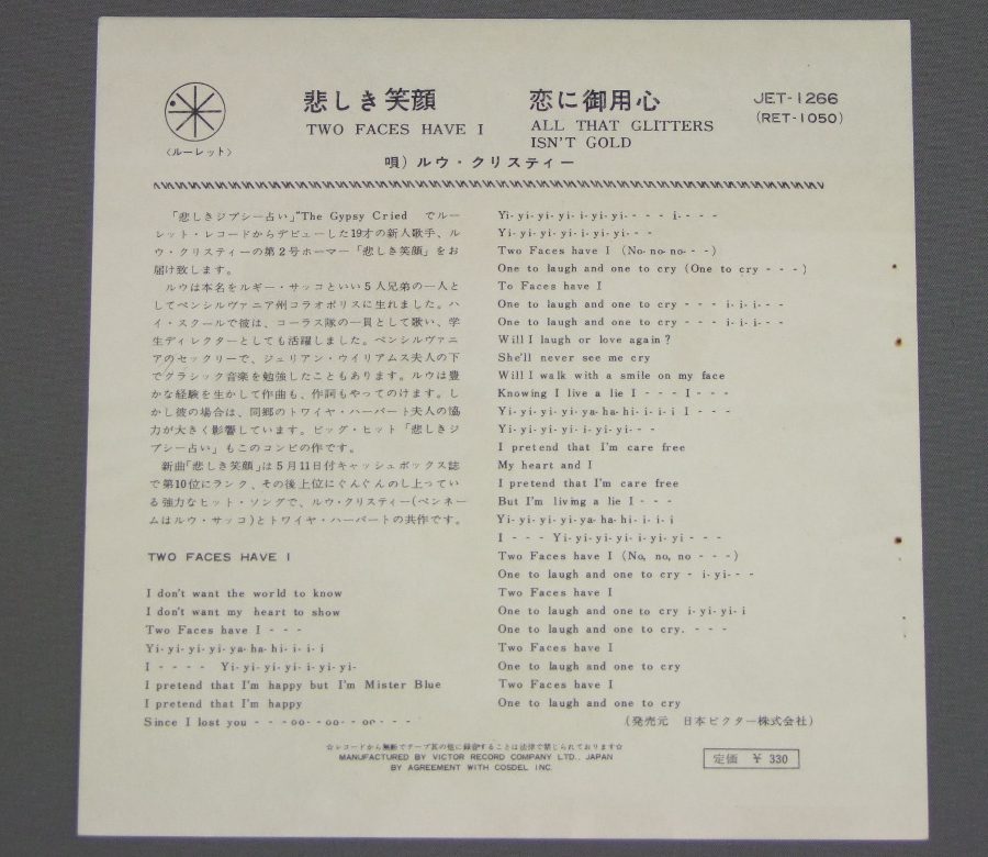 LOU CHRISTIEルウ・クリスティ/ 悲しき笑顔(ジャケットのみ) JET1266 製造国:日本盤 / Media:7inch外観:EX 価格(税込):¥440(売約済) 送料 7inch:定形外郵便 360円~LP:定形外郵便 660円~送料は、注文の最終画面で確認頂けます。 > > LOU CHRISTIE/ 外観 (EX)特記事項:表側から見て左端にホッチキス穴2ヶ所。外観EXの共通説明:ダメージが限定的。中古品としては保存状態がよい方。シミ、ヨゴレ、スレ 少し~軽度。 盤の状態 ()特記事項:盤なし。ジャケットのみです。盤の共通説明: Tweet それぞれの画像をクリックすると、大きい写真が見られます こちらの商品もお勧めです 1,320円 ROGER VOUDOURISロジャー・ヴドゥーリス / GUY LIKE MEロマンの囁き 1,210円 TOMMY SHAWトミー・ショウ / GIRLS WITH GUNSガール・ウィズ・ガン 660円 GLEN CAMPBELLグレン・キャンベル / COMING HOMEカミング・ホーム 1,320円 JACKSON BROWNEジャクソン・ブラウン / LAWYERS IN LOVE愛の使者 550円 AL STEWARTアル・スチュアート / ORANGEオレンジ 770円 JOHN DENVERジョン・デンバー / BACK HOME AGAINバック・ホーム・アゲイン 770円 NEIL DIAMONDニール・ダイアモンド / I`M GLAD YOU`RE HERE WITH ME TONIGHT愛のぬくもり 770円 JOHN DENVERジョン・デンバー / EVENING WITH JOHN DENVERジョン・デンバー・ライブ