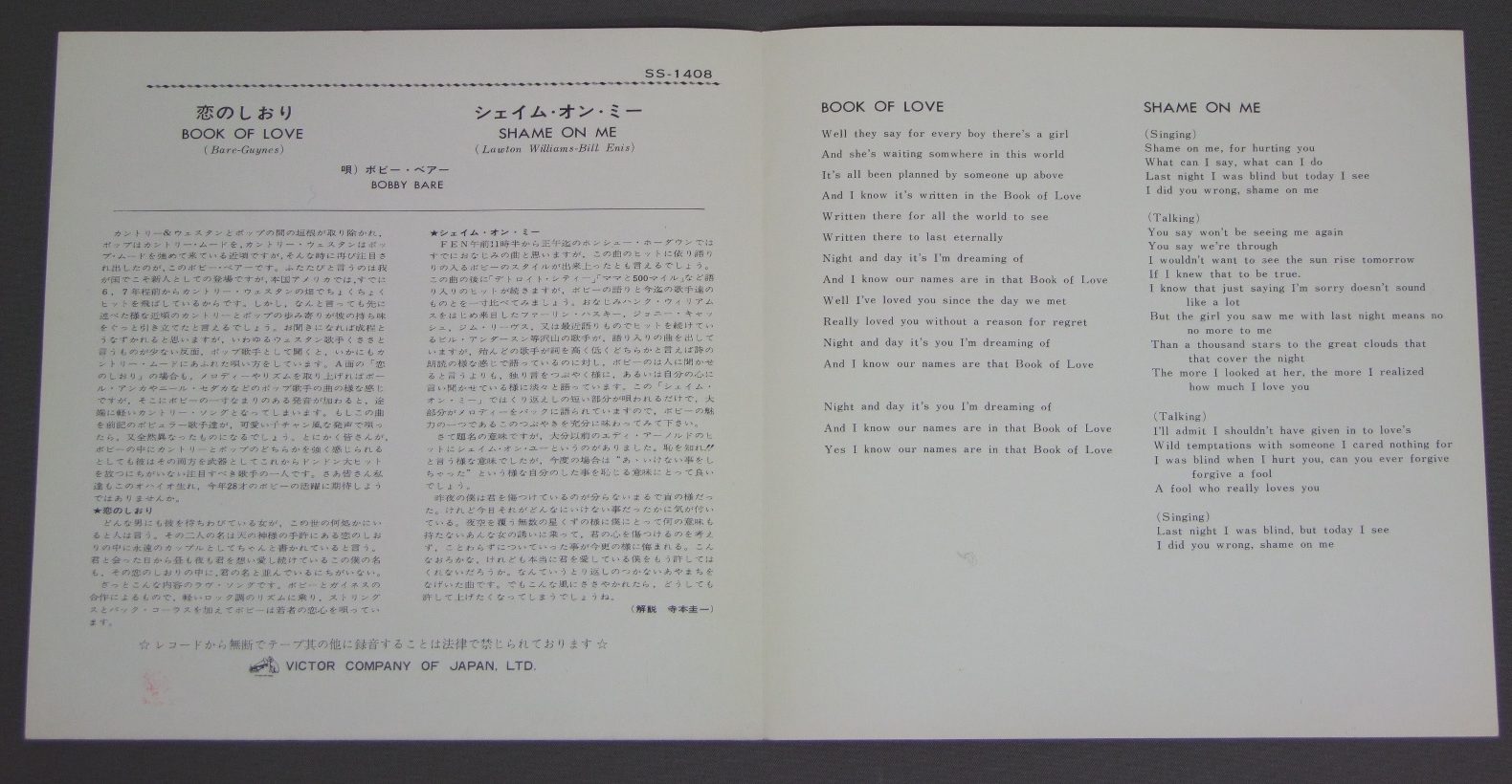 BOBBY BAREボビー・ベア/ 恋のしおり(ジャケのみ) SS-1408 製造国:日本盤 / Media:7inch外観:EX+ 価格(税込):¥440(売約済) 送料 7inch:定形外郵便 360円~LP:定形外郵便 660円~送料は、注文の最終画面で確認頂けます。 > > BOBBY BARE/ 外観 (EX+)特記事項:特記無し。コンディションリストを参照下さい。外観EX+の共通説明:中古としては美品、一見してきれいでダメージが軽微。シミ、ヨゴレ、スレ有っても僅か~少し。 盤の状態 ()特記事項:盤なし。ジャケットのみです。盤の共通説明: Tweet それぞれの画像をクリックすると、大きい写真が見られます こちらの商品もお勧めです 660円 PAUL ANKAポール・アンカ / BEST OF PAUL ANKAポール・アンカのすべて 1,650円 ELVIS PLESLEYエルヴィス.プレスリー / ELVIS-THAT`S THE WAY IT ISエルヴィス.オン・ステージVOL.1 990円 VENTURESベンチャーズ / ON STAGE ENCOREオン・ステージ・アンコール 1,210円 ELVIS PRESLEY / ELVIS AS RECORDED AT MADISON SQUARE GARDENエルヴィス・イン・ニューヨーク 990円 ELVISエルヴィス / THIS IS ELVIS-SELECTIONS FROM THE ORIGINAL MOTION PICUTRE SOUNDTRACK映画 THIS IS ELVIS オリジナル・サウンドトラック 770円 RICK NELSONリック・ネルソン / ALBUM SEVEN BY RICKアルバム・セブン・リック 770円 ELVIS PRESLEYエルヴィス・プレスリー / ELVIS-THAT`S THE WAY IT ISこの胸のときめきを -MGM映画 エルヴィス・オン・ステージ 主題歌集 990円 RICK NELSONリック・ネルソン / ALBUM SEVEN BY RICKアルバム・セブン・バイ・リック