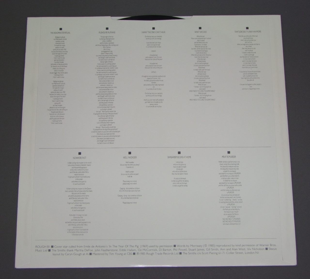 SMITHS/MEAT IS MURDER ROUGH81 製造国:英国盤 / Media:LPMatrix:A2 | B2 手彫り外観:EX+盤の状態:EX+ 価格(税込):¥4,400(売約済) 送料 7inch:定形外郵便 360円~LP:定形外郵便 660円~送料は、注文の最終画面で確認頂けます。 > > SMITHS/MEAT IS MURDER 外観 (EX+)特記事項:ジャケ表面は全体的にスレやスリキズ、よごれ等少ないきれいな状態。オリジナルインナーもきれいな状態です。美品。外観EX+の共通説明:中古としては美品、一見してきれいでダメージが軽微。シミ、ヨゴレ、スレ有っても僅か~少し。 盤の状態 (EX+)特記事項:極薄いスリキズ・スレ少し。音に出そうなものもなく一見してきれいな状態です。曲間など、静かなところを中心に聴いて見ましたが、チリノイズ少ないきれいな再生具合でした。盤EX+の共通説明:盤面の極薄いスリキズ、スレ少し程度 音に出そうなものは無いように見える(極軽微なソフトティック音は除く)。 Tweet それぞれの画像をクリックすると、大きい写真が見られます こちらの商品もお勧めです 3,080円 FRIENDS / SONGS WITHOUT TEARS 3,080円 RAZORCUTS / PATTERNS ON THE WATER 4,950円 PRISONERS / WISER MISERD MELZA 2,420円 MOMUS / DON`T STOP THE NIGHT 3,300円 CHESTERFIELD / CROCODILE TEARS 3,520円 GROOVE FARM / PLUG 3,080円 53rd & 3rd LBL ARTISTS / GOOD FEELING 3,300円 KING OF LUXEMBOURG / SIR