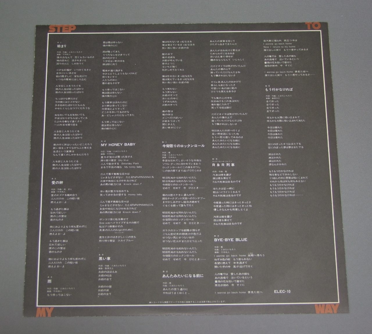 TOMITA ICHIROとみたいちろう/STEP TO MY WAYELEK白見本盤 ELEC10 製造国:日本盤 / Media:LP外観:EX-盤の状態:EX 価格(税込):¥660(売約済) 送料 7inch:定形外郵便 360円~LP:定形外郵便 660円~送料は、注文の最終画面で確認頂けます。 > > TOMITA ICHIRO/STEP TO MY WAY 外観 (EX-)特記事項:背上下角にスレ。下の方にひび割れ。上下ヘリスレ多少有りです。ジャケ表面は多少スレよごれ有り。外観EX-の共通説明:ダメージ軽度~多少。 中古品としては普通の状態。シミ、ヨゴレ、スレなど軽く~多少。 盤の状態 (EX)特記事項:薄いスリキズ・スレ少しある感じ。一見してきれいな印象です。盤EXの共通説明:盤面のスリキズが薄いものが少し~軽度 音に出そうなものは無いように見える(軽微なソフトティック音は除く)。 その他:白見本盤 Tweet それぞれの画像をクリックすると、大きい写真が見られます こちらの商品もお勧めです 990円 RANBO MINAMIみなみ らんぼう / KATARITUKUSENAI MAY語り尽くせない五月 1,980円 TAKURO YOSHIDA吉田拓郎 / SEISHUN-NO UTA青春の詩 440円 CHANCHAKOちゃんちゃこ / 1st ALBUMちゃんちゃこファースト 770円 HITOSHI KOMURO-TAKURO YOSHIDA etc小室等-吉田拓郎 他 / CHRISTMAS 2,750円 UATA NO ICHI唄の市 / GUITAR STYLEBOOK + BOOKギター・スタイルブック 教則本付 1,320円 NEKO猫 / NEKO猫 1,650円 5 BALLOONS五つの赤い風船 / `75 660円 OSAMU KITAYAMA北山修 / CHILDREN WHO DO NOT KNOW THE WAR戦争を知らない子供たち