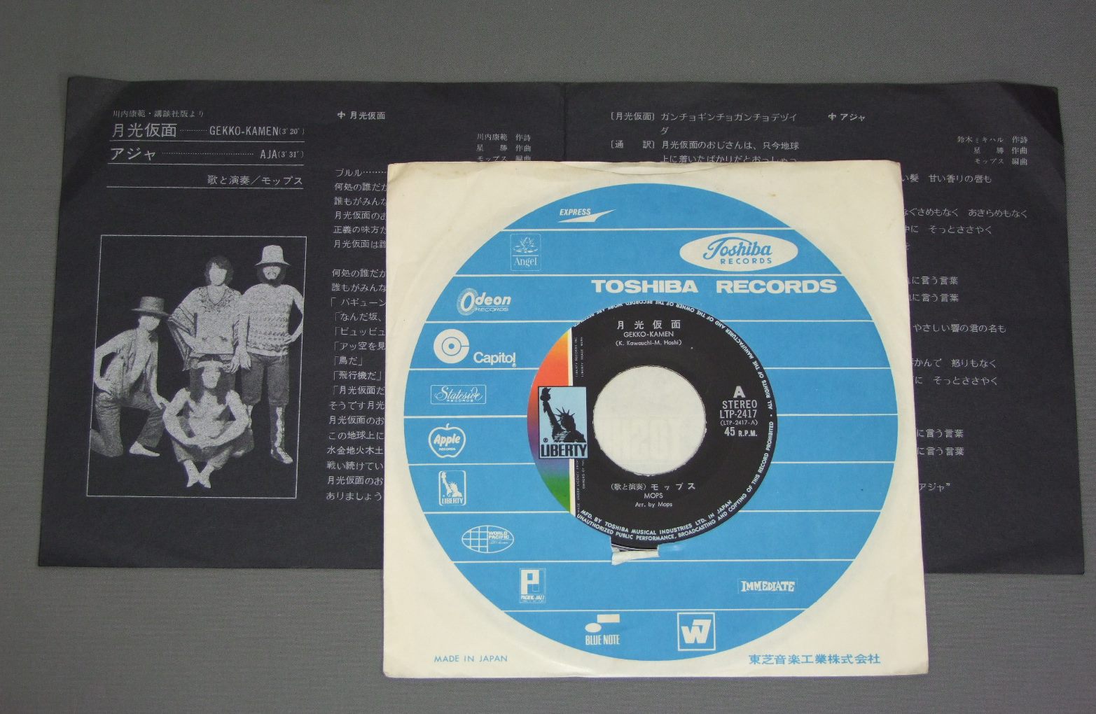 MOPSモップス/GEKKO_KAMEN月光仮面 LTP2417 製造国:日本盤 / Media:7inch外観:EX盤の状態:EX 価格(税込):¥990(売約済) 送料 7inch:定形外郵便 360円~LP:定形外郵便 660円~送料は、注文の最終画面で確認頂けます。 > > MOPS/GEKKO_KAMEN 外観 (EX)特記事項:特記無し。コンディションリストを参照下さい。外観EXの共通説明:ダメージが限定的。中古品としては保存状態がよい方。シミ、ヨゴレ、スレ 少し~軽度。 盤の状態 (EX)特記事項:薄いスリキズ・スレ軽くある感じ。軽微なものの様子です。盤EXの共通説明:盤面のスリキズが薄いものが少し~軽度 音に出そうなものは無いように見える(軽微なソフトティック音は除く)。 その他:※画像では確認できない、上下ヘリ、背表紙、取り出し口を中心に状態表記しております。画像で確認出来る表裏ジャケ、レーベルの状態表記は省いている場合がありますので、そちらの状態は画像でご確認をお願い致します。携帯の方は一度PC等で写真をご確認の上ご入札下さいますよう、お願い申し上げます。 Tweet それぞれの画像をクリックすると、大きい写真が見られます こちらの商品もお勧めです 1,210円 TIGERSタイガース / TIGERS 1982十年ロマンス 2,420円 OXオックス / TELL ME-OX ON STAGE No1テルミー-オックス・オン・ステージ No1 1,320円 TAKESHI TERAUCHI & BLUEJEANS寺内タケシとブルー・ジーンズ / ELECTRIC GUITAR SONGS WITHOUT SONG歌のないエレキ歌謡曲 550円 TAKESHI TERAUCHI & THE BUNNYS寺内タケシとバニーズ / LET`S GO CLASSICSレッツ・ゴー運命 550円 TIGERSタイガース / 10 YEARS ROMANCE十年ロマンス 1,320円 YUZO KAYAMA & LAUNCHERS加山雄三とランチャーズ / 1st ALBUM ( REISSUE )青春・愛その時 (幻の1st ALBUM ) 770円 TIGERSタイガース / TIGERS 1982タイガース 1982 770円 YUZO KAYAMA加山雄三 / GOLDEN ALBUMゴールデン・アルバム(あなたと共に)赤盤