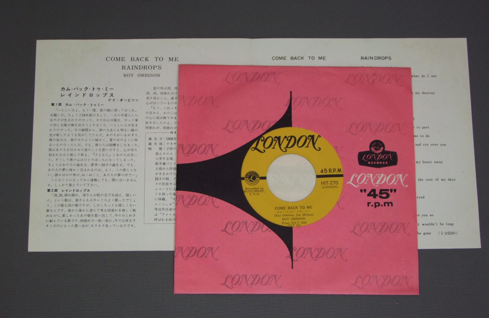 ROY ORBISONロイオービソン/COME BACK TO MEカム・バック・トゥ・ミー HIT270 製造国:日本盤 / Media:7inch外観:EX+盤の状態:EX+ 価格(税込):¥4,400(売約済) 送料 7inch:定形外郵便 360円~LP:定形外郵便 660円~送料は、注文の最終画面で確認頂けます。 > > ROY ORBISON/COME BACK TO ME 外観 (EX+)特記事項:特記無し。コンディションリストを参照下さい。外観EX+の共通説明:中古としては美品、一見してきれいでダメージが軽微。シミ、ヨゴレ、スレ有っても僅か~少し。 盤の状態 (EX+)特記事項:極薄いスリキズ・スレ少し。一見してきれいな状態です。盤EX+の共通説明:盤面の極薄いスリキズ、スレ少し程度 音に出そうなものは無いように見える(極軽微なソフトティック音は除く)。 その他:※画像では確認できない、上下ヘリ、背表紙、取り出し口を中心に状態表記しております。画像で確認出来る表裏ジャケ、レーベルの状態表記は省いている場合がありますので、そちらの状態は画像でご確認をお願い致します。携帯の方は一度PC等で写真をご確認の上ご入札下さいますよう、お願い申し上げます。 Tweet それぞれの画像をクリックすると、大きい写真が見られます こちらの商品もお勧めです 1,320円 ELVIS PRESLEY / THAT`S THE WAY IT ISこの胸のときめきを 770円 RICK NELSONリック・ネルソン / ALBUM SEVEN BY RICKアルバム・セブン・リック 770円 VARIOUS ARTISTS / YESTERDAY`S HITSイエスタデイズ・ヒッツ 1,210円 EVERLY BROTHERSエヴァリー・ブラザース / DATE WITH EVERY BROTHERSデイト・ウィズ・エヴァリー・ブラザーズ 1,210円 ELVIS PRESLEY / ELVIS IN PERSONプレスリー・イン・パーソン 990円 VENTURESベンチャーズ / ROOK`N`ROLL GRAFFITIロックン・ロール・グラフィティ 660円 PAUL ANKAポール・アンカ / BEST OF PAUL ANKAポール・アンカのすべて 770円 ELVIS PRESLEYエルヴィス・プレスリー / ELVIS-THAT`S THE WAY IT ISこの胸のときめきを -MGM映画 エルヴィス・オン・ステージ 主題歌集