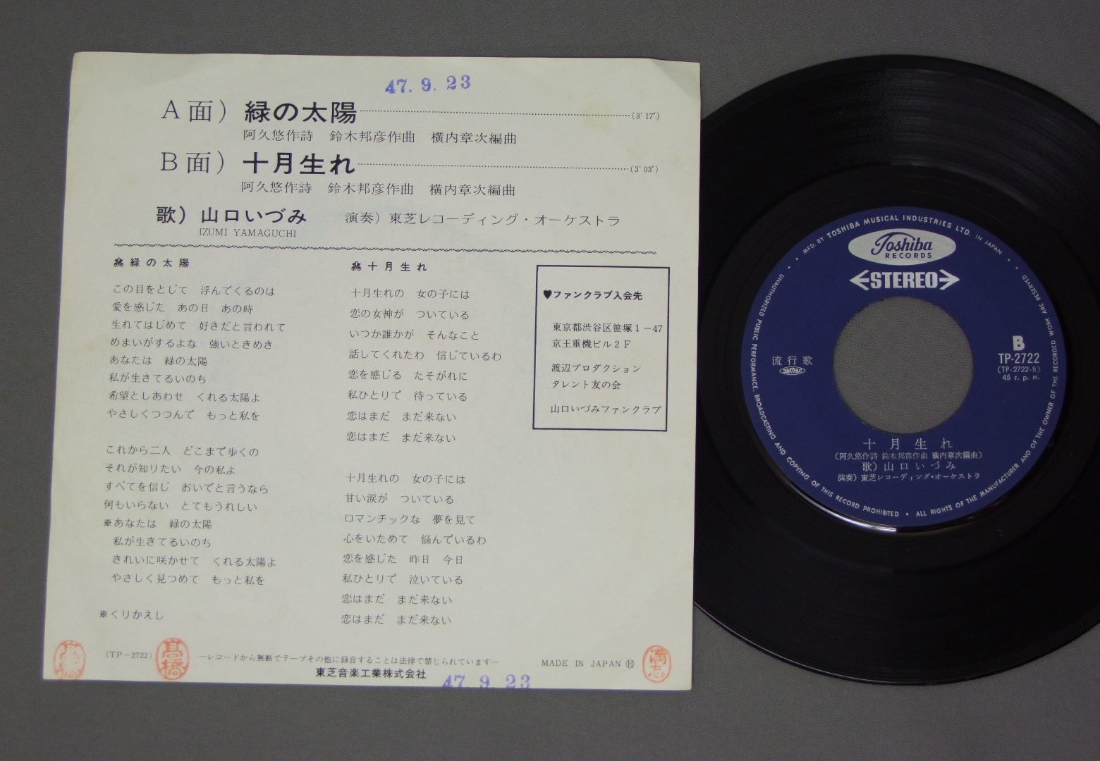 山口いづみ/緑の太陽 TP2722 製造国:日本盤 / Media:7inch外観:VG+盤の状態:EX 価格(税込):¥734(売約済) 送料 7inch:定形外郵便 360円~LP:定形外郵便 660円~送料は、注文の最終画面で確認頂けます。 > > / 外観 (VG+)特記事項:ヨレ多少有り。裏側にスタンプや印鑑。外観VG+の共通説明:ダメージやや有り。シミ、ヨゴレ、スレなど多少~やや多め。 盤の状態 (EX)特記事項:薄いスリキズ・スレ少しある程度。一見してきれいな状態です。盤EXの共通説明:盤面のスリキズが薄いものが少し~軽度 音に出そうなものは無いように見える(軽微なソフトティック音は除く)。 その他:※画像では確認できない、上下ヘリ、背表紙、取り出し口を中心に状態表記しております。画像で確認出来る表裏ジャケ、レーベルの状態表記は省いている場合がありますので、そちらの状態は画像でご確認をお願い致します。携帯の方は一度PC等で写真をご確認の上ご入札下さいますよう、お願い申し上げます。 Tweet それぞれの画像をクリックすると、大きい写真が見られます こちらの商品もお勧めです 990円 CAROLキャロル / 1975 4.13.1975 4.13. 770円 LAYLAレイラ / SEISHUN NO KISEKI青春の奇跡 770円 MAYO SHOHNO庄野真代 / LAST SHOWラスト・ショー 1,210円 YUKO OTOMO大友裕子 / KIZUNA絆(きずな) 1,320円 SHOGO HAMADA & THE FUSE浜田省吾 / CLUB SURFBOUND 1,320円 NOA HORIGUCHI堀口ノア / NOA 770円 ALFEEアルフィー / PAGE ONE -13 PIECES OF ALFEE- 990円 HIROMI IWASAKI岩崎ひろみ / YUUGUREKARA夕暮れからひとり