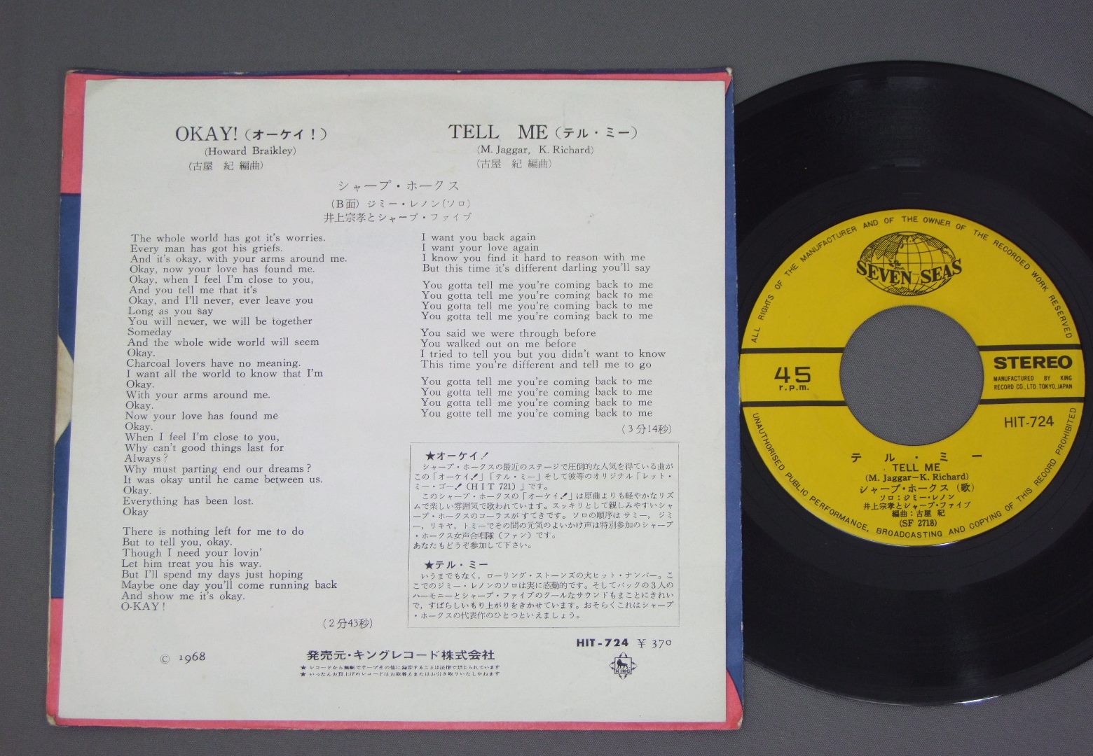 シャープ・ホークス/OKAY!オーケイ! HIT724 製造国:日本盤 / Media:7inch外観:EX-盤の状態:EX- 価格(税込):¥4,950(売約済) 送料 7inch:定形外郵便 360円~LP:定形外郵便 660円~送料は、注文の最終画面で確認頂けます。 > > /OKAY! 外観 (EX-)特記事項:ヨレ多少有り。外観EX-の共通説明:ダメージ軽度~多少。 中古品としては普通の状態。シミ、ヨゴレ、スレなど軽く~多少。 盤の状態 (EX-)特記事項:薄いスリキズ・細かい表面スレ多少ある感じ。殆どが軽微なものの様子です。盤EX-の共通説明:盤面のスリキズが多少有り。音に出そうなものは殆ど無いように見える~さほど気にならないぐらいの軽いプチ数カ所程度。 その他:※画像では確認できない、上下ヘリ、背表紙、取り出し口を中心に状態表記しております。画像で確認出来る表裏ジャケ、レーベルの状態表記は省いている場合がありますので、そちらの状態は画像でご確認をお願い致します。携帯の方は一度PC等で写真をご確認の上ご入札下さいますよう、お願い申し上げます。 Tweet それぞれの画像をクリックすると、大きい写真が見られます こちらの商品もお勧めです 660円 YUZO KAYAMA加山雄三 / 15TH ANNIVERSARY加山雄三1976 武道館ライブ 1,650円 MUNETAKA INOUE & HIS SHARP FIVE井上宗孝とシャープ・ファイヴ / SHARP FIVE SCREEN GO GOシャープ・ファイヴ・スクリーン・ゴーゴー 550円 TAKESHI TERAUCHI & THE BUNNYS寺内タケシとバニーズ / LET`S GO CLASSICSレッツ・ゴー運命 550円 TIGERSタイガース / 10 YEARS ROMANCE十年ロマンス 770円 TIGERSタイガース / TIGERS 1982タイガース 1982 1,210円 TIGERSタイガース / TIGERS 1982十年ロマンス 770円 YUZO KAYAMA加山雄三 / GOLDEN ALBUMゴールデン・アルバム(あなたと共に)赤盤 1,320円 TAKESHI TERAUCHI & BLUEJEANS寺内タケシとブルー・ジーンズ / ELECTRIC GUITAR SONGS WITHOUT SONG歌のないエレキ歌謡曲