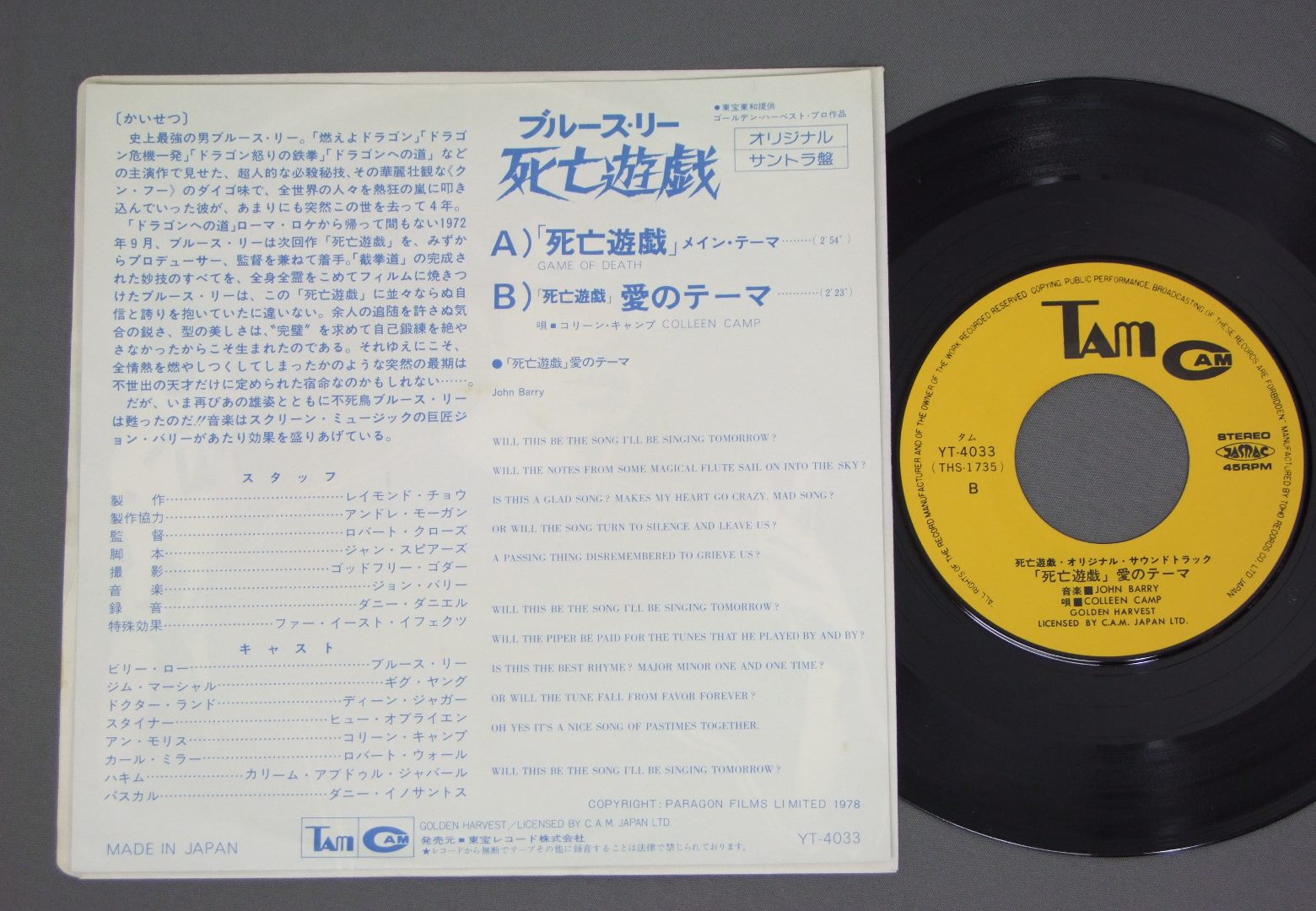 BRUCE LEEブルースリー/GAME OF DEATH死亡遊戯 最後の怪鳥音入り YT4033 製造国:日本盤 / Media:7inch外観:EX盤の状態:EX+ 価格(税込):¥1,047(売約済) 送料 7inch:定形外郵便 360円~LP:定形外郵便 660円~送料は、注文の最終画面で確認頂けます。 > > BRUCE LEE/GAME OF DEATH 外観 (EX)特記事項:特記なし。外観EXの共通説明:ダメージが限定的。中古品としては保存状態がよい方。シミ、ヨゴレ、スレ 少し~軽度。 盤の状態 (EX+)特記事項:特記なし。盤EX+の共通説明:盤面の極薄いスリキズ、スレ少し程度 音に出そうなものは無いように見える(極軽微なソフトティック音は除く)。 Tweet それぞれの画像をクリックすると、大きい写真が見られます こちらの商品もお勧めです 770円 JOHN ADDISONジョン・アディスン監督 / SOUNDTRACK BRIDGE TOO FAR映画 遠すぎた橋 1,320円 KIYOSHI ATSUMI渥美清 倍賞千恵子 他 / OTOKO HA TURAIYO SOUND TRACK映画男はつらいよ御存知名場面集 1,320円 HENRY MANCINIヘンリー・マンシーニ / SOUND TRACK CHARADEヘップバーン映画シャレード 770円 JOHN BARRYジョン・バリー / COTTON CLUB映画 コットンクラブ 880円 TV SOUND TRACK2大刑事ドラマ / ORETACHINO KUNSHO俺たちの勲章-太陽にほえろ ! テレビ主題曲集 550円 BURT BACHARACHバート・バカラック / SOUNDTRACK ARTHUR映画 ミスター・アーサー 1,650円 TATSUYA TAKAHASHI & TOKYO UNION高橋達也と東京ユニオン / SOUND TRACK DAITOKAI大都会パート3 1,210円 BRUCE LEEブルース・リー / IN THE BIG BOSSサントラ・ドラゴン危機一発