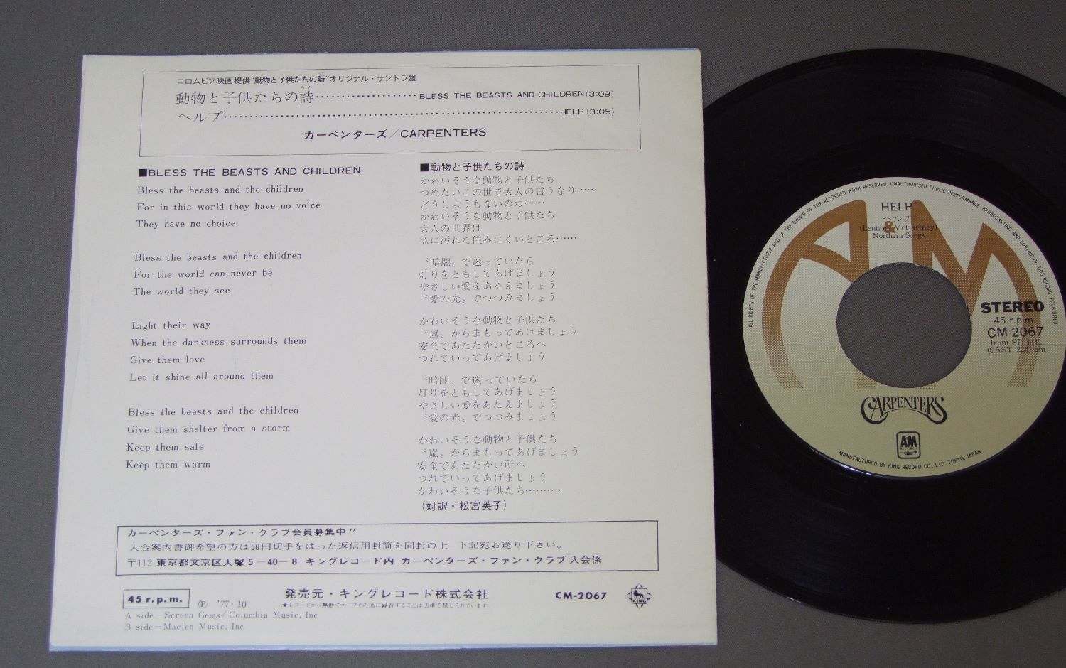 CARPENTERSカーペンターズ/BLESS THE BEASTS AND CHILDREN映画「動物と子供たちの詩」動物と子供たちの詩 CM2067 製造国:日本盤 / Media:7inch外観:EX-盤の状態:EX+ 価格(税込):¥440(売約済) 送料 7inch:定形外郵便 360円~LP:定形外郵便 660円~送料は、注文の最終画面で確認頂けます。 > > CARPENTERS/BLESS THE BEASTS AND CHILDREN 外観 (EX-)特記事項:背スレ有り。底抜け有り。外観EX-の共通説明:ダメージ軽度~多少。 中古品としては普通の状態。シミ、ヨゴレ、スレなど軽く~多少。 盤の状態 (EX+)特記事項:極薄いスリキズ・スレ少し。一見してきれいな状態です。盤EX+の共通説明:盤面の極薄いスリキズ、スレ少し程度 音に出そうなものは無いように見える(極軽微なソフトティック音は除く)。 Tweet それぞれの画像をクリックすると、大きい写真が見られます こちらの商品もお勧めです 1,210円 DIANA ROSSダイアナ・ロス / EATEN ALIVEイートウン・アライブ 770円 PAT BENATARパット・べネター / CRIMES OF PASSION危険な恋人 770円 PAT BENATARパット・べネター / IN THE HEART OF THE NIGHT真夜中の恋人達 770円 DANIELE LICARIダニエル・リカーリ / GOLDEN PRIZEゴールデン・プライズ 770円 LINDA RONSTADTリンダ・ロンシュタット / LIVING IN THE U.S.A.ミス・アメリカ 440円 DIANA ROSSダイアナ・ロス / WHY DO FOOLS FALL IN LOVEファースト・レディ 1,980円 ELEN FOLEYエレン・フォーリー / SPIRIT OF ST LOUIS悲しみのシアター 1,650円 MIREILLE MATHIEUミレイユ・マチュー / MIREILLE MATHIEU GOLDEN COLLECTION VOL2ミレイユ・マチュー・ゴールデン・コレクション第2集