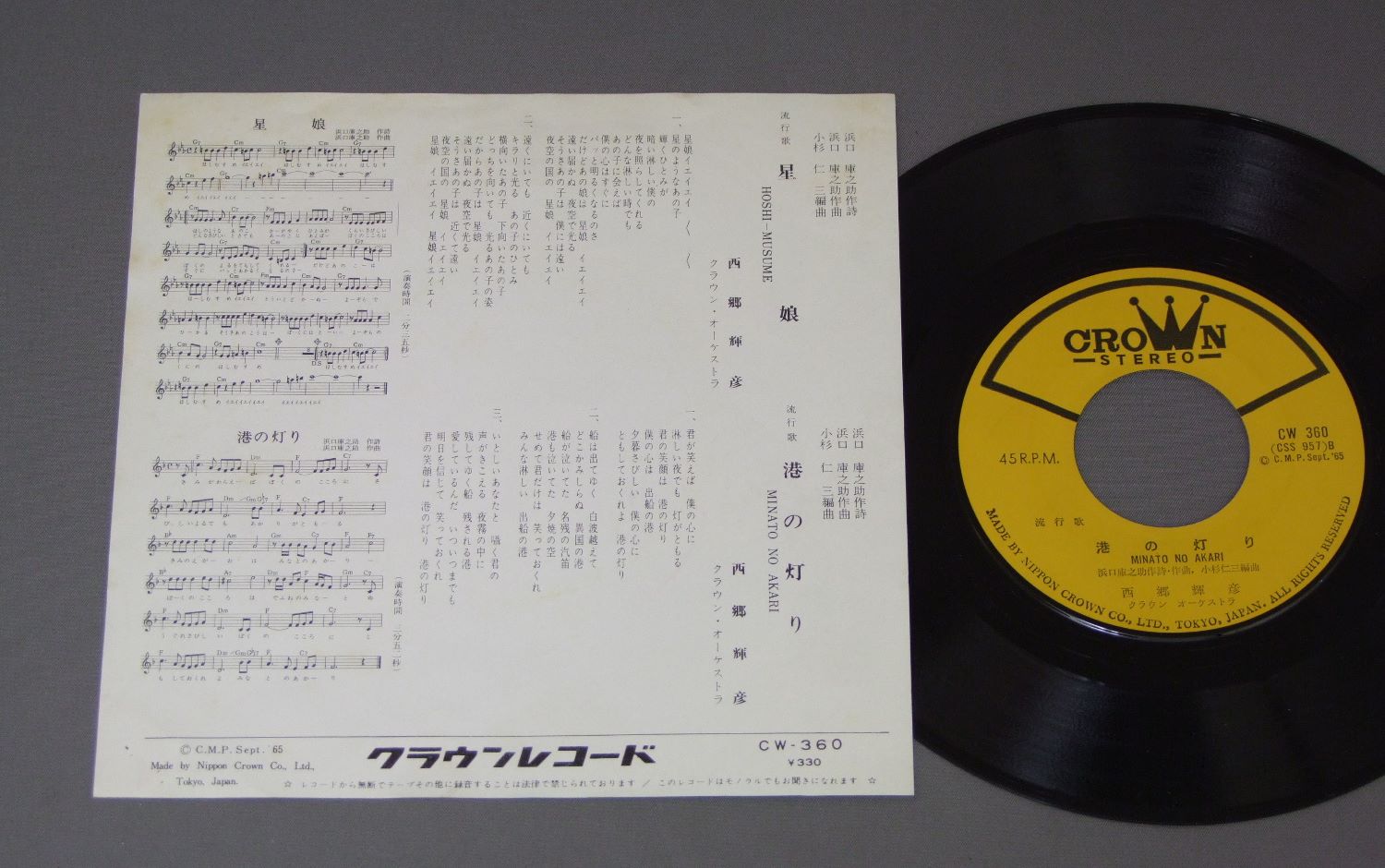 TERUHIKO SAIGO西郷輝彦/星娘 CW360 製造国:日本盤 / Media:7inch外観:EX盤の状態:EX 価格(税込):¥550(売約済) 送料 7inch:定形外郵便 360円~LP:定形外郵便 660円~送料は、注文の最終画面で確認頂けます。 > > TERUHIKO SAIGO/ 外観 (EX)特記事項:裏側に薄いシミ。外観EXの共通説明:ダメージが限定的。中古品としては保存状態がよい方。シミ、ヨゴレ、スレ 少し~軽度。 盤の状態 (EX)特記事項:薄いスリキズ・スレ軽くある感じ。軽微なものの様子です。盤EXの共通説明:盤面のスリキズが薄いものが少し~軽度 音に出そうなものは無いように見える(軽微なソフトティック音は除く)。 Tweet それぞれの画像をクリックすると、大きい写真が見られます こちらの商品もお勧めです 660円 GARO / GARO 4 1,210円 MAYUMI ITSUWA五輪真弓 / SHIOSAI潮騒 770円 MOTOHARU SANO佐野元春 / VISITORS 1,320円 TULIPチューリップ / LIVE THE 1000thライブ THE 1000th 880円 MASA TAKAGI高木麻早 / 1st ALBUM高木麻早 770円 KUMIKO YAMASHITA山下久美子 / BABY BABY 770円 CHIKA UEDA上田知華 / MISS HEARTミス・ハート 660円 CYGNUS白鳥座 / DENEB ( 2nd ALBUM )デネブ ( 2nd ALBUM )