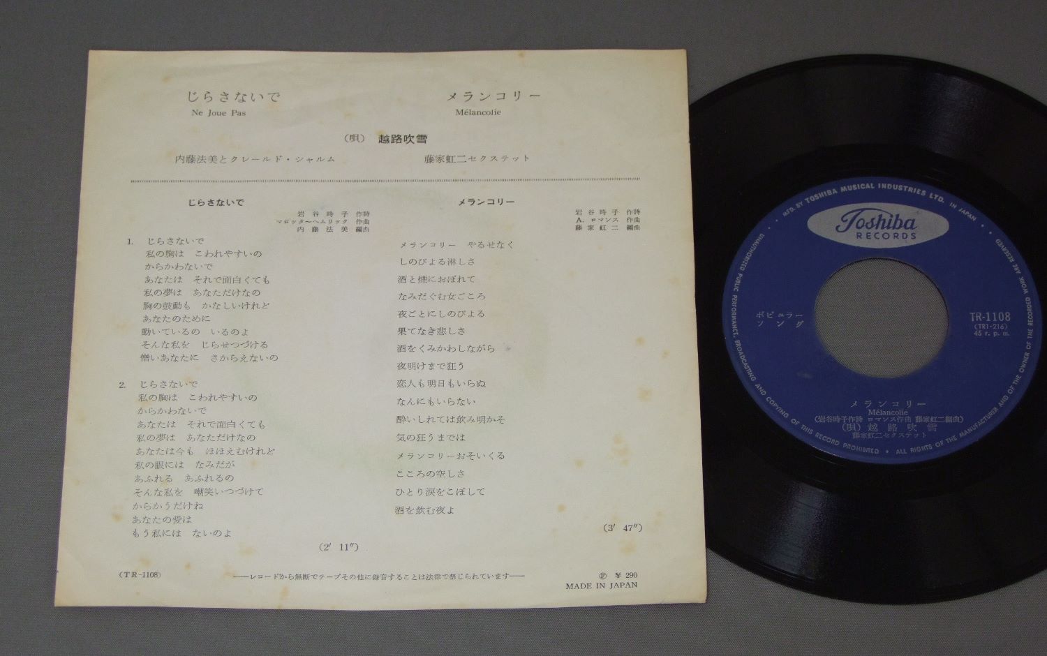 FUBUKI KOSHIJI越路吹雪/NE JOUE PASじらさないで TR1108 製造国:日本盤 / Media:7inch外観:VG+盤の状態:EX 価格(税込):¥550(売約済) 送料 7inch:定形外郵便 360円~LP:定形外郵便 660円~送料は、注文の最終画面で確認頂けます。 > > FUBUKI KOSHIJI/NE JOUE PAS 外観 (VG+)特記事項:表裏共にシミ有り外観VG+の共通説明:ダメージやや有り。シミ、ヨゴレ、スレなど多少~やや多め。 盤の状態 (EX)特記事項:薄いスリキズ・スレ軽くある感じ。殆どが軽微なものの様子です。盤EXの共通説明:盤面のスリキズが薄いものが少し~軽度 音に出そうなものは無いように見える(軽微なソフトティック音は除く)。 Tweet それぞれの画像をクリックすると、大きい写真が見られます こちらの商品もお勧めです 1,210円 AKIRA KOBAYASHI小林旭 / マイトガイ・ゴールデン・ヒット 440円 KUWATA BAND桑田バンド / NIPPON NO ROCK BAND 770円 NUMBER ONE BANDナンバーワン・バンド / MOMOもも 660円 I.GEORGEアイ・ジョージ / JONETSU NO UTAGOE情熱の歌声 1,870円 TAKURO YOSHIDAよしだたくろう / ON STAGEオン・ステージ ともだち 1,320円 SHIGERU MATSUZAKI松崎しげる / WATASHI NO UTA ORETACHI NO ASA私の歌 俺たちの朝 1,320円 MISAKO HONJOH本城美沙子 / FORESIGHT 770円 YUMI MATSUTOYA松任谷由実 / ALARM A LAMODEアラーム・ア・ラ・モード
