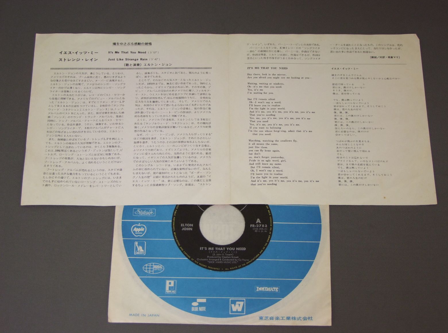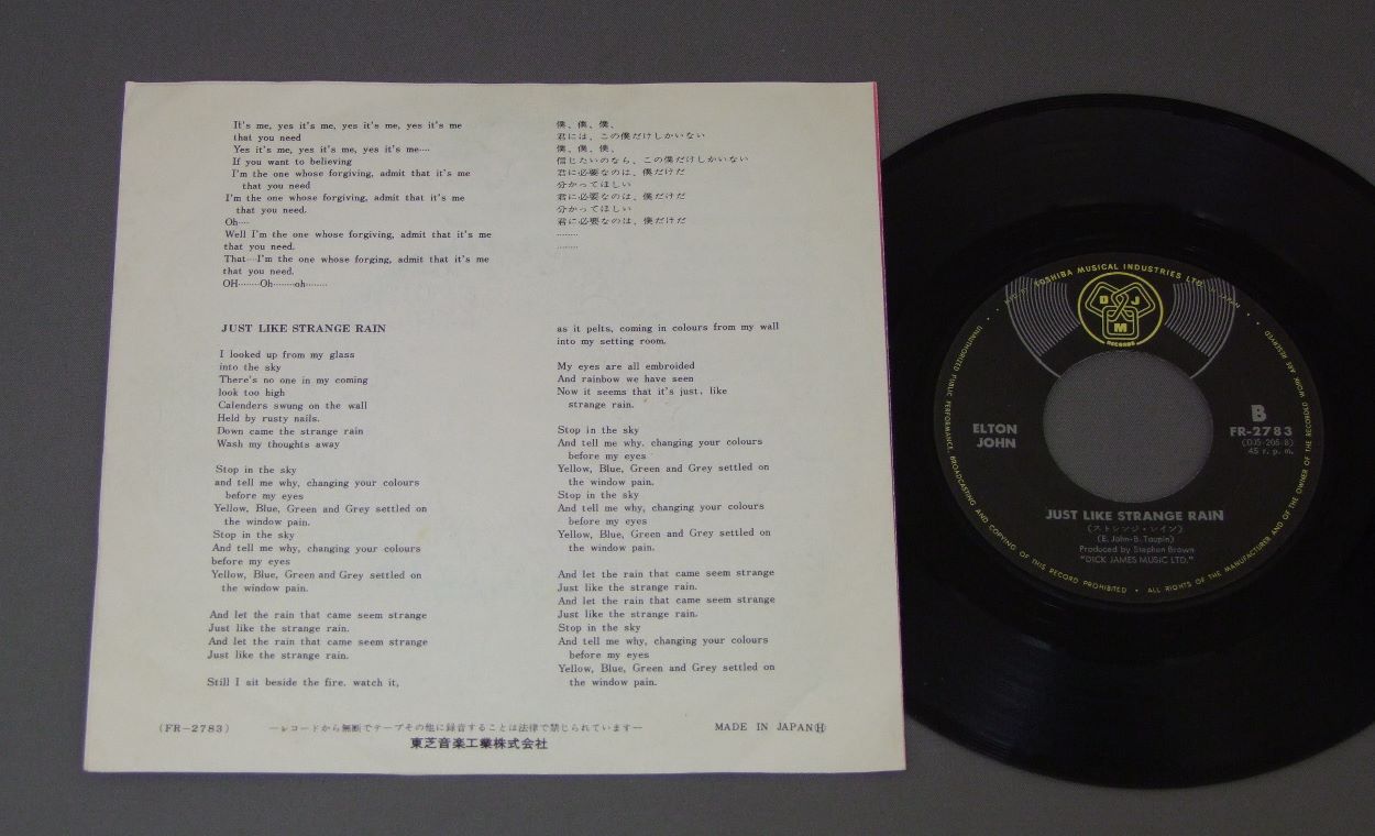 ELTON JOHNエルトン・ジョン/IT`S ME THAT YOU NEEDイエス・イッツ・ミー FR2783 製造国:日本盤 / Media:7inch外観:EX-盤の状態:EX+ 価格(税込):¥770(売約済) 送料 7inch:定形外郵便 360円~LP:定形外郵便 660円~送料は、注文の最終画面で確認頂けます。 > > ELTON JOHN/IT`S ME THAT YOU NEED 外観 (EX-)特記事項:特記なし。外観EX-の共通説明:ダメージ軽度~多少。 中古品としては普通の状態。シミ、ヨゴレ、スレなど軽く~多少。 盤の状態 (EX+)特記事項:薄いスリキズ・スレ少し。一見してきれいな状態です。盤EX+の共通説明:盤面の極薄いスリキズ、スレ少し程度 音に出そうなものは無いように見える(極軽微なソフトティック音は除く)。 Tweet それぞれの画像をクリックすると、大きい写真が見られます こちらの商品もお勧めです 880円 PAUL RODGERSポール・ロジャース / CUT LOOSEカット・ルース 770円 JOHN DAVIDSONジョン・デヴィッドソン / MY BEST TO YOUこの胸のときめきを 770円 YVES MONTANDイヴ・モンタン / LE PARIS DE… YVES MONTANDモンタン. パリの心を歌う 662円 RICK SPRINGFIELDリック・スプリングフィールド / LIVING IN OZリビング・イン・OZ 660円 GLEN CAMPBELLグレン・キャンベル / COMING HOMEカミング・ホーム 440円 JOHNNY MATHISジョニー・マチス / LOVE IS BLUE恋はみずいろ 550円 ERIC CARMENエリック・カルメン / BEST OF ERIC CARMENベスト・オブ・エリック・カルメン 770円 J.D. SOUTHERJ.D.サウザー / HOME BY DAWNロマンティック・ナイト