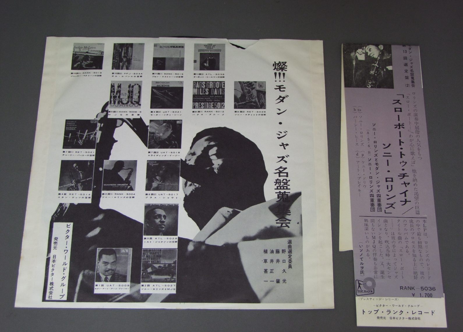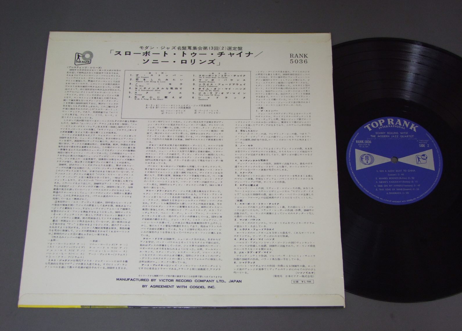 SONNY ROLLINS WITH THE MODERN JAZZ QUARTETソニー・ロリンズとモダン・ジャズ四重奏団/ON A SLOW BOAT TO CHINAスローボード・トゥ・チャイナ ペラジャケ RANK5036 製造国:日本盤 / Media:LP外観:EX盤の状態:EX 価格(税込):¥3,300(売約済) 送料 7inch:定形外郵便 360円~LP:定形外郵便 660円~送料は、注文の最終画面で確認頂けます。 > > SONNY ROLLINS WITH THE MODERN JAZZ QUARTET/ON A SLOW BOAT TO CHINA 外観 (EX)特記事項:特記なし。外観EXの共通説明:ダメージが限定的。中古品としては保存状態がよい方。シミ、ヨゴレ、スレ 少し~軽度。 盤の状態 (EX)特記事項:薄いスリキズ・スレ軽くある感じ。一見してきれいな印象です。盤EXの共通説明:盤面のスリキズが薄いものが少し~軽度 音に出そうなものは無いように見える(軽微なソフトティック音は除く)。 帯の状態 ():裏で切れ有り。 Tweet それぞれの画像をクリックすると、大きい写真が見られます こちらの商品もお勧めです 440円 MOE KOFFMAN / GOES ELECTRIC 1,210円 CLIFORD BROWN ALL STARSクリフォード・ブラウン・オール・スターズ / CARAVAN AUTUMN IN NEW YORKキャラバン 990円 MEL POWELLメル・パウエル / OUT ON A LIMBアウト・オン・ア・リム 1,210円 RAY BROWN & MILT JACKSONレイ・ブラウンとミルト・ジャクソン / BROWN & JACKSON 1,210円 THAD JONES & MEL LEWISサド・ジョーンズ&メル・ルイス・オーケストラ / POTPOURRIポプーリ 1,210円 JAMES MOODYジェームス・ムーディ / EMARCY JAMES MOODY - THE COMPLETE MOODY STORYコンプリート・ジェームス・ムーディ・オン・エマーシー 990円 MODERN JAZZ QUARTETモダン・ジャズ・カルテット / TOGETHER AGAINトゥゲザー・アゲイン 660円 EDDIE CONDONエディ・コンドン / CONDON A LA CARTEコンドン・ア・ラ・カルト