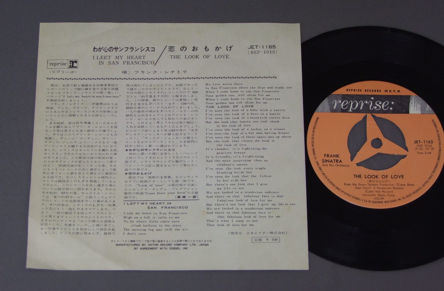 FRANK SINATRAフランク・シナトラ/I LEFT MY HEART IN SAN FRANCISCOわが心のサンフランシスコ JET1165 製造国:日本盤 / Media:7inch外観:EX-盤の状態:EX+ 価格(税込):¥440 送料 7inch:定形外郵便 360円~LP:定形外郵便 660円~送料は、注文の最終画面で確認頂けます。 > > FRANK SINATRA/I LEFT MY HEART IN SAN FRANCISCO 外観 (EX-)特記事項:表裏共に薄いシミ多少有り。外観EX-の共通説明:ダメージ軽度~多少。 中古品としては普通の状態。シミ、ヨゴレ、スレなど軽く~多少。 盤の状態 (EX+)特記事項:極薄いスリキズ・スレ少し。一見してきれいな状態です。盤EX+の共通説明:盤面の極薄いスリキズ、スレ少し程度 音に出そうなものは無いように見える(極軽微なソフトティック音は除く)。 Tweet それぞれの画像をクリックすると、大きい写真が見られます こちらの商品もお勧めです 990円 CLEO LAINEクレオ・レーン / RETURN TO CARNEGIEリターン・トゥ・カーネギー 1,980円 ANLI SUGANOアンリ菅野 / SWEET MEMORY SPECIAL DJ COPYスイート・メモリー SPECIAL DJ COPY 770円 KANEKO HARUMI金子晴美 / SPECIAL MENU 770円 NANCY WILSONナンシー・ウィルソン / I`LL BE A SONGアイル・ビー・ア・ソング 1,320円 AL JARREAUアル・ジャロウ / L IS FOR LOVERL・イズ・フォー・ラヴァー 770円 MITCH MILLER AND THE GANGミッチ・ミラー合唱団 / HOME CHORUS PARTY VOL2 60s ISSUEホーム・コーラス・パーティ 第2集 ペラジャケ 1,210円 BUDDY GRECOバディ・グレコ / MY BUDDY ( RECORDED AT LE BISTRO RUSH STREET CHICAGO )マイ・バディ (シカゴ ラッシュ・ストリート ル・ビストロにおける実況録音) 990円 CLEO LAINE & JAMES GALWAYクレオ・レーン&ジェームズ・ゴールウェイ / SOMETIMES WHEN WE TOUCHベスト・フレンズ?
