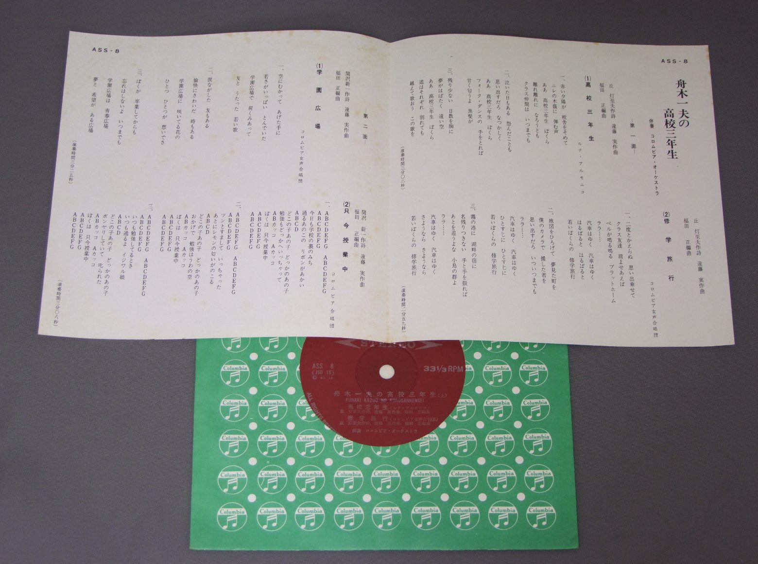 KAZUO FUNAKI舟木一夫/HIGH SCHOOL 3rd YEAR EP舟木一夫の高校三年生 4曲入 ASS8 製造国:日本盤 / Media:7inch外観:EX-盤の状態:EX 価格(税込):¥2,008(売約済) 送料 7inch:定形外郵便 360円~LP:定形外郵便 660円~送料は、注文の最終画面で確認頂けます。 > > KAZUO FUNAKI/HIGH SCHOOL 3rd YEAR EP 外観 (EX-)特記事項:見開きや裏ジャケに薄いシミやよごれ。外観EX-の共通説明:ダメージ軽度~多少。 中古品としては普通の状態。シミ、ヨゴレ、スレなど軽く~多少。 盤の状態 (EX)特記事項:薄いスリキズ・スレ軽くある感じ。殆どが軽微なものの様子です。盤EXの共通説明:盤面のスリキズが薄いものが少し~軽度 音に出そうなものは無いように見える(軽微なソフトティック音は除く)。 Tweet それぞれの画像をクリックすると、大きい写真が見られます こちらの商品もお勧めです 770円 KEIKO MARUYAMA丸山圭子 / HARU-SHIGURE春しぐれ 1,210円 JUN MAYUZUMI TOMOKO OGAWA & CHIYO OKUMURA黛ジュン・小川知子・奥村チヨ / JUN TOMOKO CHIYOジュン・知子・チヨ 第二集 770円 KUMIKO YAMASHITA山下久美子 / BABY BABY 1,870円 TAKURO YOSHIDAよしだたくろう / ON STAGEオン・ステージ ともだち 1,320円 CHA-CHAチャ・チャ / HITOMI NO-NAKA-NO TAKARAJIMA瞳の中の宝島 770円 I SEONG-AE季成愛 / SAYONARAさよなら - 演歌の源流を探る 770円 CHAGE & ASUKAチャゲ&飛鳥 / CHAGE & ASUKA 421世紀 990円 CAROLキャロル / 1975 4.13.1975 4.13.