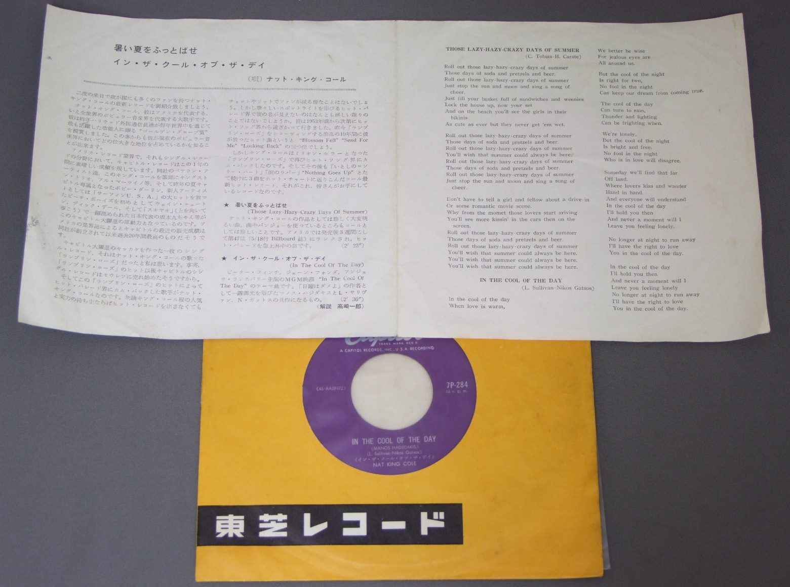 NAT KING COLEナット・キング・コール/THOSE LAZY-HAZY- CRAZI DAYS OF SUMMER暑い夏をふっとばせ 7P284 製造国:日本盤 / Media:7inch外観:EX-盤の状態:EX- 価格(税込):¥660(売約済) 送料 7inch:定形外郵便 360円~LP:定形外郵便 660円~送料は、注文の最終画面で確認頂けます。 > > NAT KING COLE/THOSE LAZY-HAZY- CRAZI DAYS OF SUMMER 外観 (EX-)特記事項:ヨレやや有り。外観EX-の共通説明:ダメージ軽度~多少。 中古品としては普通の状態。シミ、ヨゴレ、スレなど軽く~多少。 盤の状態 (EX-)特記事項:薄いスリキズ・細かい表面スレ多少ある感じ。殆どが軽微なものの様子です。盤EX-の共通説明:盤面のスリキズが多少有り。音に出そうなものは殆ど無いように見える~さほど気にならないぐらいの軽いプチ数カ所程度。 Tweet それぞれの画像をクリックすると、大きい写真が見られます こちらの商品もお勧めです 1,320円 DINAH WASHINGTONダイナ・ワシントン / DINAH JAMSウィズ・クリフォード・ブラウン 1,210円 BUDDY GRECOバディ・グレコ / MY BUDDY ( RECORDED AT LE BISTRO RUSH STREET CHICAGO )マイ・バディ (シカゴ ラッシュ・ストリート ル・ビストロにおける実況録音) 1,210円 MATT DENNISマット・デニス / PLAY MELANCHOLY BABYプレイ・メランコリー・ベイビー 1,210円 CLEO LAINEクレオ・レーン / BORN ON A FRIDAY金曜日のクレオ 1,320円 CLEO LAINEクレオ・レーン / AT THE WAVENDON FESTIVALジス・イズ・クレオ -クレオ・レーン・アット・ザ・ウェイヴンドン- 770円 PEGGY LEEペギー・リー / CRAZY IN THE HEART乱るる心 990円 NANCY WILSONナンシー・ウィルスン / NANCY WILSON BEST 20ナンシー・ウィルスン・ベスト20 770円 BRENDA LEEブレンダ・リー / BEST OF BRENDA LEEブレンダ・リー大全集
