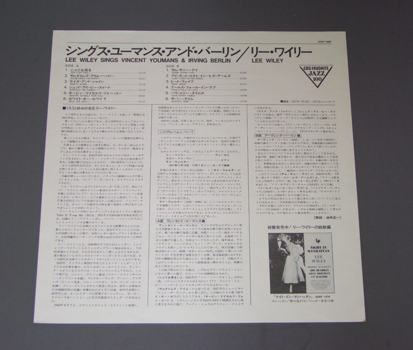 LEE WILEYリー・ワイリー/LEE WILEY SINGS VINCENT YOUMANS & IRVING BERLINシングス・ユーマンス・アンド・バーリン 20AP1496 製造国:日本盤 / Media:LP外観:EX-盤の状態:EX+ 価格(税込):¥1,320(売約済) 送料 7inch:定形外郵便 360円~LP:定形外郵便 660円~送料は、注文の最終画面で確認頂けます。 > > LEE WILEY/LEE WILEY SINGS VINCENT YOUMANS & IRVING BERLIN 外観 (EX-)特記事項:上ヘリにスレ。底抜け有。表ジャケ上の方にスレ。外観EX-の共通説明:ダメージ軽度~多少。 中古品としては普通の状態。シミ、ヨゴレ、スレなど軽く~多少。 盤の状態 (EX+)特記事項:極薄いスリキズ・スレ少し。一見してきれいな状態です。盤EX+の共通説明:盤面の極薄いスリキズ、スレ少し程度 音に出そうなものは無いように見える(極軽微なソフトティック音は除く)。 Tweet それぞれの画像をクリックすると、大きい写真が見られます こちらの商品もお勧めです 880円 V-DISC ALL-STAR JAM SESSIONSVディスク・オールスター・ジャムセッション / V-DISC ALL-STAR JAM SESSIONSVディスク・オールスター・ジャムセッション VOL.5 990円 JAY HOGGARDジェイ・ホガード / LOVE SURVIVESラヴ・サーヴァイブズ 770円 NEW ORLEANS RASCALSニューオリンズ・ラスカルズ / 20th ANNIVERSARY CONCERT20th アニバーサリー・コンサート 770円 COZY COLE - RED NORVO etcコジー・コール - レッド・ノーヴォ他 / ALL STAR SESSIONSオール・スター・セッション 1,650円 MASABUMI KIKUCHI + GIL EVANS菊池雅章 / SAME TITLEWITH ギル・エヴァンス 990円 JOSHUA RIFKINジョシュア・リフキン / PIANO RAGS BY SCOTT JOPLINスコット・ジョプリンの芸術 770円 BUDDY GRECOバディ・グレコ / BIG BAND&BALLADSビッグ・バンド・アンド・バラード 770円 TOSHIYUKI ICHIMURA市村俊幸 / MY LIFE MY PIANO