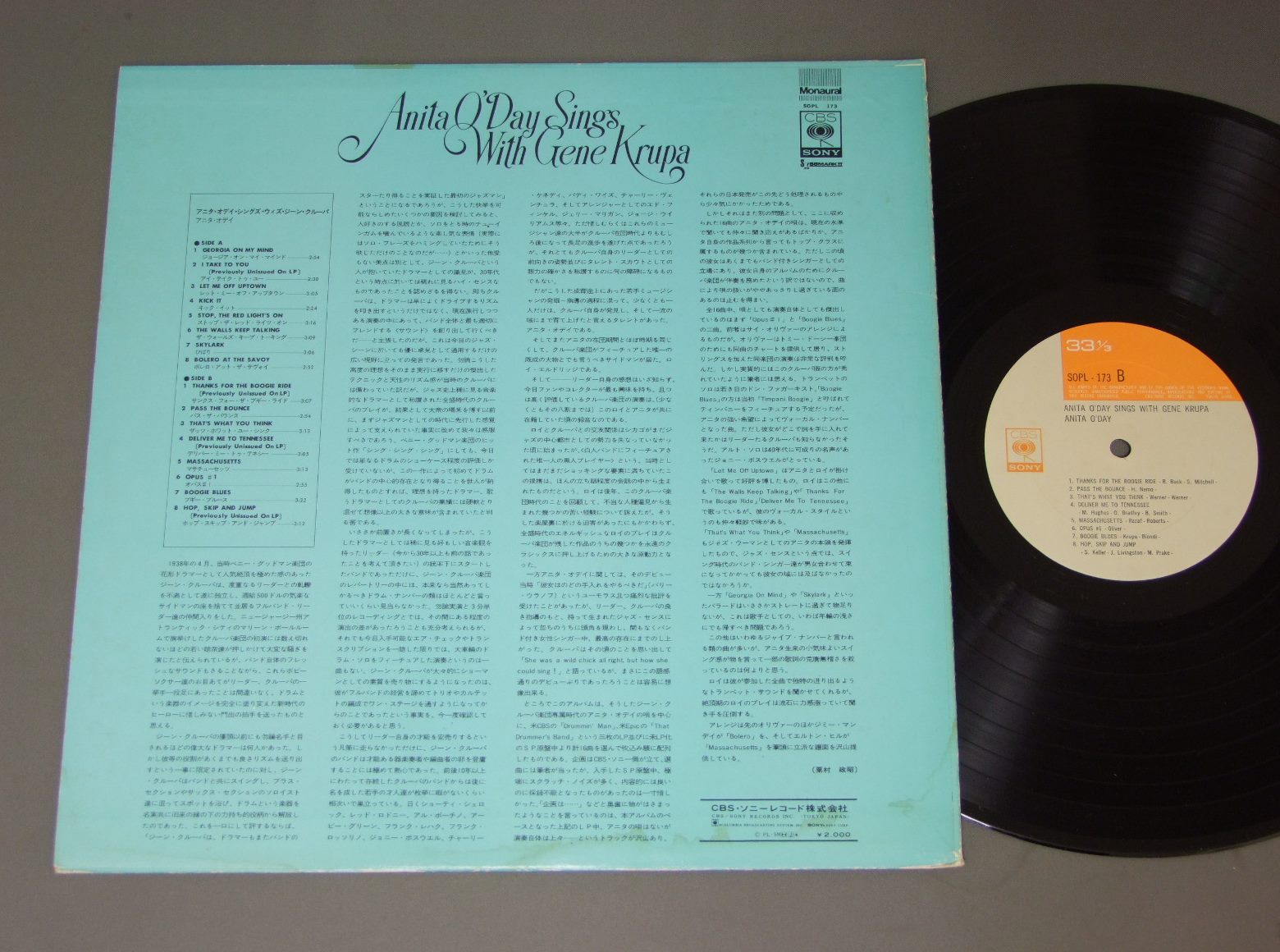 ANITA O`DAY/ANITA O`DAY SINGS WITH GENE KRUPA SOPL173 製造国:日本盤 / Media:LP外観:VG+盤の状態:EX+ 価格(税込):¥880(売約済) 送料 7inch:定形外郵便 360円~LP:定形外郵便 660円~送料は、注文の最終画面で確認頂けます。 > > ANITA O`DAY/ANITA O`DAY SINGS WITH GENE KRUPA 外観 (VG+)特記事項:背や上下ヘリスレ大。上ヘリとその付近にシミ。背下から底にかけてウオーターダメージ有り。外観VG+の共通説明:ダメージやや有り。シミ、ヨゴレ、スレなど多少~やや多め。 盤の状態 (EX+)特記事項:極薄いスリキズ・スレ少し。一見してきれいな状態です。盤EX+の共通説明:盤面の極薄いスリキズ、スレ少し程度 音に出そうなものは無いように見える(極軽微なソフトティック音は除く)。 Tweet それぞれの画像をクリックすると、大きい写真が見られます こちらの商品もお勧めです 990円 KEI MARIMURA真梨邑ケイ / MOOD INDIGOムード・イン・インディゴ 1,320円 SWINGLE SINGERSスイングル・シンガール / JAZZ SEBASTIEN BACHジャズ・セバスチャン・バッハ 1,320円 STEVE MARCH etcスティーブ・マーチ他 / SWINGスイング 990円 MARI NAKAMOTO中本マリ / LOVE TOUCHLOVE TOUCH 880円 MAEDA SISTERS前田姉妹 / GERSHWINGガーシュイン 1,980円 ANLI SUGANOアンリ菅野 / SWEET MEMORY SPECIAL DJ COPYスイート・メモリー SPECIAL DJ COPY 770円 TONY MARTINトニー・マーティン / HIS GREATEST HITS 770円 NANCY WILSONナンシー・ウィルスン / BUT BEAUTIFULバット・ビューティフル