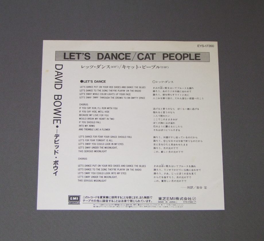 DAVID BOWIEデビット・ボウイ/LET`S DANCEレッツ・ダンス EYS17350 製造国:日本盤 / Media:7inch外観:EX盤の状態:EX+ 価格(税込):¥770(売約済) 送料 7inch:定形外郵便 360円~LP:定形外郵便 660円~送料は、注文の最終画面で確認頂けます。 > > DAVID BOWIE/LET`S DANCE 外観 (EX)特記事項:特記なし。外観EXの共通説明:ダメージが限定的。中古品としては保存状態がよい方。シミ、ヨゴレ、スレ 少し~軽度。 盤の状態 (EX+)特記事項:極薄いスリキズ・スレ少し。一見してきれいな状態です。盤EX+の共通説明:盤面の極薄いスリキズ、スレ少し程度 音に出そうなものは無いように見える(極軽微なソフトティック音は除く)。 Tweet それぞれの画像をクリックすると、大きい写真が見られます こちらの商品もお勧めです