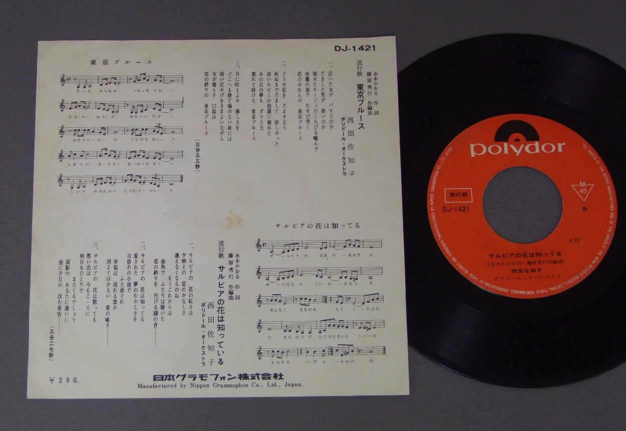 SAWAKO NISHIDA西田佐知子/東京ブルース DJ1421 製造国:日本盤 / Media:7inch外観:EX-盤の状態:VG+ 価格(税込):¥550(売約済) 送料 7inch:定形外郵便 360円~LP:定形外郵便 660円~送料は、注文の最終画面で確認頂けます。 > > SAWAKO NISHIDA/ 外観 (EX-)特記事項:裏側にシミが少し。ヨレ多少有り。外観EX-の共通説明:ダメージ軽度~多少。 中古品としては普通の状態。シミ、ヨゴレ、スレなど軽く~多少。 盤の状態 (VG+)特記事項:薄いスリキズ・細かいスレやや多め。全体的には軽微なものが中心です。少し聴いてみましたが、音自体はしっかり鳴っているようでした。盤VG+の共通説明:盤面にスリキズが多少~やや有り、音に出そうなものも多少ある。 Tweet それぞれの画像をクリックすると、大きい写真が見られます こちらの商品もお勧めです 770円 MANABU MIYAHARA宮原学 / READY STEADY GO 770円 HIROMI OHTA大田裕美 / 12 PAGES POETRY12ページの詩集 770円 HIROMI IWASAKI岩崎宏美 / AOZORAあおぞら 770円 CANDIESキャンディーズ / CANDY LABELキャンディ・レーベル 1,320円 SHOGO HAMADA浜田省吾 / SAND CASTLE 990円 HATUMI SHIBATAしばたはつみ / BEST 16マイ・ラグジュアリー・ナイト しばたはつみ ベスト16 550円 MIKI ASAKURA麻倉未稀 / HERO & HEROINEHERO & HEROINE 1,210円 ALFIEアルフィー / GREENHORN ( VICTOR YEARS 1974-76 ) + OUTER COVERGREENHORN ( VICTOR YEARS 1974-76 ) + オリジナル外袋