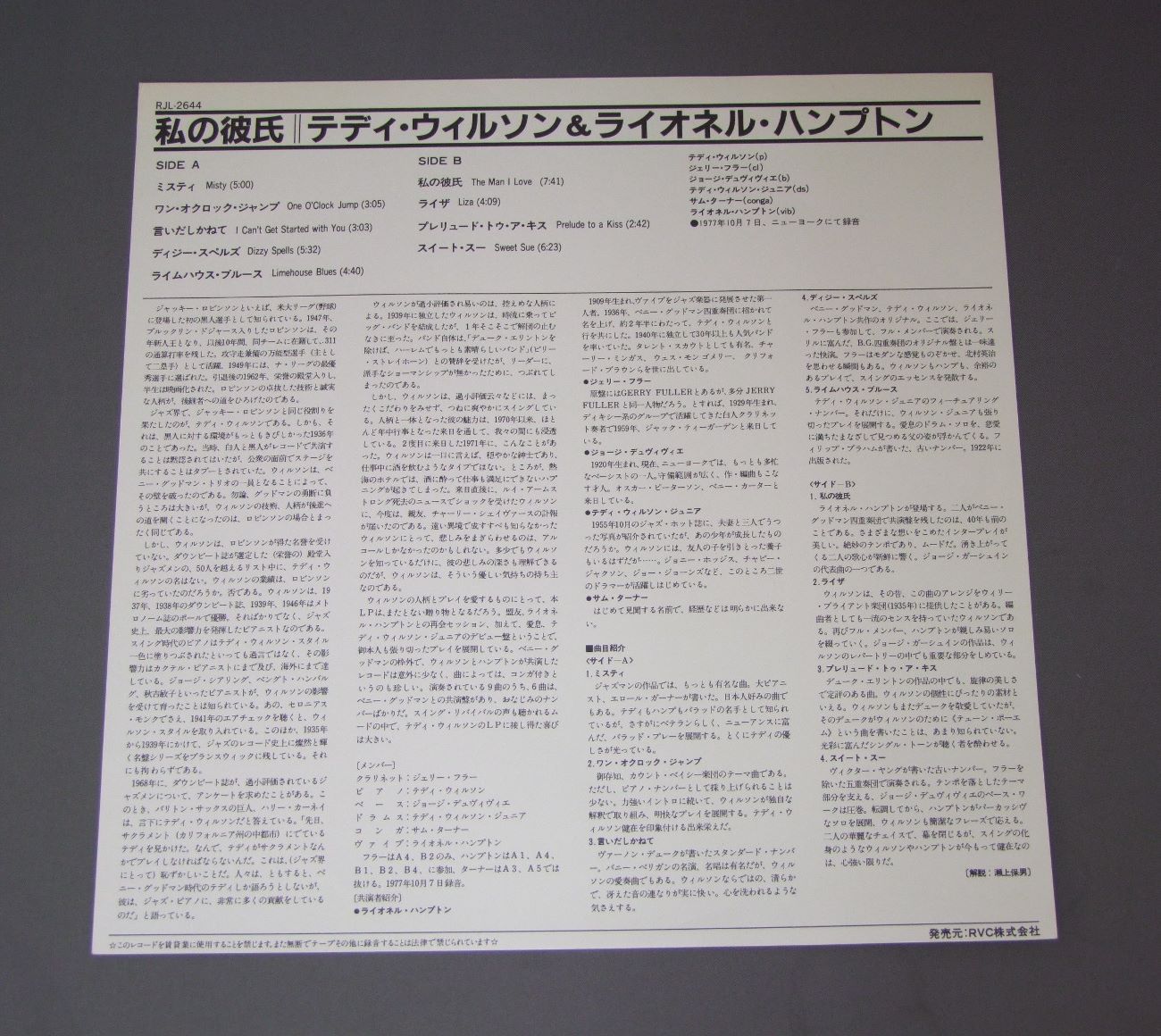 TEDDY WILSON/LIONEL HAMPTON PREENTS TEDDY WILSON私の彼氏 RJL2644 製造国:日本盤 / Media:LP外観:EX-盤の状態:EX+ 価格(税込):¥1,320(売約済) 送料 7inch:定形外郵便 360円~LP:定形外郵便 660円~送料は、注文の最終画面で確認頂けます。 > > TEDDY WILSON/LIONEL HAMPTON PREENTS TEDDY WILSON 外観 (EX-)特記事項:表裏ジャケ共にシミ多少、日焼感多少有り。外観EX-の共通説明:ダメージ軽度~多少。 中古品としては普通の状態。シミ、ヨゴレ、スレなど軽く~多少。 盤の状態 (EX+)特記事項:極薄いスリキズ・スレ少し。一見してきれいな状態です。盤EX+の共通説明:盤面の極薄いスリキズ、スレ少し程度 音に出そうなものは無いように見える(極軽微なソフトティック音は除く)。 Tweet それぞれの画像をクリックすると、大きい写真が見られます こちらの商品もお勧めです 1,320円 BENNY GOODMANベニー・グッドマン / BENNY`S BOP VOL.2ベニーズ・バップ 第2集 440円 BENNY GOODMAN & HIS ORCHESTRA / HISTORICAL RECORDINGS 1935-39 770円 BENNY GOODMAN BANDベニー・グッドマン・バンド / BENNY GOODMAN BAND 770円 HARRY JAMESハリー・ジェイムス / V-DISC CATS PARTY 1,210円 JIMMY DORSEY etc / GREAT BIG BAND ON V-DISC黄金時代のビッグバンド名演集 990円 BENNY GOODMAN TRIOベニー・グッドマン・トリオ / PLAYS FOR THE FLETCHER HENDERSON FUNDプレイズ・フォー・ザ・フレッチャー・ヘンダーソン 660円 TEDDY WILSON / THREE LITTLE WORDS 770円 GLENN MILLERグレン・ミラー / OPERATION GLENN MILLERグレン・ミラー作戦