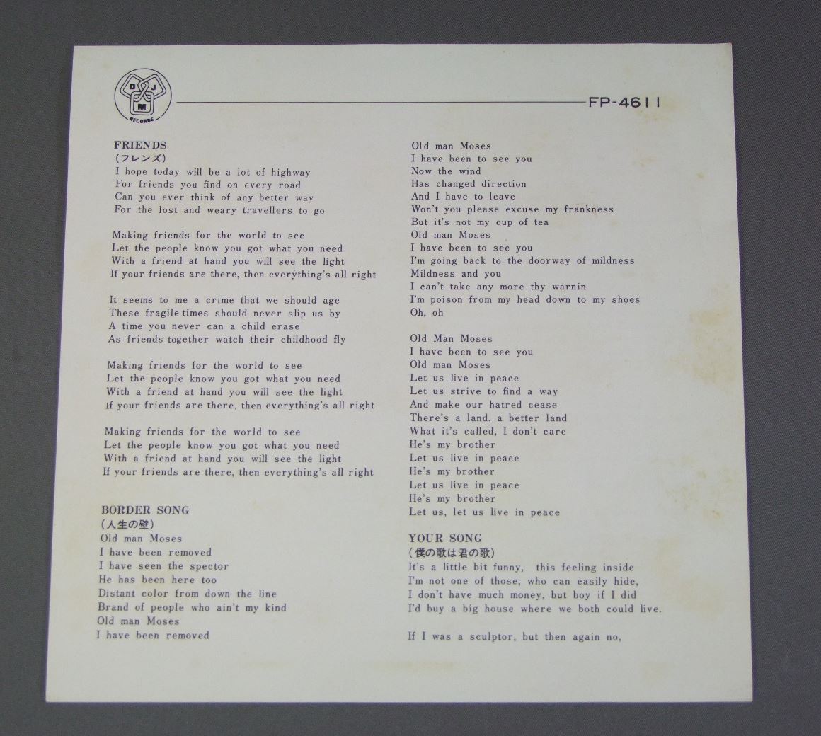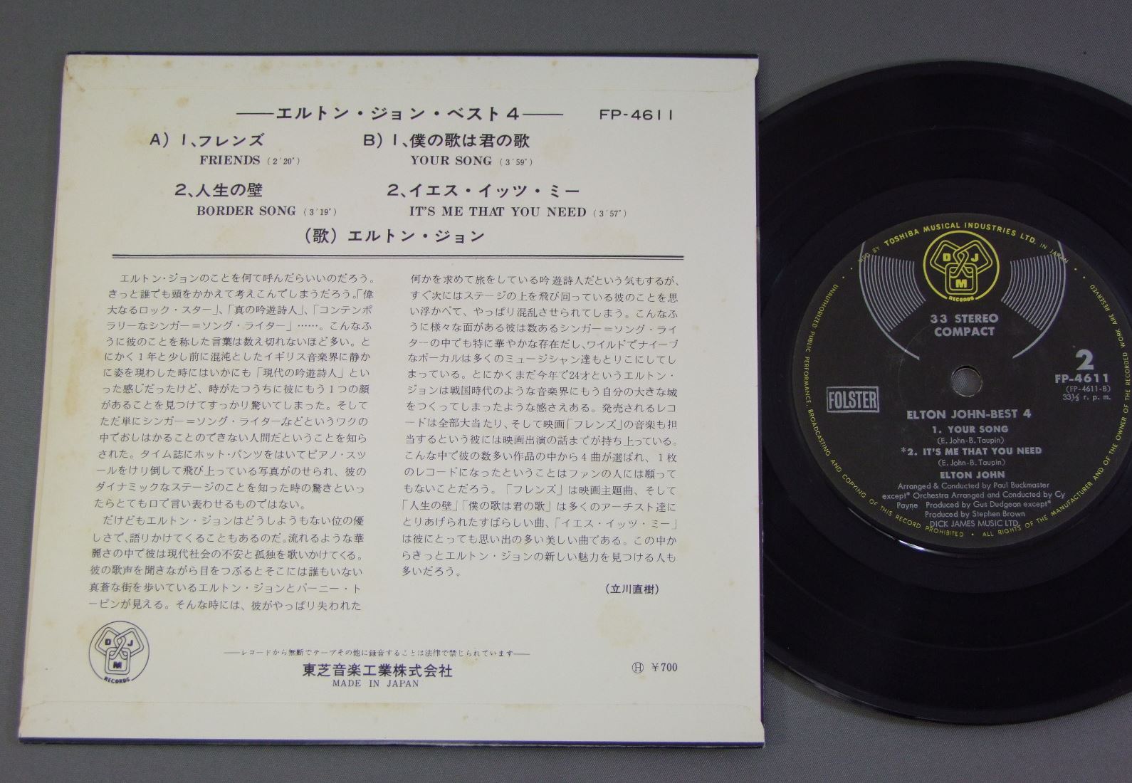 ELTON JOHNエルトン・ジョン/ELTON JOHN BEST4エルトン・ジョン・ベスト4 FP4611 製造国:日本盤 / Media:7inch外観:EX-盤の状態:EX- 価格(税込):¥440(売約済) 送料 7inch:定形外郵便 360円~LP:定形外郵便 660円~送料は、注文の最終画面で確認頂けます。 > > ELTON JOHN/ELTON JOHN BEST4 外観 (EX-)特記事項:裏側や歌詞カードにシミ外観EX-の共通説明:ダメージ軽度~多少。 中古品としては普通の状態。シミ、ヨゴレ、スレなど軽く~多少。 盤の状態 (EX-)特記事項:薄いスリキズ・細かい表面スレ軽くある感じです。プチ出そうな所は少し。軽微なものが中心の様子です。盤EX-の共通説明:盤面のスリキズが多少有り。音に出そうなものは殆ど無いように見える~さほど気にならないぐらいの軽いプチ数カ所程度。 Tweet それぞれの画像をクリックすると、大きい写真が見られます こちらの商品もお勧めです 770円 JOHN DENVERジョン・デンバー / DREAMLAND EXPRESSドリームランド・エクスプレス 770円 NEIL DIAMONDニール・ダイアモンド / RAINBOWレインボー 660円 ERIC CARMENエリック・カルメン / TONIGHT YOU`RE MINEトゥナイト・ユー・アー・マイン 1,210円 PAUL PARRISHポール・パリッシュ / SONG FOR A YOUNG GIRLソング・フォー・ア・ヤング・ガール 1,320円 BOBBY SHERMANボビー・シャーマン / DE LUXEデ・ラックス 1,210円 WILLIE NELSONウィリー・ネルソン / PARTNERSサムシング 880円 RUPERT HOLMESルパート・ホルムズ / ADVENTUREアドヴェンチャー 770円 J.D. SOUTHERJ.D.サウザー / HOME BY DAWNロマンティック・ナイト