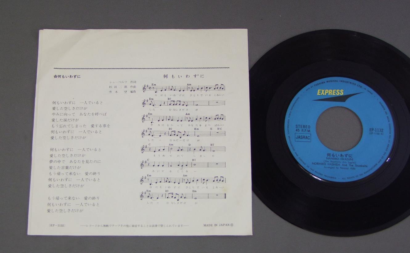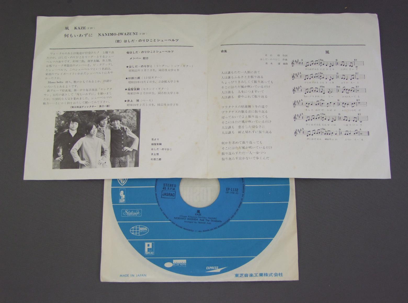 NORIHIKO HASHIDA & THE SHOEBELTSはしだのりひことシューベルツ/風 EP1132 製造国:日本盤 / Media:7inch外観:EX-盤の状態:EX 価格(税込):¥440(売約済) 送料 7inch:定形外郵便 360円~LP:定形外郵便 660円~送料は、注文の最終画面で確認頂けます。 > > NORIHIKO HASHIDA & THE SHOEBELTS/ 外観 (EX-)特記事項:多少ヨレ有り。見開きにシミ。外観EX-の共通説明:ダメージ軽度~多少。 中古品としては普通の状態。シミ、ヨゴレ、スレなど軽く~多少。 盤の状態 (EX)特記事項:薄いスリキズ・スレ軽くある感じ。一見してきれいな印象です。盤EXの共通説明:盤面のスリキズが薄いものが少し~軽度 音に出そうなものは無いように見える(軽微なソフトティック音は除く)。 Tweet それぞれの画像をクリックすると、大きい写真が見られます こちらの商品もお勧めです 1,650円 5 BALLOONS五つの赤い風船 / `75 1,980円 FURIDO古井戸 / POESYぽえじー(3rd ALBUM) 1,980円 FRUIDO古井戸 / YESTERDAYSイエスタデイズ 770円 IRUKAイルカ / NOEL`S FANTASTIC TRIPノエルの不思議な冒険 770円 NATARSHER SEVENナターシャー・セブン / GOOD LOOKIN`道 世界のうた編 1,320円 TOKIKO KATOH AND KIYOSHI HASEGAWA加藤登紀子と長谷川きよし / LIVE 1,980円 JIRO`Sジローズ / BRAND NEW SONGS JORO`S 2新しい唄 ジローズ 2 880円 SHIGERU IZUMIYA泉谷しげる / LIVE IZUMIYAライブ!!泉谷 王様たちの夜