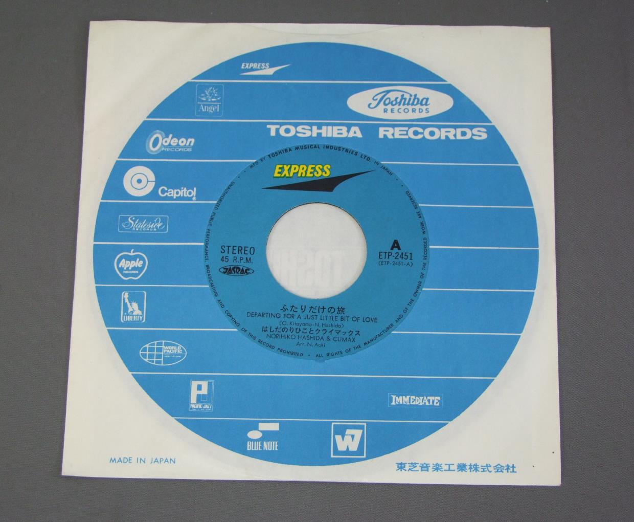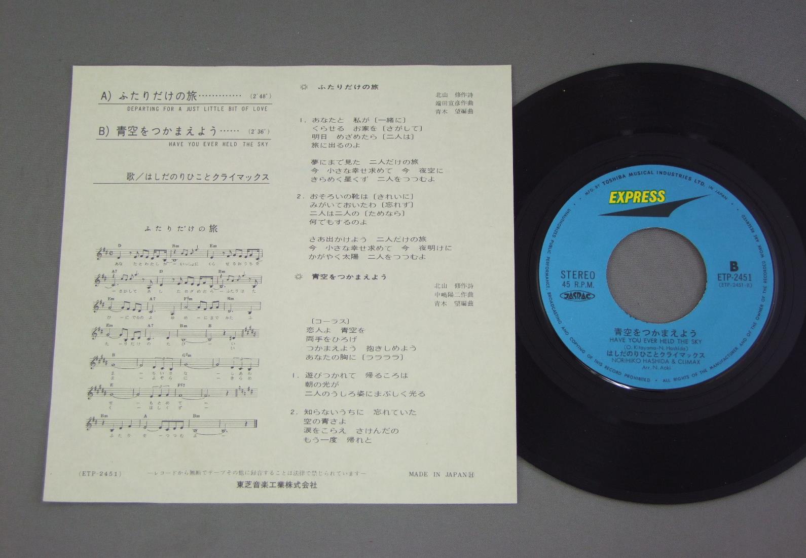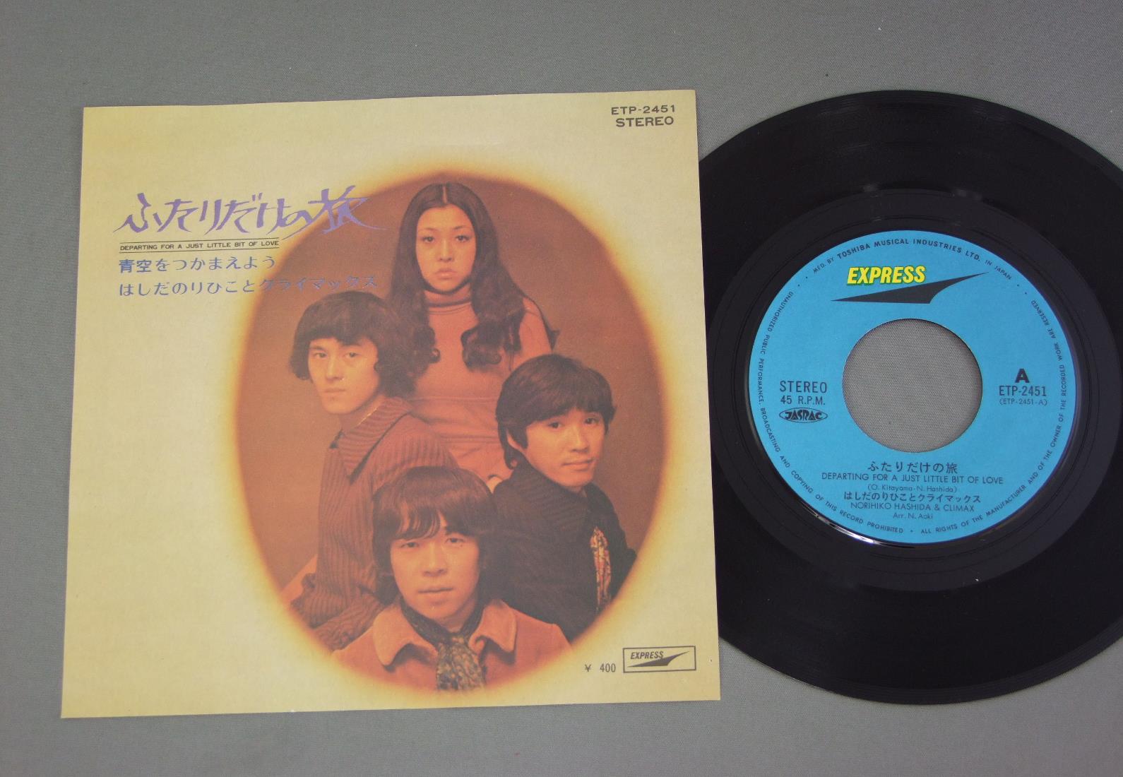 NORIHIKO HASHIDA& CLIMAXはしだのりひことクライマックス/DEPARTING FOR A JUST LITTLE BIT OF LOVEふたりだけの旅 ETP2451 製造国:日本盤 / Media:7inch外観:EX盤の状態:EX+ 価格(税込):¥440(売約済) 送料 7inch:定形外郵便 360円~LP:定形外郵便 660円~送料は、注文の最終画面で確認頂けます。 > > NORIHIKO HASHIDA& CLIMAX/DEPARTING FOR A JUST LITTLE BIT OF LOVE 外観 (EX)特記事項:特記なし。外観EXの共通説明:ダメージが限定的。中古品としては保存状態がよい方。シミ、ヨゴレ、スレ 少し~軽度。 盤の状態 (EX+)特記事項:極薄いスリキズ・スレ少し。一見してきれいな状態です。盤EX+の共通説明:盤面の極薄いスリキズ、スレ少し程度 音に出そうなものは無いように見える(極軽微なソフトティック音は除く)。 Tweet それぞれの画像をクリックすると、大きい写真が見られます こちらの商品もお勧めです 2,200円 KUMIKO YOKOI横井久美子 / LIVE 1979 AUTOGRAPHED1979 読売ホール サイン付 440円 CHANCHAKOちゃんちゃこ / 1st ALBUMちゃんちゃこファースト 1,980円 HAKO YAMAZAKI山崎ハコ / TUNAWATARI綱渡り 770円 NOBUYASU OKABAYASHI岡林信康 / SERENADEセレナーデ 1,320円 TAKASHI NISHIOKA西岡たかし / SOUPスープ 660円 KOUSETSU MINAMI南こうせつ / KAERIMICHIかえり道 1,320円 SHIGERU IZUMIYA泉谷しげる / 3rd ALBUM第三集 地球はお祭りさわぎ 1,980円 YUZO TOYAOTA豊田勇造 / LIVE拾得ライブ・走れアルマジロ