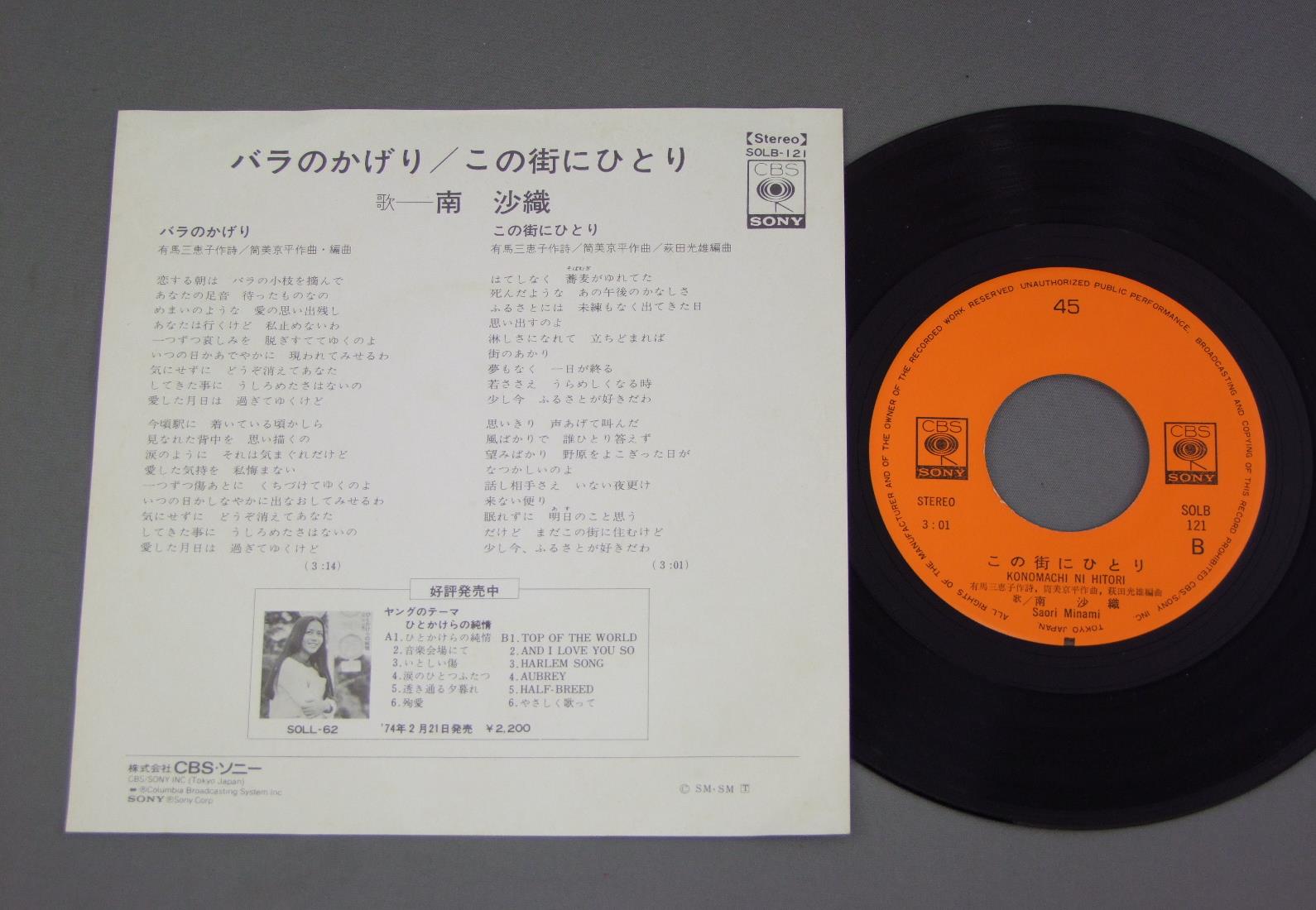 SAORI MINAMI南沙織/BARA NO KAGERIバラのかげり SOLB121 製造国:日本盤 / Media:7inch外観:EX盤の状態:EX+ 価格(税込):¥330 送料 7inch:定形外郵便 360円~LP:定形外郵便 660円~送料は、注文の最終画面で確認頂けます。 > > SAORI MINAMI/BARA NO KAGERI 外観 (EX)特記事項:裏側に薄いシミが少し。外観EXの共通説明:ダメージが限定的。中古品としては保存状態がよい方。シミ、ヨゴレ、スレ 少し~軽度。 盤の状態 (EX+)特記事項:極薄いスリキズ・スレ少し。一見してきれいな状態です。盤EX+の共通説明:盤面の極薄いスリキズ、スレ少し程度 音に出そうなものは無いように見える(極軽微なソフトティック音は除く)。 Tweet それぞれの画像をクリックすると、大きい写真が見られます こちらの商品もお勧めです 440円 YOU HAYAMI早見優 / MUSICミュージック 770円 SEIKO MATSUDA松田聖子 / CANDYキャンディー 880円 SONOKO KAWAI河合その子 / SONOKOその子 990円 YOSHIMI IWASAKI岩崎良美 / SAISONS (2nd ALBUM)セゾン(2nd ALBUM) 550円 CHIEMI堀ちえみ / KAZE NO SASAYAKI風のささやき 1,210円 ONYANKO CLUB河合その子 国生さゆり 城之内早苗 渡辺美奈子 渡辺満里奈 / MERRY X`MAS FOR YOU PICTURE DISCメリー・クリスマス・フォー・ユー 1,320円 ONYANKO CLUBおニャン子クラブ / MERRY X`MAS FOR YOU PIC DISCメリー・クリスマス・フォー・ユー 990円 SONOKO KAWAI河合その子 / SIESTAシエスタ