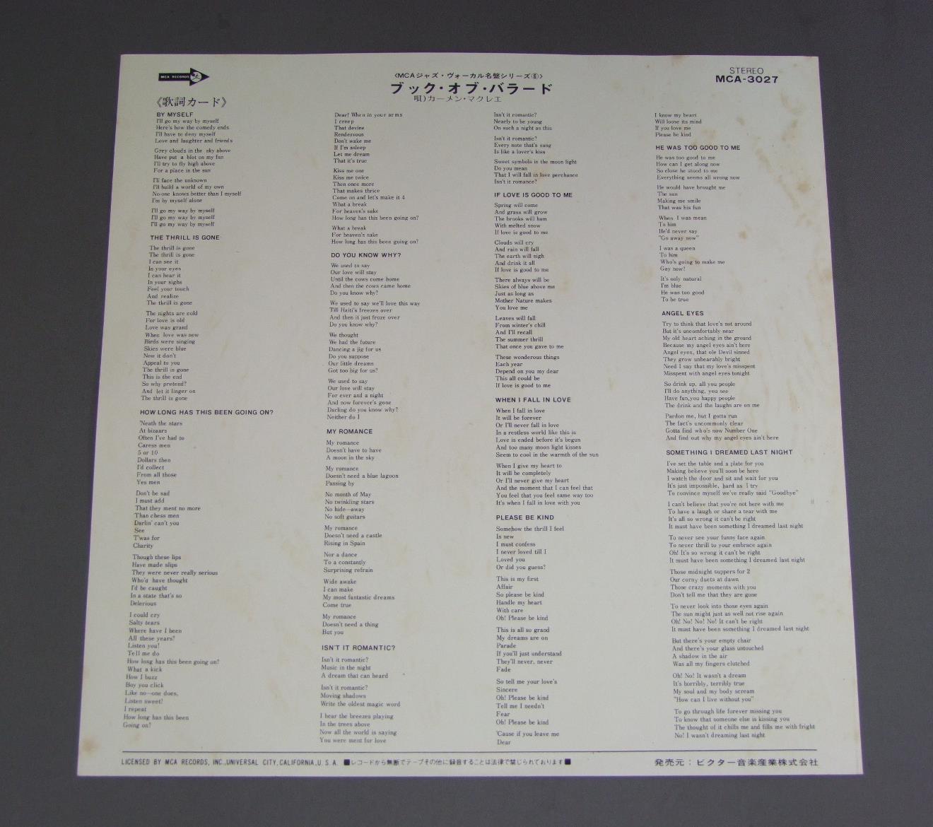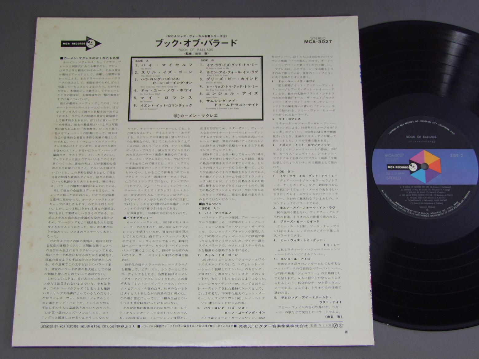 CARMEN MCRAE/BOOK OF BALLADS MCA3027 製造国:日本盤 / Media:LP外観:EX盤の状態:EX 価格(税込):¥1,100(売約済) 送料 7inch:定形外郵便 360円~LP:定形外郵便 660円~送料は、注文の最終画面で確認頂けます。 > > CARMEN MCRAE/BOOK OF BALLADS 外観 (EX)特記事項:裏ジャケ側は多少日焼け感有り。シミも有り。歌詞カードにシミ。外観EXの共通説明:ダメージが限定的。中古品としては保存状態がよい方。シミ、ヨゴレ、スレ 少し~軽度。 盤の状態 (EX)特記事項:薄いスリキズ・スレ軽くある感じ。殆どが軽微なものの様子です。盤EXの共通説明:盤面のスリキズが薄いものが少し~軽度 音に出そうなものは無いように見える(軽微なソフトティック音は除く)。 Tweet それぞれの画像をクリックすると、大きい写真が見られます こちらの商品もお勧めです 660円 KAZUMI BAND香津美バンド / TALK YOU ALL TIGHT頭狂好児唐眼 770円 NORIO MAEDA前田憲男 / FEELINGSフィーリング 1,320円 GATO BARBIERIガトー・バルビエリ / UNDER FIREアンダー・ファイア 880円 HARRIS SIMON GROUPハリス・サイモン・グループ / NEW YORK CONNECTIONニューヨーク・コネクション 770円 SINGERS UNLIMITEDシンガーズ・アンリミテッド / CAPELLAア・カペラ 770円 CHICK COREAチック・コリア / PIANO IMPROVISATIONS VOL1チック・コリア・ソロ VOL1 1,210円 BUCK CLAYTONバック・クレイトン・オールスターズ / HUCKLE-BUCK AND ROBBINS` NEST A BUCK CLAYTON JAM SESSIONバック・クレイトン・ジャム・セッション 1,320円 EDDIE COSTA TRIOエディ・コスタ・トリオ / HOUSE OF BLUE LIGHTSハウス・オブ・ブルー・ライツ