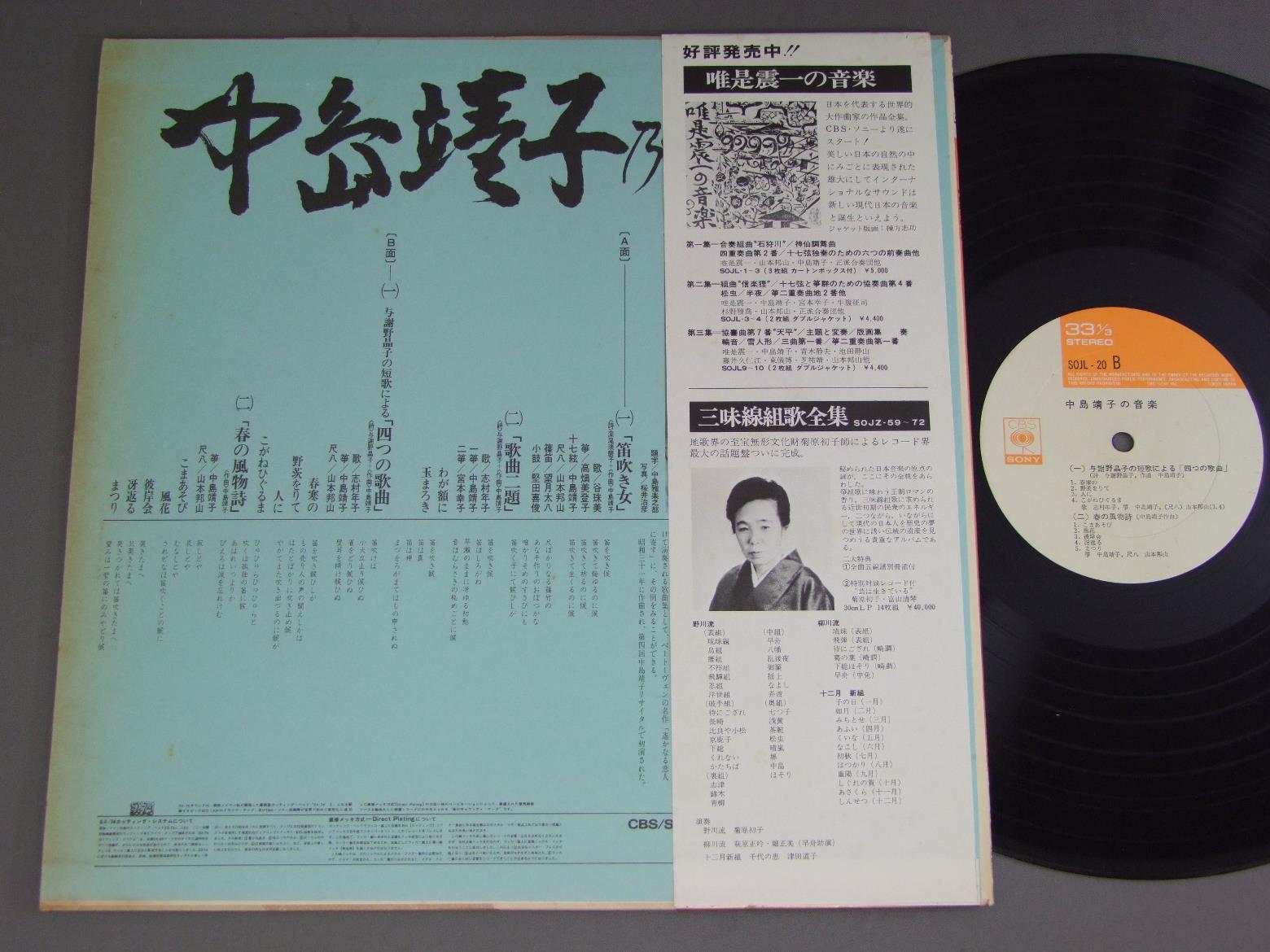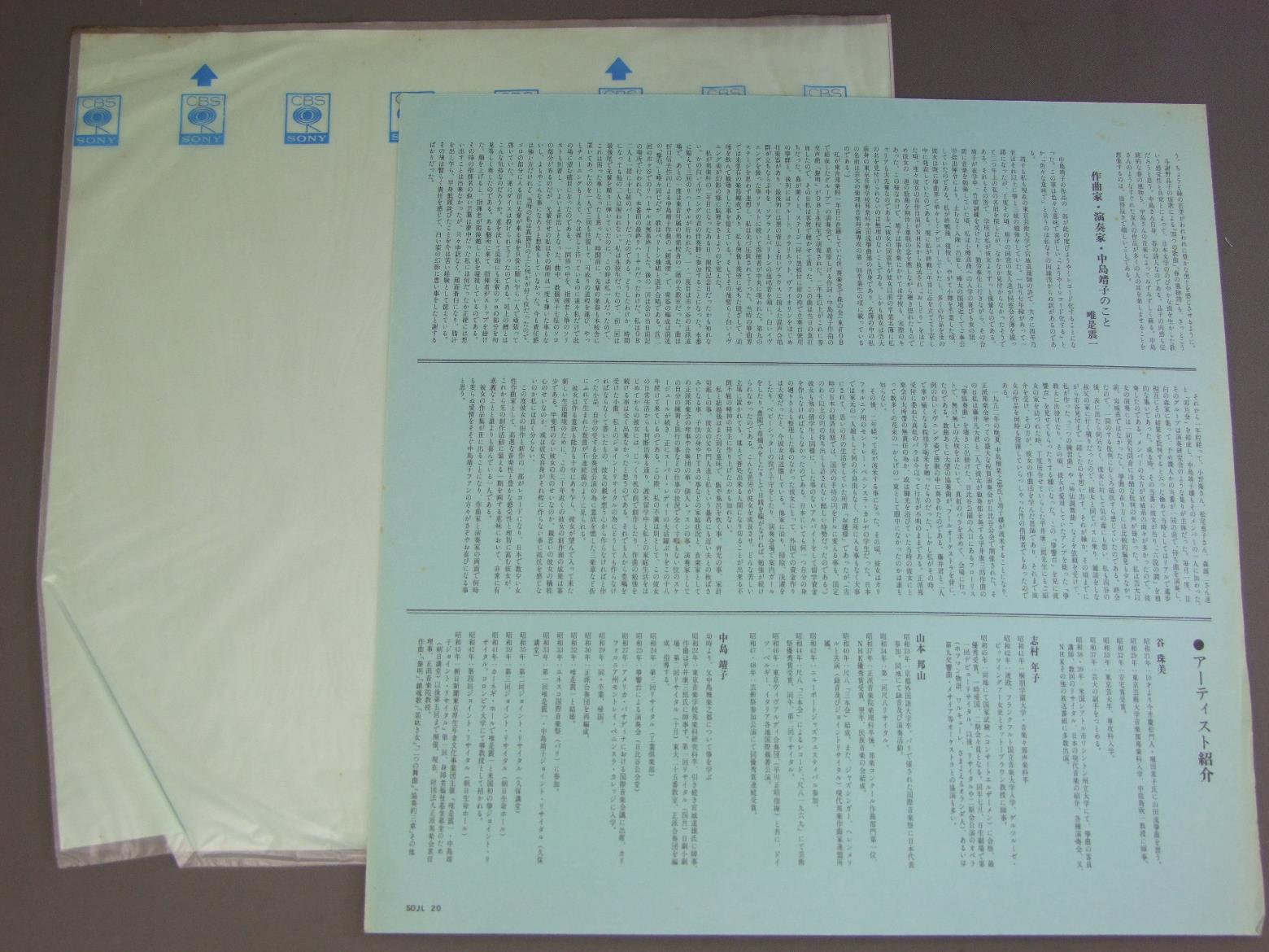 YASUKO NAKAJIMA中島靖子/中島靖子の音楽 SOJL20 製造国:日本盤 / Media:LP外観:EX-盤の状態:EX帯:EX- 価格(税込):¥1,210(売約済) 送料 7inch:定形外郵便 360円~LP:定形外郵便 660円~送料は、注文の最終画面で確認頂けます。 > > YASUKO NAKAJIMA/ 外観 (EX-)特記事項:表裏ジャケ共にレコード取り出し口側に日焼けシミ有り。外観EX-の共通説明:ダメージ軽度~多少。 中古品としては普通の状態。シミ、ヨゴレ、スレなど軽く~多少。 盤の状態 (EX)特記事項:薄いスリキズ・スレ軽くある感じ。一見してきれいな印象です。盤EXの共通説明:盤面のスリキズが薄いものが少し~軽度 音に出そうなものは無いように見える(軽微なソフトティック音は除く)。 帯の状態 (EX-):多少よごれ有り。 Tweet それぞれの画像をクリックすると、大きい写真が見られます こちらの商品もお勧めです 2,200円 SHINICHI YUIZE唯是震一 / MUSIC OF SHINICHI YUIZE VOL3 QUADRAPHONIC唯是震一の音楽第3集(4チャンネル盤) 990円 BAMBOO FLUTE村岡実-豊藤-豊文-豊輔 他 / SINGS VOL2デラックス 尺八はうたう 第2集 660円 DUCK ACESデューク・エイセス / NIHON NO UTA VOL1にほんのうた 第1集 990円 HOZAN YAMAMOTO山本邦山 / BEST SELECTION VOL2古典名曲選集第2集 990円 HOZAN YAMAMOTO山本邦山 / BEST SELECTION VOL4古典名曲選集第4集 1,210円 YASUKO NAKAJIMA中島靖子 / COLLECTION VOL3中島靖子の音楽第3集 770円 JAPANESE HARP山内喜美子 / JAPANESE HARP MUSIC COLLECTION琴の調べ 日本の名曲集 660円 YASUKO NAKAJIMA中島靖子 / 中島靖子の音楽