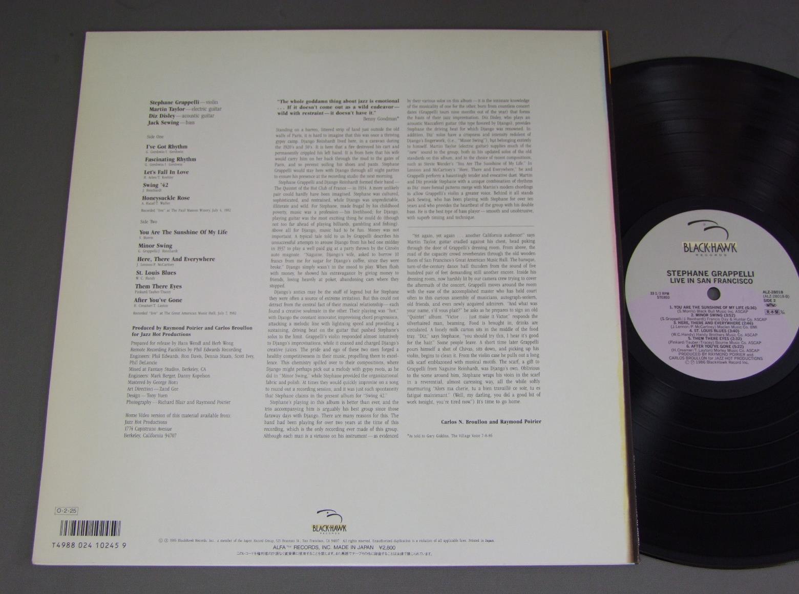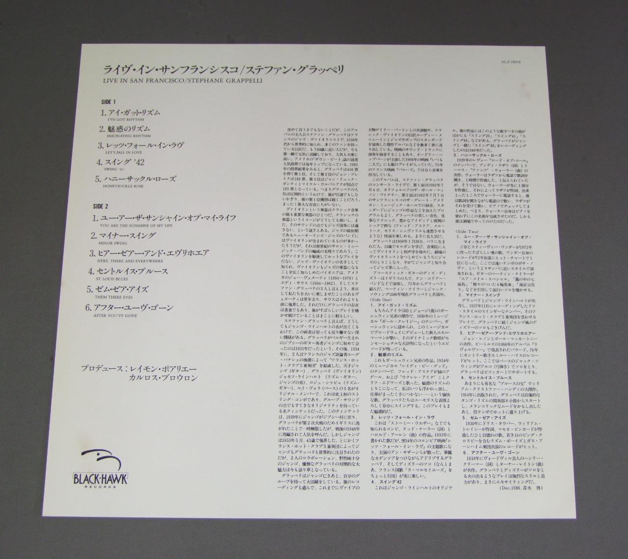 STEPHANE GRAPPELLI/LIVE IN SAN FRANCISCO ALZ28018 製造国:日本盤 / Media:LP外観:EX盤の状態:EX+ 価格(税込):¥1,320(売約済) 送料 7inch:定形外郵便 360円~LP:定形外郵便 660円~送料は、注文の最終画面で確認頂けます。 > > STEPHANE GRAPPELLI/LIVE IN SAN FRANCISCO 外観 (EX)特記事項:ジャケ周辺部に多少日焼け感軽有り。外観EXの共通説明:ダメージが限定的。中古品としては保存状態がよい方。シミ、ヨゴレ、スレ 少し~軽度。 盤の状態 (EX+)特記事項:極薄いスリキズ・スレ少し。一見してきれいな状態です。盤EX+の共通説明:盤面の極薄いスリキズ、スレ少し程度 音に出そうなものは無いように見える(極軽微なソフトティック音は除く)。 その他:見本盤 Tweet それぞれの画像をクリックすると、大きい写真が見られます こちらの商品もお勧めです 1,210円 SONNY ROLLINS / PLAYS 770円 MATT DENNIS & RED NORVOマット・デニス & レッド・ノーヴォ / SOME OF MY FAVORITESサム・オブ・マイ・フェイバリッツ 880円 NEWPORT ALL STARSニューポート・オールスターズ / TRIBUTE TO DUKE ( LIVE IN BASEL SWISS 1969 OCT )デューク・エリントンに捧ぐ 990円 STANLEY JORDAN / MAGIC TOUCH 770円 JOHN KLEMMERジョン・クレマー / LIFESTYLEライフスタイル 1,320円 BUD POWELLバド・パウエル / BUD POWELL TRIOバド・パウエル トリオ 990円 MODERN JAZZ QUARTETモダン・ジャズ・クワルテット / IN MEMORIAMイン・メモリアル 1,650円 TATSUYA TAKAHASHI&TOKYO UNION ORCH.高橋達也と東京ユニオン / SWING ON SWINGスイング・オン・スイング