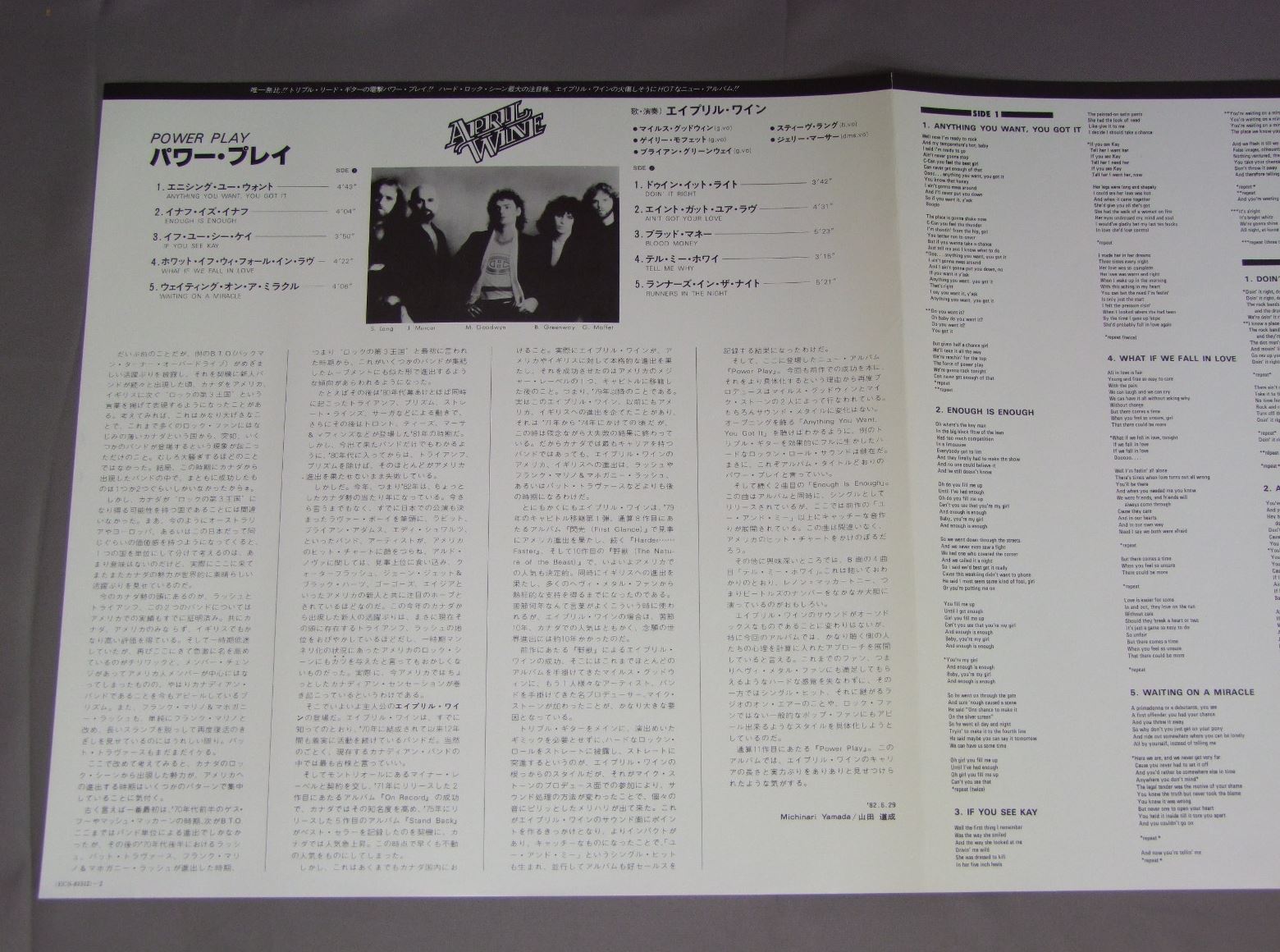 AIPRIL WINEエイプリル・ワイン/POWER PLAYパワー・プレイ ECS81512 製造国:日本盤 / Media:LP外観:EX+盤の状態:EX+帯:EX 価格(税込):¥2,620(売約済) 送料 7inch:定形外郵便 360円~LP:定形外郵便 660円~送料は、注文の最終画面で確認頂けます。 > > AIPRIL WINE/POWER PLAY 外観 (EX+)特記事項:特記なし。外観EX+の共通説明:中古としては美品、一見してきれいでダメージが軽微。シミ、ヨゴレ、スレ有っても僅か~少し。 盤の状態 (EX+)特記事項:極薄いスリキズ・スレ少し。一見してきれいな状態です。盤EX+の共通説明:盤面の極薄いスリキズ、スレ少し程度 音に出そうなものは無いように見える(極軽微なソフトティック音は除く)。 帯の状態 (EX):裏側に多少日焼け感有り。 Tweet それぞれの画像をクリックすると、大きい写真が見られます こちらの商品もお勧めです 770円 TED NUGENTテッド・ニュージェント / DOUBLE LIVE GONZO絶叫のライブ・ゴンゾー 770円 HAGAR SCHON AARONSON HRIEVEヘイガー、ショーン、アローソン、シュリーヴ / THROUGH THE FIRE炎の饗宴 1,320円 MICHAEL SCHENKER GROUPマイケル・シェンカー・グループ / 1st ALBUM神(帰ってきたフライング・アロウ 660円 NIGHT RANGER / MIDNIGHT MADNESS + BOOKMIDNIGHT MADNESS + BOOK付 660円 ANGELエンジェル / ANGEL 990円 ANGELエンジェル / ANGEL天使の美学 770円 MONEYマネー / FIRST INVESTMENT誘惑の掟 770円 IAN GILLAN BANDイアン・ギラン・バンド / LIVE AT THE BUDOKAN VOL2ライブ・イン・ジャパン VOL2